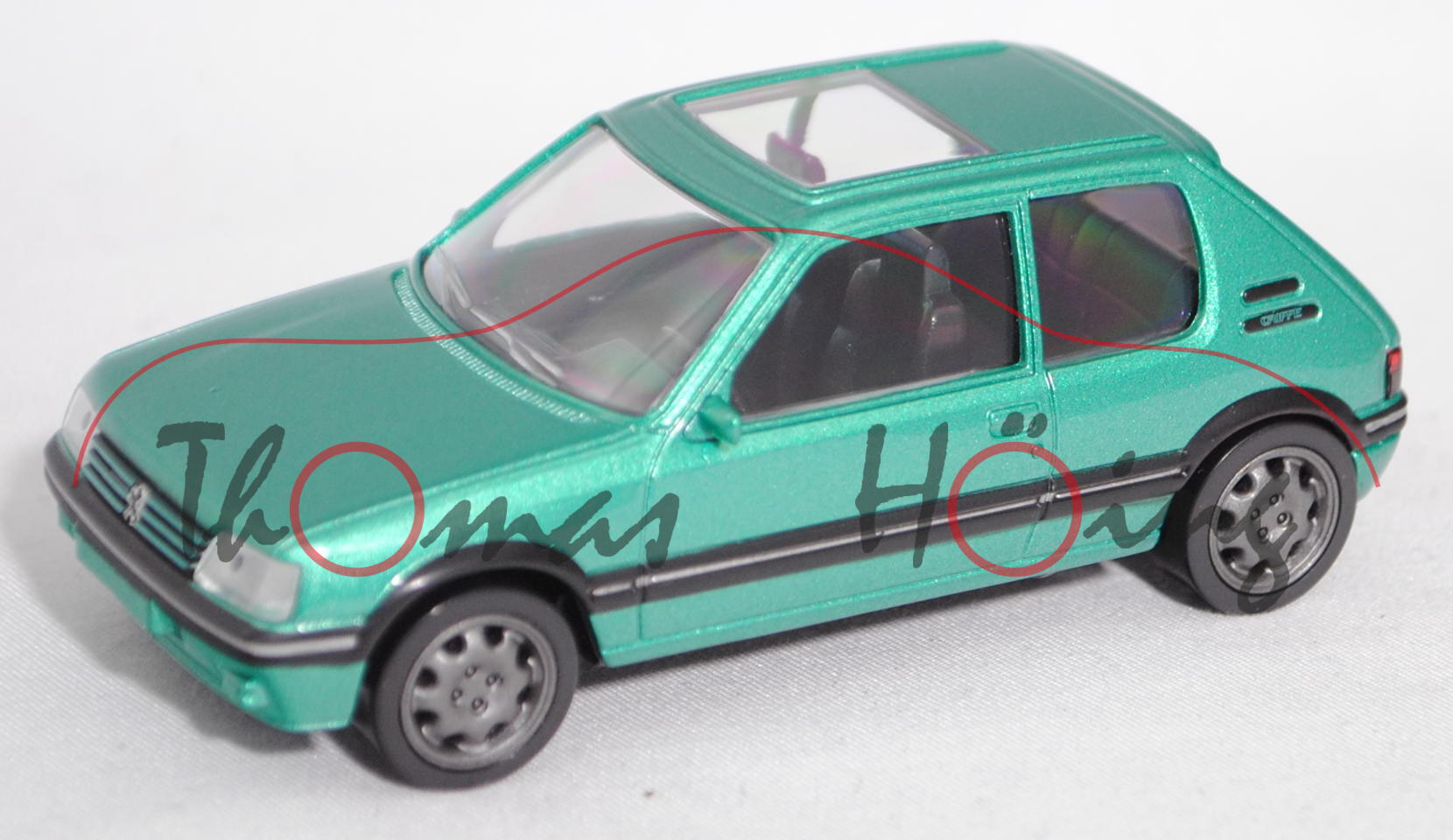 471717 Peugeot 205 GTI Griffe (2. Facelift 1990, Blinker vorne weiß, Sondermodell ab 1989 in limitierter Auflage von 3000 Stück wobei 1000 Stück für den französischen Markt waren, mit Panoramadachdach, Motor: Peugeot Typ XU 9 JA Vierzylinder-Reihen-Viertakt-Otto ohne Katalysator mit 1905 cm³ und 128 PS, Radstand 2420 mm, Länge 3705 mm, Modell 1984-1990), vert fluorite metallic (Farbcode M0SS, hell-minzgrünmetallic), innen schwarz, Sitze schwarz, Lenkrad schwarz, Felgen Speedline SL 299 15'' 6x15 mit Lochkreis 4 x 108 und Reifen 185/55 VR 15, Norev Jet-car / Youngtimers, 1:43, mb (EAN 3551094717178)