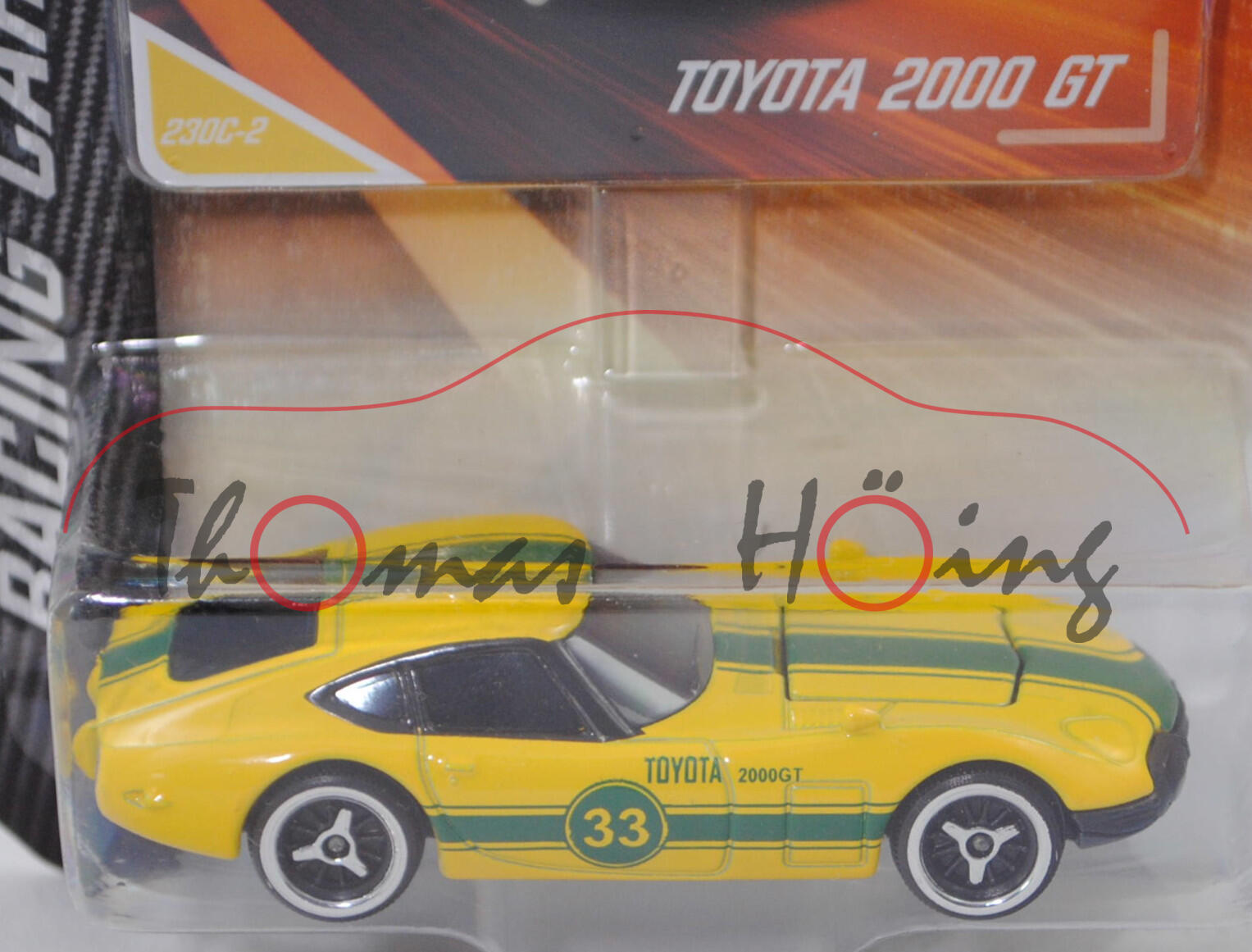 212084009 Toyota 2000 GT (Baureihe MF-10, zweitüriger Sportwagen als Coupé mit 2 Sitzplätzen, Vorfacelift, neben dem Kühlergrill große Frontscheinwerfer, kleine Blinker hinten auf den Kotflügeln, Dachpartien über Fahrer und Beifahrer ausgewölbt (Double-Bubble-Dachform), Entwicklung in Zusammenarbeit mit Yamaha Motor Company in Hamamatsu, Produktion bei Yamaha in Iwata, Hinterradantrieb, Motor: Yamaha auf Basis Toyota Typ 3M wassergekühlter Sechszylinder-Reihen-Viertakt-Otto mit doppelter obenliegender Nockenwelle (DOHC = Double Overhead Camshaft) und Solex Flachstromvergaser sowie 1988 cm³ und 150 PS, Radstand 2330 mm, Länge 4175 mm, Modell 1967-1969) (Nr. 230C), verkehrsgelb (vgl. ähnlich bellatrix yellow beim Original, Farbcode 1429), innen schwarz, Sitze schwarz, Lenkrad schwarz, Druck TOYOTA 2000GT und Streifen in opalgrün auf den Seiten wobei 33 in Wagenfarbe durchschimmert, Druck Streifen in opalgrün längs über das Fahrzeug, Motorhaube zu öffnen, 12-Speichen-Felge in schwarz mit Schnellverschluss und Felgenrand in chrom (Toyota Magnesiumräder Größe 6 J x 15 mit Radzierkappen / Nabendeckel und Reifen 165 HR 15), mit Sammelkarte, Modell-Nr. 230C-2, majorette, 1:56, Blister (RACING CARS) (EAN 3467452037928)