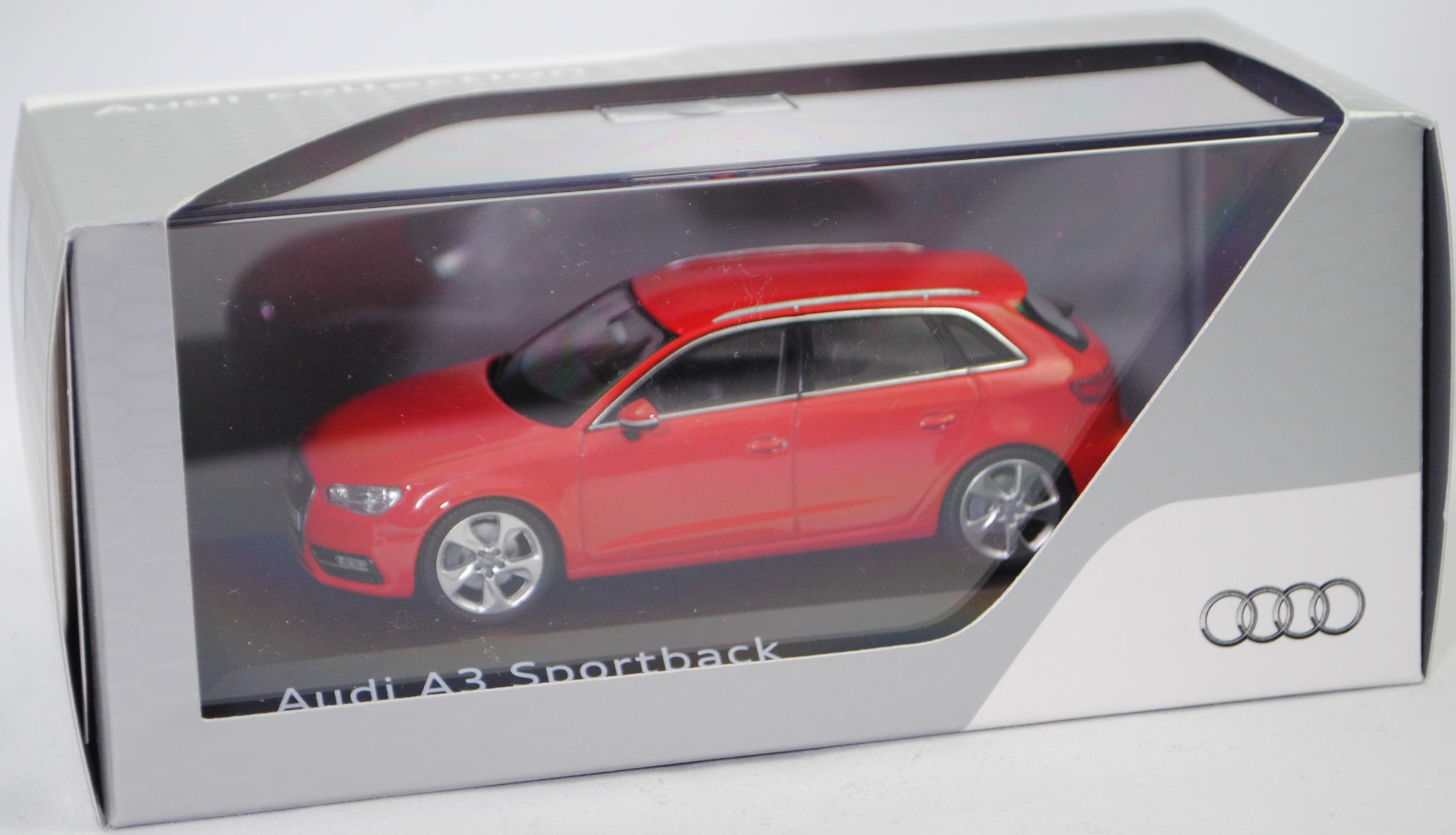 5011303023 Audi A3 Sportback 1.4 TFSI / 1.4 TFSI cod / 1.8 TFSI / 2.0 TDI / 2.0 TDI clean diesel Ambiente (3. Generation, Baureihe A3 Sportback, interne Baureihenbezeichnung 8VA, fünftürige Schräghecklimousine mit 5 Sitzplätzen, Vorfacelift, Frontscheinwerfer unten im Außenbereich leicht abgerundet, Singleframe-Kühlergrill mit 7 Einzellamellen und an den oberen Ecken leicht abgeschrägt, Stoßfänger vorne mit Lüftungsöffnungen auf Scheinwerferbreite im Außenbereich und mittig unten mit trapezförmiger Lüftungsöffnung, schmale rechteckige Rückfahrscheinwerfer im hervorstehenden Teil der Heckklappe außen über dem Nummernschild positioniert, Stoßfänger hinten mit umlaufender Sicke im unteren Bereich und ohne Rückstrahler, Ausstattungslinie Ambiente: Halogen Frontscheinwerfer + Lichtpaket + Normalsitze vorne + Make-up-Spiegel für Fahrer und Beifahrer beleuchtet + Lederlenkrad im 4-Speichen-Design + Mittelarmlehne vorne + Sitzbezüge Stoff Regatta/mono.pur + Dekoreinlagen in Türverkleidungen und Schalttafel 3D-Optik Luv + Glanzpaket mit Dachzierleisten sowie Seitenscheibenumfassung und Fensterschachtleisten in Aluminium eloxiert + Geschwindigkeitsregelanlage + Einparkhilfe hinten + Auspuff Endrohrblenden verchromt, Sonderausstattung gegen Mehrpreis: Nebelscheinwerfer + Audi Aluminium-Gussräder 18 Zoll im 5-Arm-Dynamik-Design anthrazit teilpoliert, 6-Gang-Schaltgetriebe, Frontantrieb, Motor mit 2 Abgasendrohren links: Audi Typ VW EA211 wassergekühlter Vierzylinder-Reihen-Viertakt-Turbo-Otto mit Direkteinspritzung und zwei obenliegende Nockenwellen (DOHC = Double Overhead Camshaft) sowie 4 Ventile pro Zylinder und 1395 cm³ sowie 122 PS (1.4 TFSI, Motorkennbuchstabe CMBA / CXSA) / Audi Typ VW EA211 wassergekühlter Vierzylinder-Reihen-Viertakt-Turbo-Otto mit Direkteinspritzung und zwei obenliegende Nockenwellen (DOHC = Double Overhead Camshaft) sowie 4 Ventile pro Zylinder und 1395 cm³ sowie 140 PS (1.4 TFSI cod (cylinder on demand), Motorkennbuchstabe CPTA) / Audi Typ VW EA888 wassergekühlter Vierzylinder-Reihen-Viertakt-Turbo-Otto mit Benzindirekteinspritzung und zwei obenliegende Nockenwellen (DOHC = Double Overhead Camshaft) sowie 4 Ventile pro Zylinder und Ladeluftkühler sowie 1798 cm³ und 180 PS (1.8 TFSI, Motorkennbuchstabe CJSA / CJSB) / Audi Typ VW EA288 wassergekühlter Vierzylinder-Reihen-Viertakt-Turbo-Diesel mit Common-Rail-Einspritzung und zwei obenliegende Nockenwellen (DOHC = Double Overhead Camshaft) sowie 4 Ventile pro Zylinder und Ladeluftkühler sowie 1968 cm³ und 150 PS (2.0 TDI, Motorkennbuchstabe DBGA / DEJA / CRLB / DCYA) / Audi Typ VW EA288 wassergekühlter Vierzylinder-Reihen-Viertakt-Turbo-Diesel mit Common-Rail-Einspritzung und zwei obenliegende Nockenwellen (DOHC = Double Overhead Camshaft) sowie 4 Ventile pro Zylinder und Ladeluftkühler sowie 1968 cm³ und 184 PS (2.0 TDI clean diesel, Motorkennbuchstabe CUPA / CUNA), Radstand 2636 mm, Länge 4310 mm, Modell 2013-2016), misanorot perleffekt (Verkaufskennzeichen N9, Lacknummer LZ3M), innen schwarz, Sitze schwarz, Lenkrad schwarz, Audi Aluminium-Gussräder 18 Zoll im 5-Arm-Dynamik-Design anthrazit teilpoliert Größe 7,5 J x 18 H2 ET 51 mit Lochkreis 5 x 112 (Teilenummer 8V0 601 025 CC, Farbcode JG3/K80 kontrastgrau, teilpoliert) und Nabendeckel / Radzierkappe (Teilenummer 4F0 601 165 N, Farbcode grau) sowie Reifen 225/40 ZR 18 92Y, Schuco, 1:43, PC-Box Werbeschachtel (Limited Edition quattro GmbH 85045 Ingolstadt, Audi collection) (Vitrinenmodell, Schachtel mit Lagerspuren) (EAN 2160000008715)