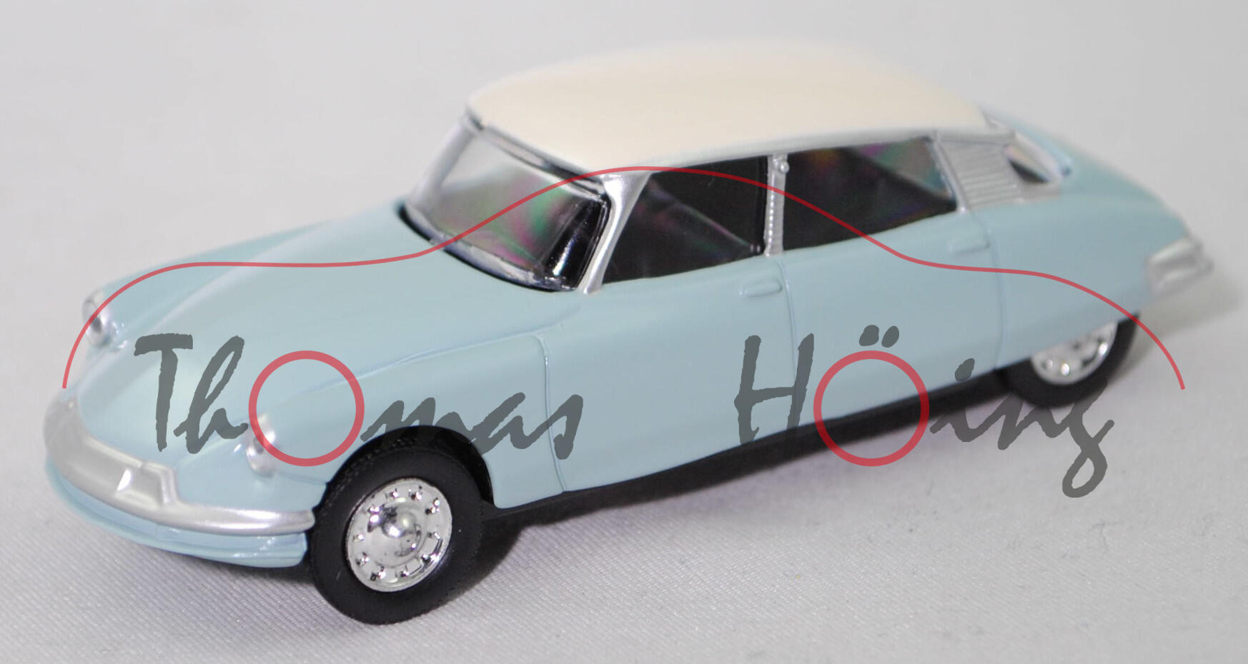 319351 Citroen DS 19 (1. Generation D-Modelle, DS = Distinctife Series, auch Die Göttin genannt, viertürige Limousine mit Fließheck (Berline) und 5 Sitzplätzen, Frontschürtze in Wagenfarbe lackiert und ohne seitliche Alukaschierung, ohne Zierleiste auf der Frontschürze (1. Front, 2. Version), außen aufgesetzte Rückstrahler hinten auf den Stirnseiten der Kotflügel, Doppelrohrauspuff nach links hinten abgeknickt, Vorderradantrieb, Motor: Citroen wassergekühlter Vierzylinder-Reihen-Viertakt-Otto mit Weber 24/30 DCZC 1 Vergaser und OHV-Ventilsteuerung (OHV = overhead valves) sowie 2 Ventile pro Zylinder und 1911 cm³ sowie 75 PS, Radstand 3125 mm, Länge 4800 mm, Modell 1957-1959, Baujahr 1958), Karosserie hell-pastelltürkis (vgl. ähnlich bleu turquoise beim Original, Farbcode AC137), Dach perlweiß (vgl. ähnlich polyester translucide beim Original), innen schwarz, Sitze schwarz, Lenkrad schwarz, Felgen chrom (MICHELIN X Reifen vorne 165x400 und hinten 155x400), Norev CLASSIC Sortiment, 1:58, mb (EAN 3551093193515)