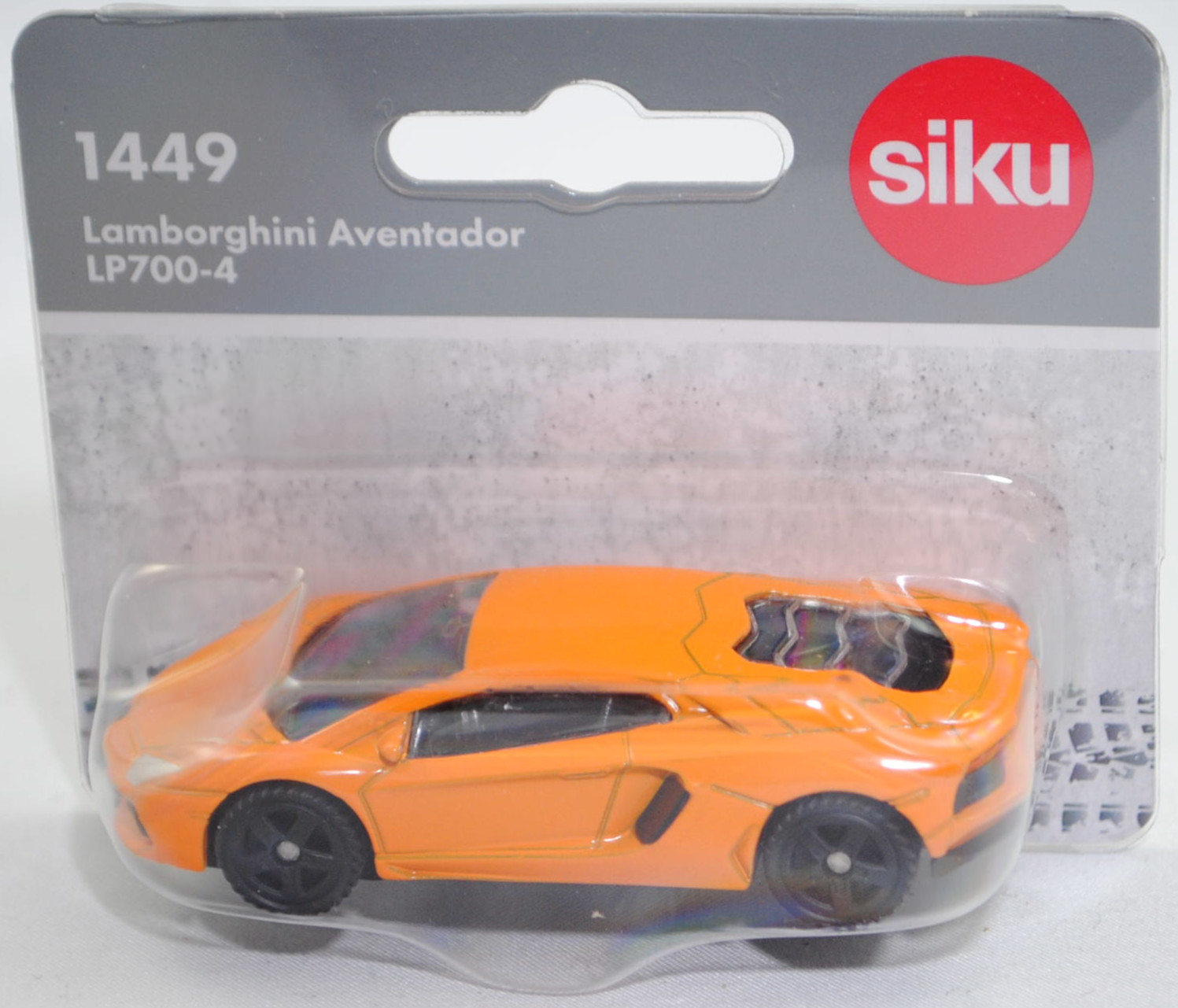 1449.1 00004a Lamborghini Aventador LP 700-4 (1. Generation, Baureihe Aventador, interne Baureihenbezeichnung LB834, KBA Herstellerschlüssel 4026, Typ Coupé, zweitüriger Sportwagen als Coupé mit 2 Sitzplätzen, serienmäßig mit Scherentüren wie bei den 12-Zylinder-Modellen von Lamborghini üblich, Vorfacelift, Stoßfänger vorne mit 3 separaten Lufteinlässen, Stoßfänger hinten zwischen den schwarzen Lüftauslässen in Wagenfarbe lackiert, zulässiges Gesamtgewicht 1800 kg (2011-2012) bzw. 2000 kg (2012-2016), Haldex-Allradantrieb, Motor: Lamborghini Typ L539 wassergekühlter Zwölfzylinder-V-Viertakt-Otto mit Saugrohreinspritzung und zwei obenliegende Nockenwellen (DOHC = Double Overhead Camshaft) je Zylinderbank sowie 4 Ventile pro Zylinder und 6498 cm³ sowie 700 PS, Abgasnorm Euro 5 (2011-2012) bzw. Euro 6 (2012-2016), Radstand 2700 mm, Länge 4780 mm, Modell 2011-2016), hell-tieforange, innen schwarzgrau, Sitze schwarzgrau, Lenkrad schwarzgrau, Frontscheinwerfer integriert und silber bedruckt, Scheibenwischer links angeschlagen, Druck Rückleuchten rot, Chassis schwarz, Bpr. siku-Logo unter der Vorderachse und CE-Zeichen dahinter sowie Adresse mittig, Druck Chargennummer auf dem Chassis, B47 geschlossen schwarz (Lamborghini Aluminiumfelgen Typ IPERIONE im 5-Arm-Design in silber vorne Größe 9 J x 19 ET 32 mit Lochkreis 5 x 112 (Teilenummer 470 601 017, Farbcode silber glänzend) und Nabendeckel / Radzierdeckel (Teilenummer 470 601 147, Farbcode schwarz mit goldenem Lamborghini-Emblem) sowie Pirelli P ZERO™ Reifen 255/35 ZR 19 96Y bzw. hinten Größe 12 J x 20 ET 57 mit Lochkreis 5 x 120 (Teilenummer 470 601 017 A, Farbcode silber glänzend) und Nabendeckel / Radzierdeckel (Teilenummer 470 601 147, Farbcode schwarz mit goldenem Lamborghini-Emblem) sowie Pirelli P ZERO™ Reifen 335/30 ZR 20 104Y), SIKU SUPER, ca. 1:60, P29f (EAN 4006874014491)