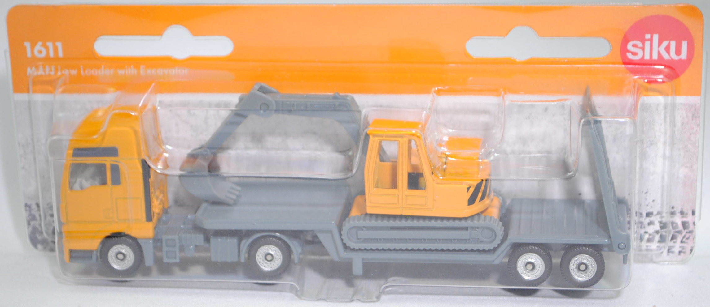1611.4 00010 MAN TGX 26.580 D38 XXL 4x2 (1. Generation, Baureihe TGX, Fahrerhaus XXL, Facelift 2017, Fahrerhaus vorne mit Chromspange und Löwe auf schwarzem Grund, 2 zusätzliche Kühlrippen zwischen den Frontscheinwerfern, Hinterradantrieb, Motor: MAN Typ D3876 wassergekühlter Sechszylinder-Reihen-Viertakt-Turbo-Diesel mit Bosch Common-Rail-Hochdruckeinspritzung und eine obenliegende Nockenwelle sowie 4 Ventile pro Zylinder und Ladeluftkühlung sowie 15248 cm³ und 580 PS, Radstand 3600 mm, Länge 5875 mm, Modell 2017-2019) Sattelzugmaschine mit 2-Achs-Tiefbett Sattelauflieger (Typ Tieflader mit gekröpftem Tiefbett) und Ladegut Bagger, Sattelzugmaschine: Fahrerhaus und Stoßstange vorne chromgelb, innen lichtgrau, Sitze lichtgrau, Lenkrad integriert, Radkästen und Fahrgestell hell-blaugrau, Chassis hell-blaugrau mit Schalldämpfer der Auspuffanlage auf der rechten Seite hinter dem Fahrerhaus in weißaluminiummetallic und AHK (Anhängerkupplung), Bpr. mit Adresse hinter der Vorderachse, Druck Teil der Chargennummer unter der Vorderachse auf dem Chassis, Bpr. CE-Zeichen mittig auf der linken Seite und siku unter der Hinterachse, C36, ca. 1:87; Sattelauflieger: Tieflader hell-blaugrau, zweispurige Rampe mit Querstrebe am oberen Ende, Längsträger auf der Unterseite der Ladefläche nach innen versetzt, Achshalterung beim Auflieger mit Versprung unter jeder Achse, Bpr. Adresse auf der linken Seite neben dem Längsträger und CE-Zeichen mittig sowie siku-Logo dahinter, Druck Teil der Chargennummer mittig vorne auf dem Tiefbett, Prägung Made in China unter der Chargennummer, C36; Ladegut: Bagger chromgelb, Fensterrahmen der Kabine 1,5 mm dick, Monoblockausleger und Löffelstiel mit Tieflöffel dunkel-silbergrau, Druck Streifen in schwarz auf dem Heck, Unterwagen oben chromgelb und unten dunkel-silbergrau, Laufwerk mit 8 Stützrollen, Treibrad hinten mit deutlich geprägten Zähnen, Raupenfahrwerk dunkel-silbergrau, Bpr. siku mittig auf der linken Seite zwischen den Rädern und CE-Zeichen auf der rechten Seite zwischen den Rädern sowie Adresse mittig zwischen den Vorderrädern, Druck Chargennummer mittig zwischen den Hinterrädern, Prägung Made in China unter der Chargennummer, Räder schwarz, SIKU SUPER, P29f (EAN 4006874016112)