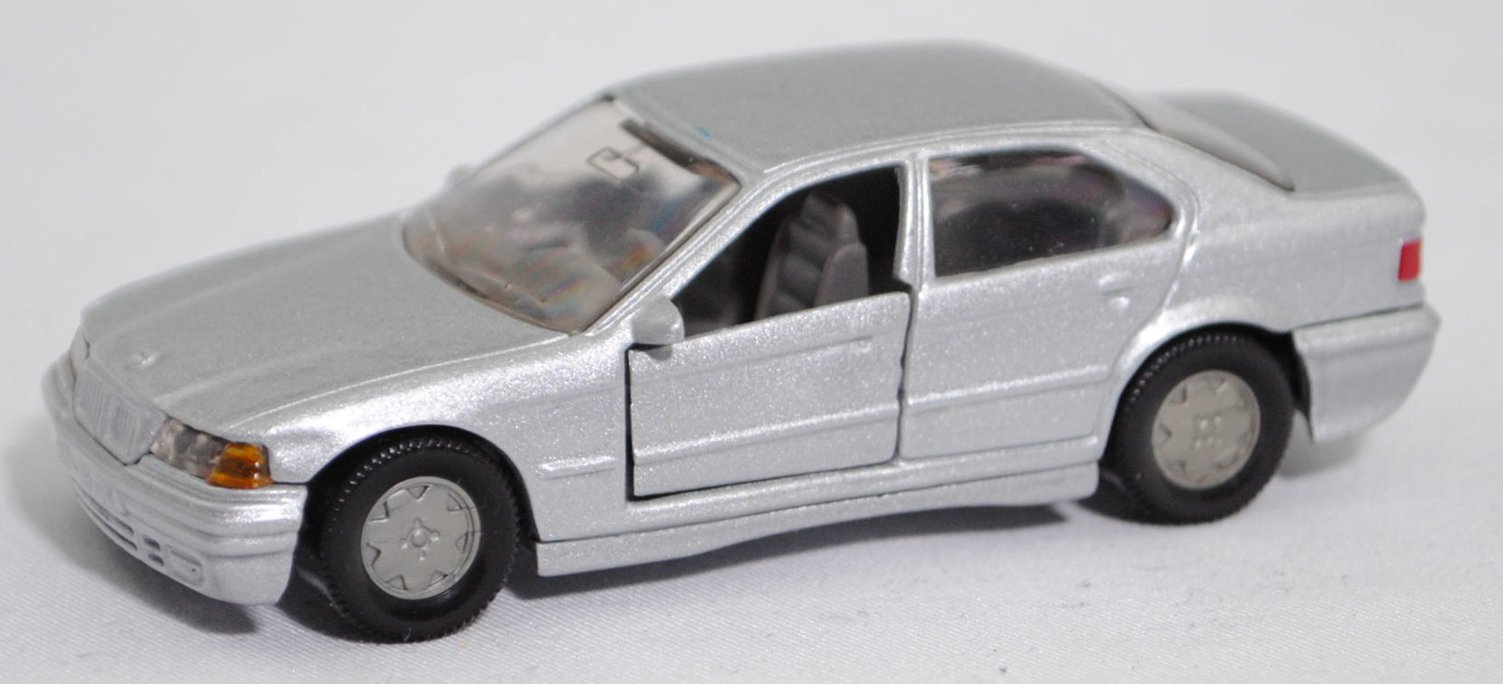 1028.2 00001 BMW 325i Limousine (3. Generatiom 3er-Reihe, Baureihe 3er-Reihe, interne Baureihenbezeichnung E36, viertürige Stufenheck-Limousine mit 5 Sitzplätzen, Vorfacelift (bei BMW Vor-LCI = vor Lifecycle Impulse genannt), Frontscheinwerfer und Außenspiegel ohne Noppen an der Oberseite, Blinker vorne und hinten hinter gelber Verglasung, ohne Seitenblinker im vorderen Kotflügel, Ausstattungslinie 325i Limousine: Nebelscheinwerfer + Anti-Blockier-System (ABS) + Zentralverriegelung mit Diebstahlsicherung und Crash-Sensor + drehzahlabhängig geregelte Servolenkung + Drehzahlmesser mit Energy-Control + Sechszylinder Motor mit 2494 cm³ und 192 PS + Auspuffanlage mit 2 Katalysatorsträngen in paralleler Monolith-Anordnung und ovale Doppel-Endrohre + Leichtmetall-Gußräder Styling Typ Styling 6, 5-Gang-Schaltgetriebe, Hinterradantrieb, Motor: BMW Typ M50B25 wassergekühlter Sechszylinder-Reihen-Viertakt-Otto mit sequentielle Mehrpunkt-Saugrohreinspritzung und zwei obenliegende Nockenwelle (DOHC = Double Overhead Camshaft) sowie 4 Ventile pro Zylinder und 2494 cm³ sowie 192 PS, Radstand 2700 mm, Länge 4433 mm, Modell 1990-1992), silbergraumetallic (vgl. sterlingsilber metallic beim Original, Farbcode 244), innen staubgrau, Sitze staubgrau, Lenkrad staubgrau, separat eingesetzte transparente klare Frontscheinwerfer, separat eingesetzte gelbe Blinker vorne, Heckleuchten rot lackiert, Chassis silbergraumetallic, Bpr. BMW 320i incl. einiger technischer Daten, mit CE-Zeichen, B6 (BMW Leichtmetall-Gußräder Styling Typ Styling 6 im 15-Loch-Design Größe 7 J x 15 ET 47 mit Lochkreis 5 x 120 (Teilenummer 36 11 1 180 447) und Nabenabdeckung mit Chromrand (Teilenummer 36 13 6 783 536) sowie Reifen 205/60 R 15 91V), SIKU SUPER, ca. 1:55, m (Vitrinenmodell) (EAN 4006874010288)