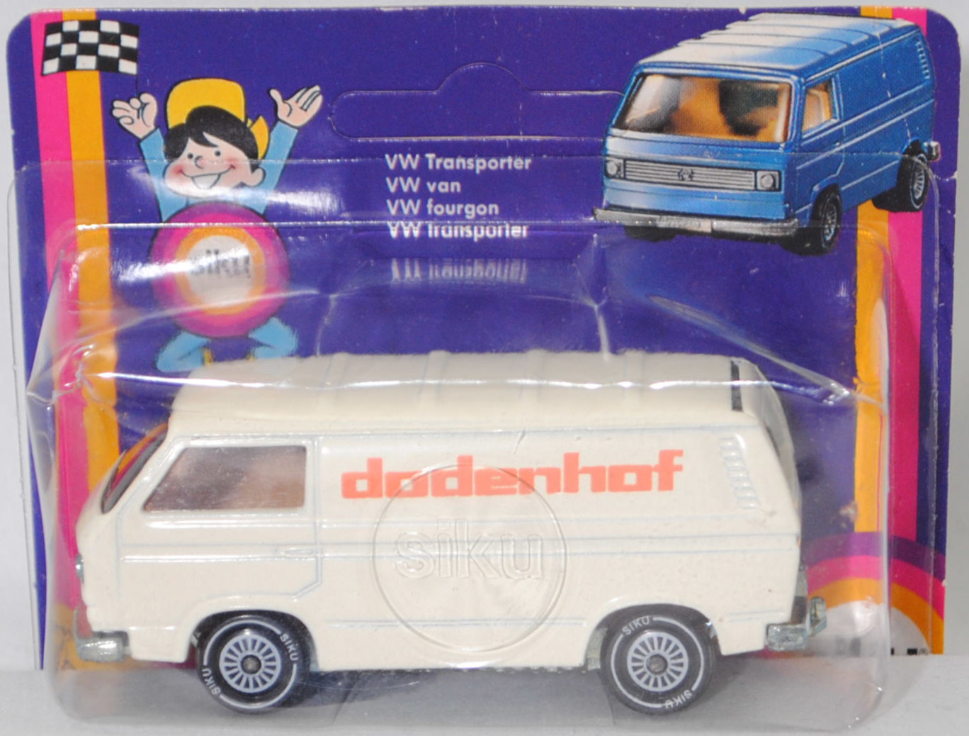 1331.2 VW Transporter Kastenwagen 2,0 Liter (3. Generation, Baureihe Transporter, interne Baureihenbezeichnung Typ 2 Transporter 3 (T3, Modell '80), interne Konstruktionsbezeichnung der Baureihe EA 162, oder auch Bulli genannt, Typ 251 Kastenwagen mit geschlossenem Aufbau, viertüriger Kleintransporter als Kastenwagen mit 2 Sitzplätzen, Vorfacelift, Kühlergrill nur zwischen den Scheinwerfern, Lufteinlässe hinten auf den Seiten aus Blech in Wagenfarbe lackiert, Schriftzüge auf flacher schwarzer Platte mit silbernem Schriftzug, Ausstattungslinie Kastenwagen 2,0 Liter: zwei Rückblickspiegel + Trittstufen im Fahrerhaus + zweisitziges Fahrerhaus mit Durchgang zum Laderaum + Kunstledersitzbezüge + volle Kunststoffauskleidung im Fußraum mit Kunststofffolie, Fußboden mit wärmeisolierenden Gummimatten ausgelegt + Sicherheitstürverriegelung + Kleiderhaken + Zuziehgriffe + Beifahrerhaltegriff + Ablagekasten + blendfreie und gepolsterte Abdeckung der Armaturentafel + Scheibenwischer mit Zweistufen-Schaltung + Ladeboden aus Stahl + Seitenwände innen mit Verstärkungsprofil + seitliche Schiebetür auf der rechten Seite + nach oben öffnende selbstfeststellende Heckklappe + Innenleuchte Fahrerhaus mit Türkontaktschalter + Innenleuchte Laderaum mit Schiebetürkontaktschalter + Motor mit 1970 cm³ und 70 PS, Sonderausstattung gegen Mehrpreis: Anhängevorrichtung (AHK), zulässiges Gesamtgewicht 2360 kg, vollsynchronisiertes 4-Gang-Schaltgetriebe, Heckantrieb, Motor: VW Typ-4 luftgekühlter Vierzylinder-Boxer-Viertakt-Otto mit zwei Solex Fallstromvergaser 34 PDSIT-2/-3 und eine zentrale Nockenwelle sowie 2 Ventile pro Zylinder und 1970 cm³ sowie 70 PS, Motorkennbuchstabe CU, Radstand 2460 mm, Länge 4570 mm, Modell 1979-1982), cremeweiß, innen dahliengelb, Sitze dahliengelb, Lenkrad integriert, Druck dodenhof in hellrotorange auf den Seiten, W-Germ, Chassis chrom, ohne CE-Zeichen, Verglasung rauch, R11 glatt (VW Stahlfelgen im 20-Loch-Design Größe 5,5 J x 14 H1 ET 39 mit Lochkreis 5 x 112 (Teilenummer 211 601 027 H, chromfarbig) und Gürtelreifen 185 SR 14 sowie Radzierkappe (Ø 256 mm, Teilenummer 251 601 151 A, verchromt)), SIKU SUPER, ca. 1:60, P18 (Limited Edition) (Vitrinenmodell, Schachtel mit Lagerspuren) (EAN 4006874013319)