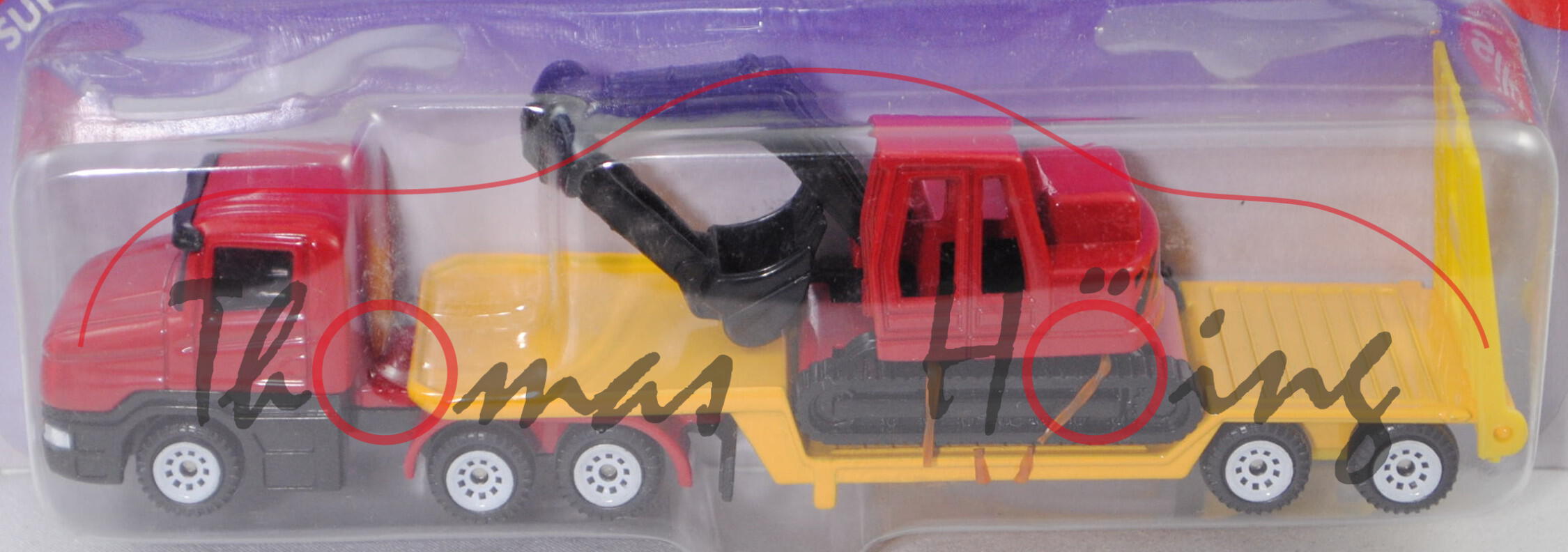 1611 00000c Scania CT14 (Typ Serie 4, T-Fahrerhaus, Basis, Modell 1995-2004) Tieflader mit Bagger, signalrot/signalgelb, innen schwarz, Lenkrad integriert, Bagger signalrot, C1 weiß, SIKU SUPER, P26 (Schachtel offen) (EAN 4006874016112)