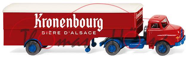 051322 SAVIEM H32 Kurzhauber Sattelzugmaschine (Modell 1969-1977, vgl. MAN Ponton-Kurzhauber (2. Generation, Modell 1969-1994) Koffersattelzug, Sattelzugmaschine: rot, Fahrgestell enzianblau, innen umbragrau, Felgen enzianblau; Sattelauflieger: Koffer rot, Dach des Koffers weiß, Kronenbourg / BIERE D'ALSACE, Felgen enzianblau, Wiking, 1:87, mb (EAN 4006190513227)