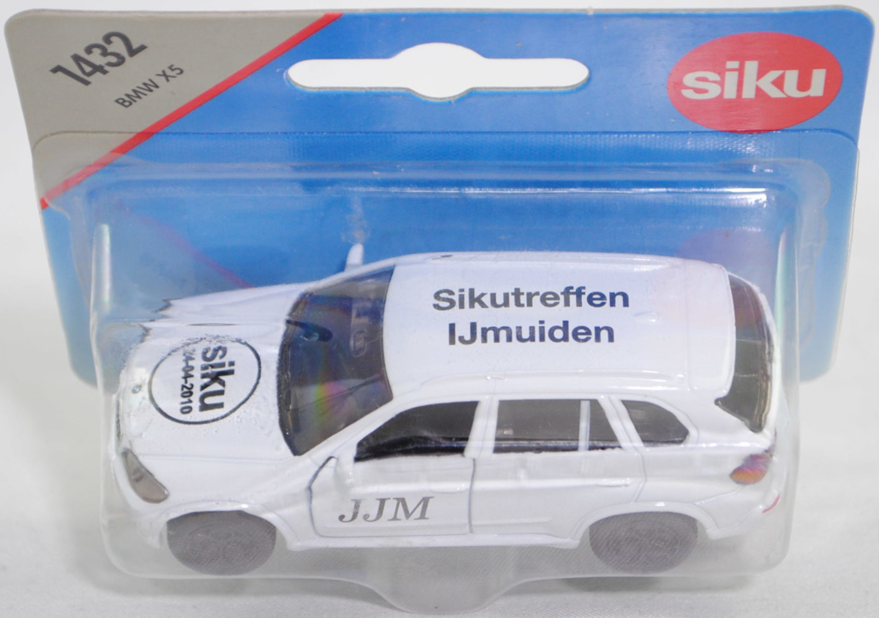 1432.1 00001 JJM BMW X5 3.0si / xDrive30i (2. Generation, Baureihe X5, interne Baureihenbezeichnung E70, fünftüriges Sport Utility Vehicle (SUV) mit 5 Sitzplätzen, Vorfacelift (vor LCI = vor Life Cycle Impulse bzw. vor Modellpflegemaßnahmen), Frontziergitter mit Nieren-Längsstreben in schwarz mit Chromeinfassung, Front- und Heckschürze nur im oberen Bereich in Wagenfarbe lackiert, breite flache Lüftungsöffnungen unten außen im Stoßfänger, mittlere Lüftungsöffnung im Stoßfänger nur bis auf halber Nummernschildhöhe geführt, runde Nebelscheinwerfer in trichterförmiger Aussparung im Stoßfänger, Stoßfänger hinten durchgehend ohne angedeuteten Diffusor, 2 runde Edelstahl-Auspuffendrohre je eins rechts und links, Ausstattungslinie 3.0si / xDrive30i: Halogen-Scheinwerfer + Nebelscheinwerfer + Frontziergitter mit Nieren-Längsstäben in schwarz, mit Chromeinfassung + Sechszylinder-Motor mit 2996 cm³ und 272 PS + 6-Gang-Automatic-Getriebe und elektronischem Gangwahlschalter inkl. Steptronic und adaptiver Getriebesteuerung + Außenspiegel asphärisch beheizt und elektrisch einstellbar + Innenspiegel automatisch abblendend + Interieurleisten Graphitan matt + Lederlenkrad im 3-Speichen Design mechanisch längs- und höhenverstellbar + Klimaautomatik + Sitzverstellung teilelektrisch für Fahrer und Beifahrer + Polsterung Stoff Twill + Fensterrahmenleiste in schwarz matt + Dachspoiler inkl. dritter Bremsleuchte + Heckklappe zweiteilig, Oberteil nach oben zu öffnen, Heckklappenunterteil manuell entriegelbar, Unterteil auf Ladekantenniveau abklappbar + Heckscheibenwischer + 2 Auspuffendrohre (je eins rechts und links), Edelstahl, rund + Leichtmetallräder Sternspeiche 209 Größe 8,5 J x 18 mit Reifen 255/55 R 18 Runflat, 6-Gang-Automatikgetriebe, Allradantrieb, Motor: BMW Typ N52B30 wassergekühlter Sechszylinder-Reihen-Viertakt-Otto mit Saugrohreinspritzung und zwei obenliegende Nockenwellen (DOHC = Double Overhead Camshaft) sowie 4 Ventile pro Zylinder und 2996 cm³ sowie 272 PS, Radstand 2933 mm, Länge 4854 mm, Modell 2006-2008 als X5 3.0si bzw. 2008-2010 als X5 xDrive30i), reinweiß (vgl. alpinweiß III beim Original, Farbcode 300), innen schwarz, Sitze schwarz, Lenkrad schwarz, Druck JJM in schwarz auf den vorderen Türen, Druck siku / 24-04-2010 im Kreis in schwarz und BMW-Logo in weiß/blau/schwarz auf der Motorhaube, Druck Sikutreffen / Ijmuiden in schwarz von links aus lesbar auf dem Dach, Druck X5 in silber und BMW-Logo in weiß/blau/schwarz auf der Heckklappe, Bpr. 1432 beim linken Vorderrad, Bpr. ohne Adresse, ohne Chargendruck auf dem Chassis, B41 schwarz (BMW Leichtmetallräder Sternspeiche 209 (5-Speichen-Design) Größe 8,5 J x 18 ET 46 mit Lochkreis 5 x 120 (Teilenummer 36 11 6 770 200, Farbe silber) und Nabenabdeckung (Ø 67 mm mit Chromrand, Teilenummer 36 13 6 783 536) sowie Reifen 255/55 R 18 109V Runflet), SIKU SUPER, ca. 1:58, P29a (Schachtel geklammert) (Limited Edition) (Vitrinenmodell, Schachtel mit Lagerspuren) (EAN 4006874014323)
