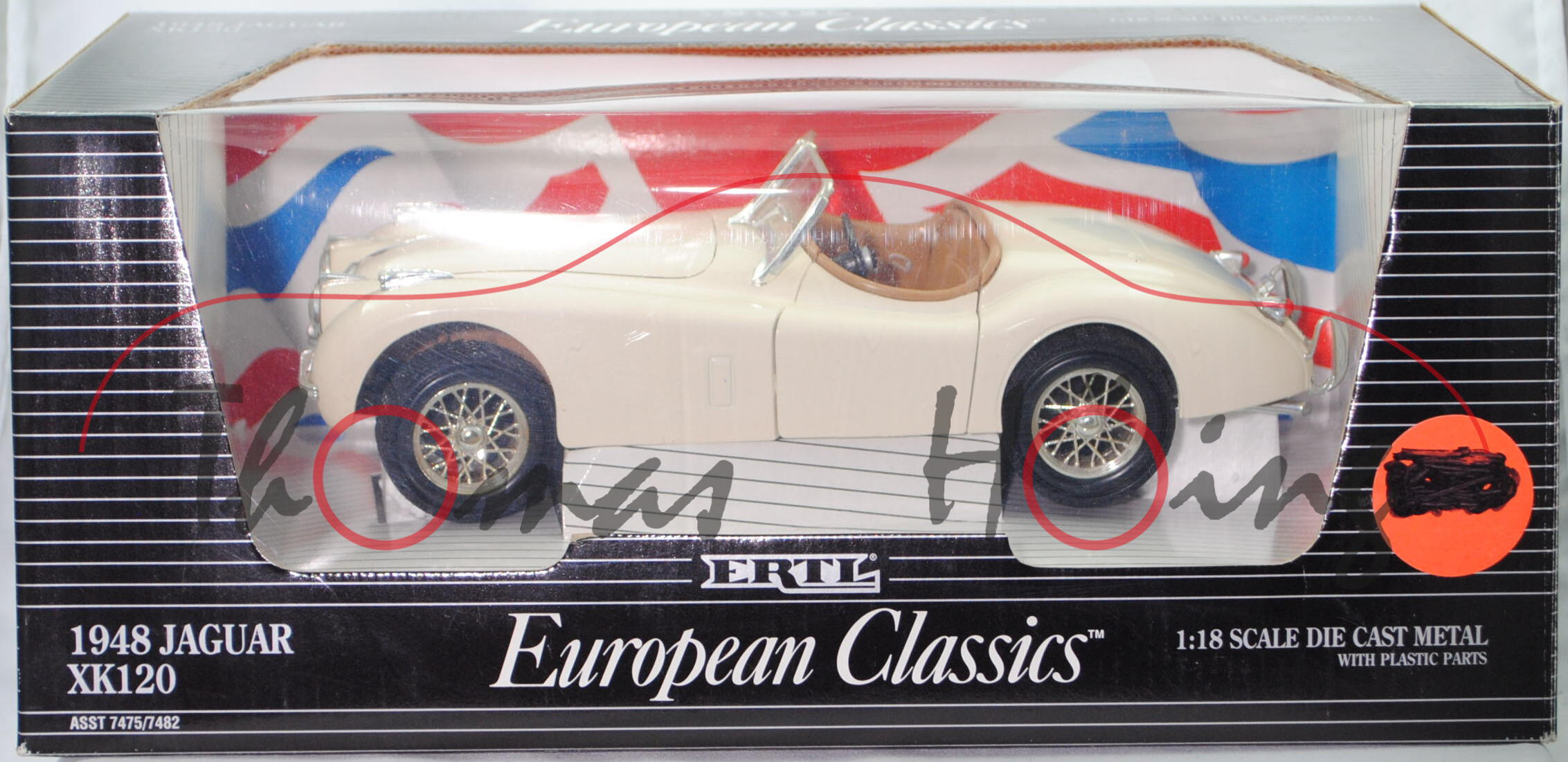Jaguar XK 120 OTS (Typ zweisitziger Roadster, OTS = Open Two-Seater, Frontscheinwerfer neben der Motorhaube in die Kotflügel integriert, Einrohr-Auspuffanlage, Hinterradantrieb: Motor: Jaguar wassergekühlter Sechszylinder-Reihen-Viertakt-Otto mit zwei obenliegenden Nockenwellen (DOHC = Double Overhead Camshaft) und 3442 cm³ sowie 160 PS, Radstand 2591 mm, Länge 4394 mm, Modell 1948-1954 (1948-1950 Karosserie aus Eschenholzgerippe mit Aluminiumblechen, 1950-1954 Karosserie aus Stahlblach), Baujahr 1948), perlweiß (vgl. old english white beim Original, Farbcode JA036), innen braunbeige, Sitze braunbeige, Lenkrad schwarz, Türen + Motorhaube zu öffnen, Vorderräder lenkbar, ohne Verkleidung der hinteren Radausschnitte (abnehmbare Wheel Spats bzw. Radhausverkleidungen), verchromte Speichenräder mit 60 Speichen Größe 5,0 x 16 und Zentralverschluss sowie DUNLOP Reifen 6.00x16, ERTL European Classics / DIE CAST METAL, 1:18, mb (Vitrinenmodell, Schachtel mit Lagerspuren) (EAN 036881074823)