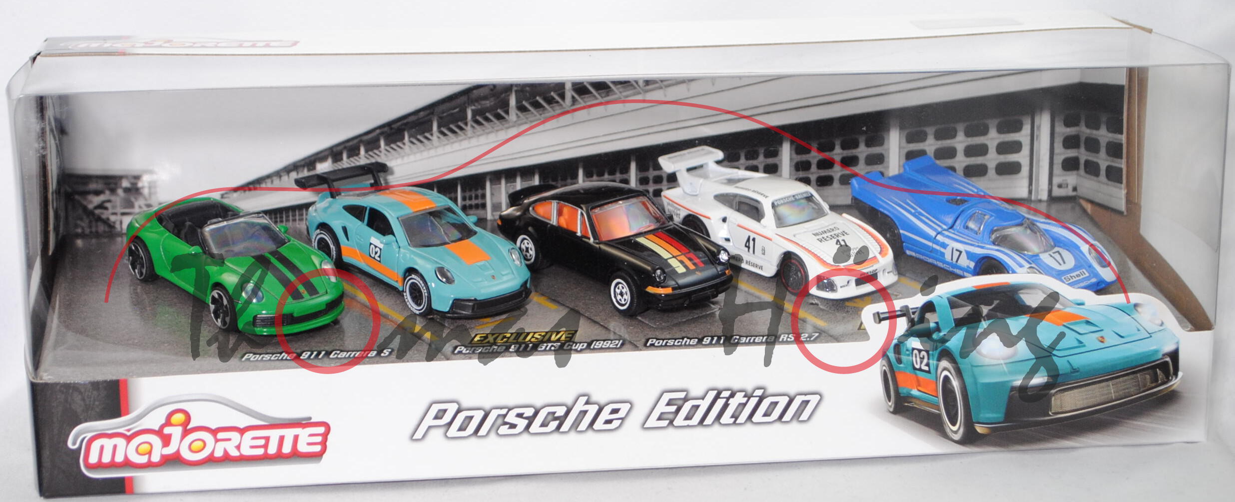 Porsche Edition (5 Modelle) bestehend aus: Porsche 911 Carrera S Cabriolet (8. Generation Porsche 911, Typ 992, zweitüriger Sportwagen als Cabriolet mit 4 Sitzplätzen, Ausstattungspaket Carrera S mit 4 Auspuffendrohren, Exterieur-Paket in schwarz (hochglanz) mit Frontspoiler und Lufteinlassblenden im Stoßfänger sowie Heckunterteil und SportDesign Schwellerverkleidungen schwarz lackiert, Heckantrieb, Motor: Porsche Typ EA9A2 evo wassergekühlter Sechszylinder-Boxer-Viertakt-Bi-Turbo-Otto mit Direkteinspritzung und zwei obenliegende Nockenwellen (DOHC = Double Overhead Camshaft) je Zylinderbank sowie 4 Ventile pro Zylinder und Ladeluftkühler sowie 2981 cm³ und 450 PS, Motorcode DKKA, Radstand 2450 mm, Länge 4519 mm, Modell 2019-) (Nr. 209M), signalgrün, innen schwarz, Sitze schwarz, Lenkrad schwarz, Dekorstreifen in schwarz auf dem Kofferraumdeckel, Kofferraumdeckel zu öffnen, 5-Speichen-Felge in schwarz/chrom (Porsche Leichtmetallräder im 10-Speichen-Design mit offenen Speichen Typ Carrera S vorne Größe 8,5 J x 20 ET 53 mit Lochkreis 5 x 130 (Teilenummer 992.601.025.C, Farbcode titan) und Nabendeckel / Radzierkappe (Ø außen 76 mm und innen Ø 60 mm, Teilenummer 9Y0.601.149.A, Farbcode poliert mit monochromen Porsche Wappen) sowie Reifen 245/35 ZR 20 bzw. hinten Größe 11,5 J x 21 ET 67 mit Lochkreis 5 x 130 (Teilenummer 992.601.025.E, Farbcode titan) und Nabendeckel / Radzierkappe (Ø außen 76 mm und innen Ø 60 mm, Teilenummer 9Y0.601.149.A, Farbcode poliert mit monochromen Porsche Wappen) Reifen 305/30 ZR 21), 1:60; Porsche 911 GT3 Cup (8. Generation Porsche 911 oder 7. Cup-Generation, Typ 992, zweitüriger Sportwagen als Coupé mit 1 Sitzplatz, GT-Rennwagen für Porsche Mobil 1 Supercup, Heckantrieb, Motor: Porsche Typ DRM wassergekühlter Sechszylinder-Boxer-Viertakt-Otto mit Direkteinspritzung und zwei obenliegende Nockenwellen (DOHC = Double Overhead Camshaft) je Zylinderbank sowie 4 Ventile pro Zylinder und 3996 cm³ sowie 510 PS, Radstand 2459 mm, Länge 4585 mm, Modell 2019-) (Nr. 209R), hell-türkisblau, innen schwarz, Sitze schwarz, Lenkrad schwarz, Druck 02 in reinweiß auf schwarz auf den Türen, Druck Streifen in pastellorange unten auf den Seiten, Druck Streifen in pastellorange mittig auf der Motorhaube und dem Dach, Schwanenhals-Heckflügel schwarz, Türen zu öffnen, 6-Doppelspeichen-Felge in schwarz mit Felgenrand in reinweiß (Porsche Aluminiumfelgen vorne Größe 9,5 J x 20 ET 50 mit Lochkreis 5 x 130 und MICHELIN Pilot Sport Cup 2 Ultra-High-Performance-Reifen 265/35 ZR 20 99Y bzw. hinten Größe 12,5 J x 21 ET 48 mit Lochkreis 5 x 130 und MICHELIN Pilot Sport Cup 2 Ultra-High-Performance-Reifen 325/30 ZR 21 108Y), Druck 2x MAJORETTE in reinweiß auf den Reifen, 1:62; Porsche 911 Carrera RS 2.7 Touring (1. Generation Porsche 911, Typ Urmodell (auch Neunelfer oder Elfer genannt), F-Serie, zweitüriger Sportwagen als Coupé mit 4 Sitzplätzen (Sitze vorne wie beim Standardmodell und Notsitzlehnen mit Kissen hinten), Ausstattungspaket Touring (Bestellcode M472), Ausstattung wie Porsche 911 S mit Zeituhr und Kleiderhaken sowie Armlehnen und Teppich sowie zwei Batterien im vorderen Kofferraum, Stahl-Stoßstange hinten, Kunststoff-Heckspoiler auf der Motorhaube (auch Entenbürzel genannt), Homologationsfahrzeug für den Rennsport, gebaute Fahrzeuge: 1308 Stück, Heckantrieb, Motor: Porsche Typ 911.83 luftgekühlter Sechszylinder-Boxer-Viertakt-Otto mit mechanischer Bosch Saugrohreinspritzung und obenliegender Nockenwelle (OHC = Overhead Camshaft) sowie 2 Ventile pro Zylinder und 2687 cm³ sowie 210 PS, Radstand 2271 mm, Länge 4147 mm, Modell 1972-1973) (Nr. 269E), schwarz, innen pastellorange, Sitze pastellorange, Lenkrad pastellorange, Druck Streifen und 911 in hell-weißgrün/hell-pastellorange/rubinrot auf der Haube vorne, Motorhaube zu öffnen, 6-Speichen-Felge in schwarz mit reinweißem Druck (Porsche geschmiedete Leichtmetallfelgen im 5-Arm-Design (Hersteller: Otto Fuchs KG Derschlager Straße 26 58540 Meinerzhagen) vorne Größe 6 J x 15 H2 ET 36 mit Lochkreis 5 x 130 (Teilenummer 911 361 020 10) und Nabendeckel / Radzierdeckel (Ø innen 71 mm, Teilenummer 911 361 032 01, Farbcode silber eloxiert) sowie Reifen 185/70 VR 15 bzw. hinten Größe 7 J x 15 H2 ET 23,3 mit Lochkreis 5 x 130 (Teilenummer 911 361 020 11) und Nabendeckel / Radzierdeckel (Ø innen 71 mm, Teilenummer 911 361 032 01, Farbcode silber eloxiert) sowie Reifen 215/60 VR 15), 1:56; Porsche 935 K3/80 (1. Generation Porsche 935, Typ K3/80, K3/80 = Kremer Racing Evolutionsstufe 3 Modell 1980 (2. Generation K3), Hersteller: Kremer Racing Köln der Brüder Erwin und Manfred Kremer, zweitüriger Sportwagen als Coupé mit 1 Sitzplatz, Rennwagen nach FIA-Reglement der Gruppe 5, Vorderwagen flacher, Frontschürze rundlich gestaltet, Frontscheinwerfer hinter mandelförminen Plexiglasabdeckungen außen in der Frontschürze, zwei getrennte Lufteinlässe vor den hinteren Radhäusern (oben rund für den Ladeluftkühler und unten in Form eines liegenden Rechteckes für den Getriebeölkühler), gebaute Fahrzeuge vom Typ 935 K und 935 K/80: 17 Stück, Heckantrieb, Motor: Porsche Typ 930/80 mit Modifikationen von Kremer Racing luftgekühlter Sechszylinder-Boxer-Viertakt-Otto mit 2 KKK Turbolader und mechanische Bosch-Kugelfischer Kraftstoffeinspritzung sowie eine obenliegende Nockenwelle je Zylinderbank (SOHC = Single Overhead Camshaft) und 2 Ventile pro Zylinder sowie zwei Luft-Luft-Ladeluftkühler und 3163 cm³ sowie 805 PS, Radstand 2271 mm, Länge 4681 mm, Modell 1980-1981) (Nr. 269F), reinweiß, innen schwarz, Sitz schwarz, Lenkrad schwarz, 47. 24-Stunden-Rennen von Le Mans (auch 47. Grand Prixd'Endurance les 24 Heures du Mans genannt) auf dem Circuit des 24 Heures in Le Mans vom 09. bis 10. Juni 1979, Streckenlänge 13,626 km, Fahrer: Don Whittington / Bill Whittington / Klaus Ludwig (Klasse: Gruppe 5, Division über 2000 cm³, Ergebnis Qualifikation: 3. Platz, Zeit: 3:34,640 Minuten, Ergebnis Re
