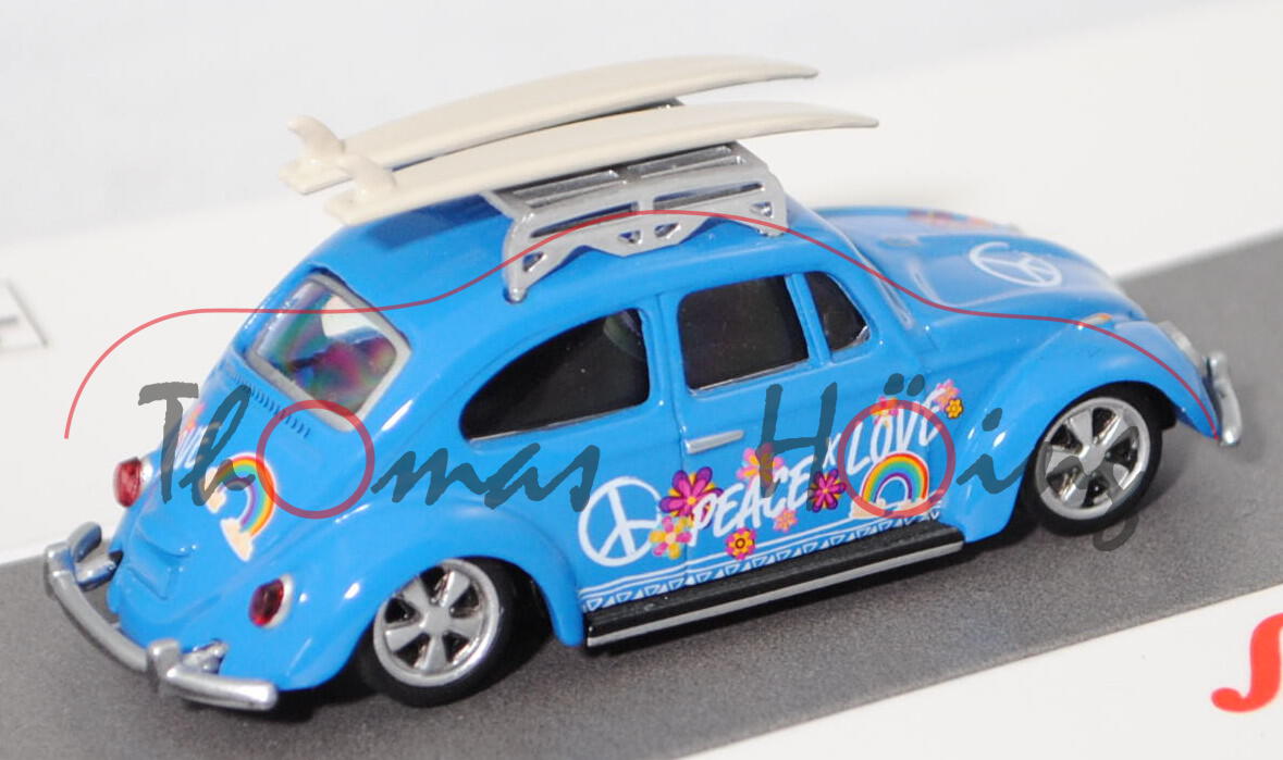 VW Käfer 1500 Limousine (Typ 11, ohne Mittelsteg auf der Motorhaube, kantiges Gehäuse für Kennzeichenbeleuchtung, Heckantrieb, Motor: luftgekühlter Vierzylinder-Boxer-Viertakt-Otto mit einem Solex Fallstromvergaser 30 PICT-1 und zentraler Nockenwelle sowie 2 Ventile pro Zylinder und 1493 cm³ und 44 PS, Radstand 2400 mm, Länge 4070 mm, Modell 1966-1967) Lowrider Surfer Beetle, himmelblau, innen schwarz, Sitze schwarz, Lenkrad schwarz, Druck Friedenslogo und PEACE LOVE in reinweiß sowie Blumen und Regenbogen auf den Seiten, Druck Friedenslogo in reinweiß und Blumen vorne auf der Haube, Druck LOVE in reinweiß und Regenbogen hinten auf der Klappe, Dachträger silber, Surfbretter perlweiß, Fuchs-Felgen (Hersteller: Otto Fuchs KG Meinerzhagen) (Stahlfelgen Größe 4 J x 15 mit Lochkreis 4 x 130 und Reifen 5,60-15 bzw. 155 SR 15 mit Radzierkappen), Schuco EDITION 1:64, 1:64, mb (EAN 4007864060665)