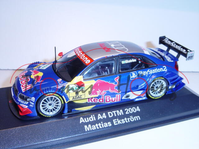 Audi A4 DTM 2004 (2. Generation A4, Baureihe B6, Typ 8E2 / R11, Facelift 2003, Stoßfänger vorne und hinten im unteren Bereich sowie Seitenschweller in Wagenfarbe lackiert, Hinterradantrieb, Motor: Audi Achtzylinder-V-Viertakt-Otto mit 4 Ventilen pro Zylinder und reglement-bedingte Luftmengenbegrenzung auf 2 x 28,0 mm sowie Motormanagement Bosch MS 2.9 und 4000 cm³ sowie 460 PS, Getriebe: sequenzielles 6-Gang-Sportgetriebe, Radstand 2750 mm, Länge 4800 mm, Modell 2003-2004), ultramariunblaumetallic, innen schwarz, Sitz schwarz, Lenkrad schwarz, Deutsche Tourenwagen-Masters (DTM) 2004 (11 Saison-Rennen an 11 Wochenenden vom 13. April bis 03. Oktober 2004), Fahrer: Mattias Ekström (1. Platz mit 74 Punkten, Außenspiegel rot), Startnummer 5, Team: Audi Sport Team Abt (Teamwertung: 1. Platz mit 113 Punkten, Herstellerwertung: 1. Platz mit 168 Punkten), Sponsoren: Red Bull / DEKRA / PlayStation® 2 / WÜRTH / Sebring Sportauspuff / OZ WHEELS / H&R / ABT SPORTSLINE / DUNLOP / BLAUPUNKT / Castrol / vodafone / BOSCH / Audi, O.Z. Schmiedefelgen aus Aluminium vorne Größe 10 x 18 Zoll mit Dunlop-Reifen radial 265/660-R18 und hinten Größe 11 x 18 Zoll mit Dunlop-Reifen radial 280/660-R18, Minichamps, 1:43, PC-Box Werbeschachtel (Limited Edition quattro GmbH, Audi collection, Vitrinenmodell) (EAN 4012138058620)