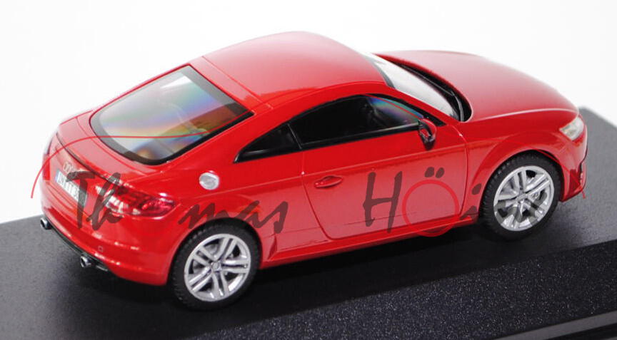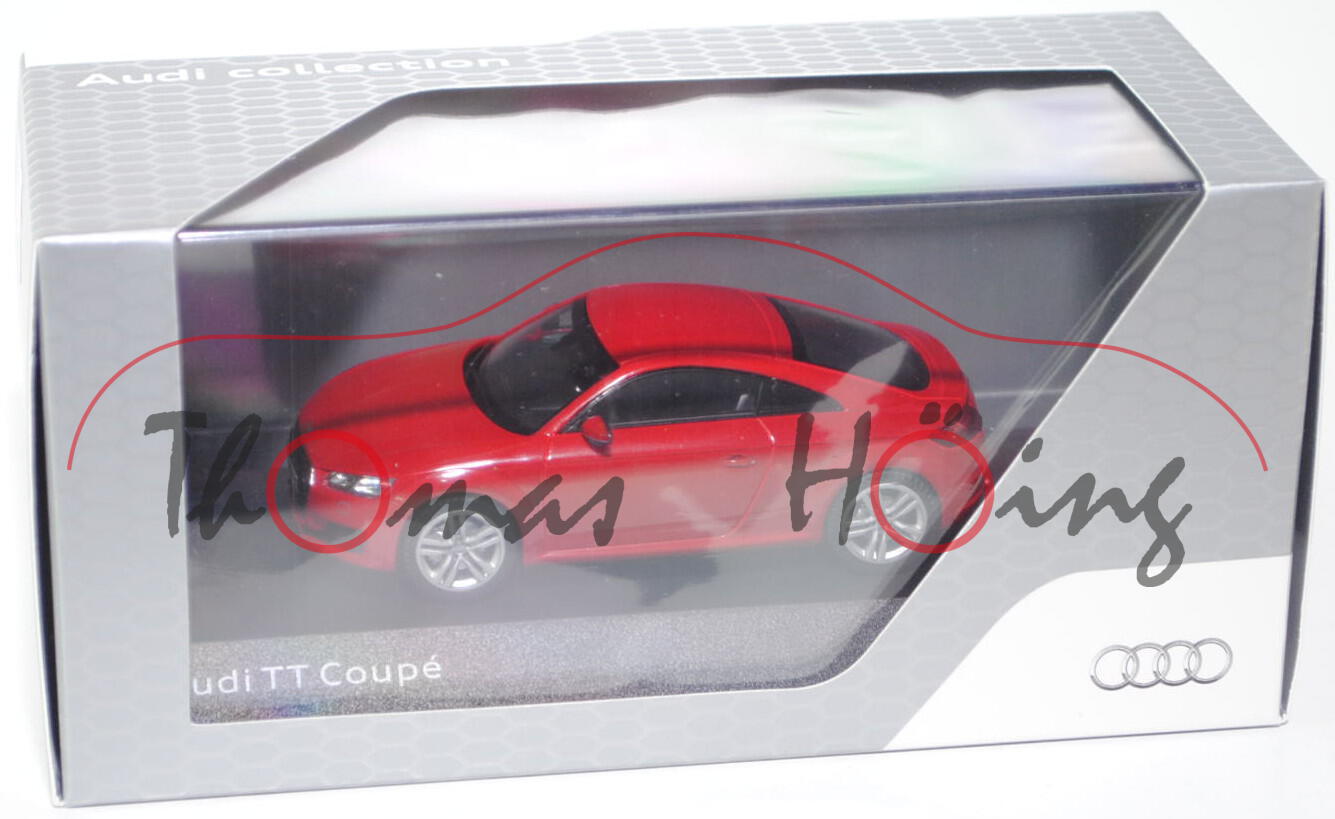 Audi TT Coupé 2.0 TFSI quattro (3. Generation, Typ 8S/FV, Motor: Audi Vierzylinder-Reihen-Turbo-Otto mit 1984 cm³ und 230 PS, Radstand 2505 mm, Länge 4177 mm, Modell 2014-2018), tangorot, Aluminium-Schmiederäder im 5-Arm-Stern-Design Größe 9 J x 19 mit Reifen 245/35 R 19, Kyosho, 1:43, PC-Box Werbeschachtel (Limited Edition quattro GmbH / Audi collection)