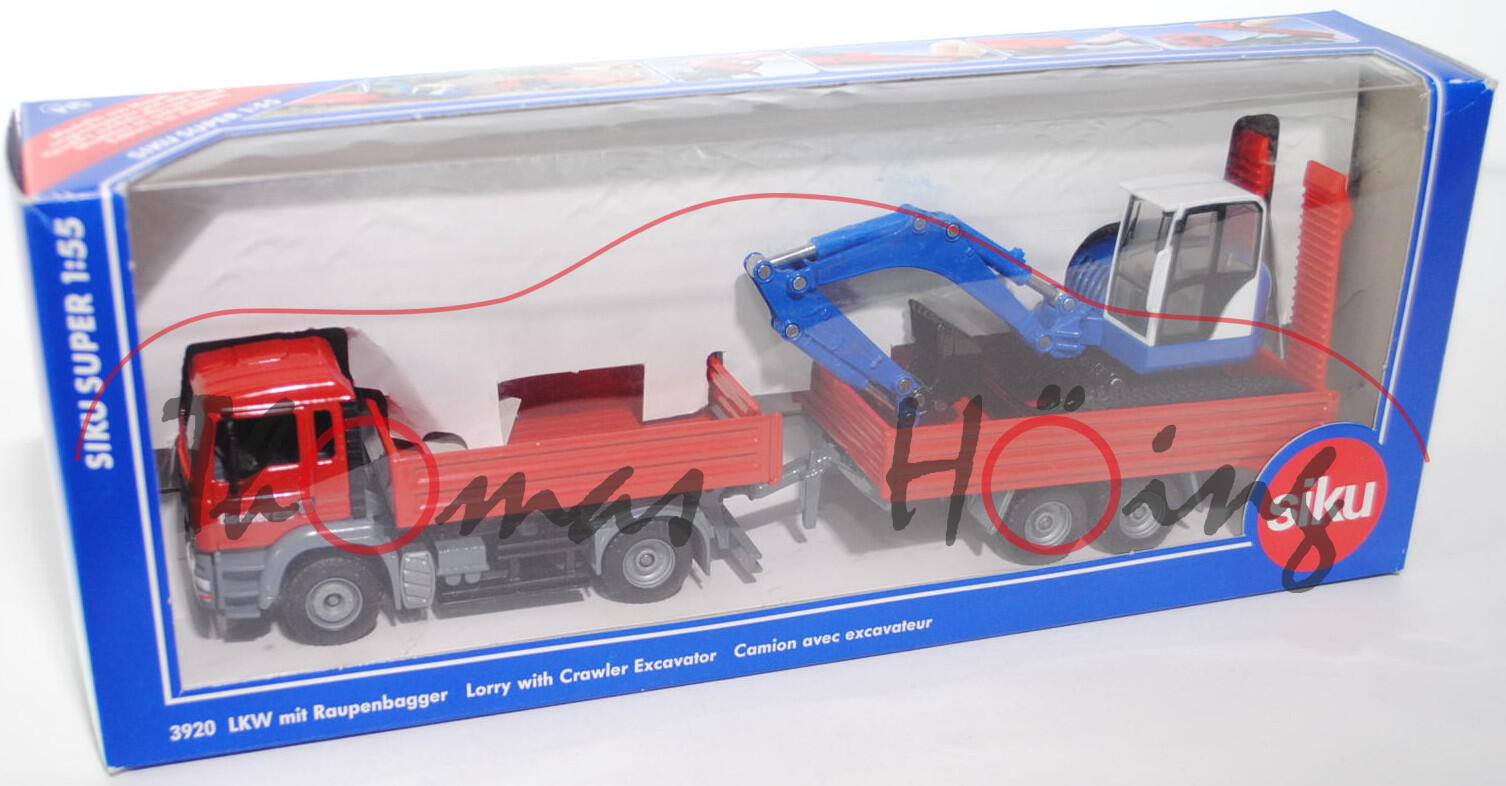 MAN TGA LKW mit Raupenbagger, verkehrsrot/fehgrau/schwarz und reinweiß/signalblau/schwarz, LKW-Radka