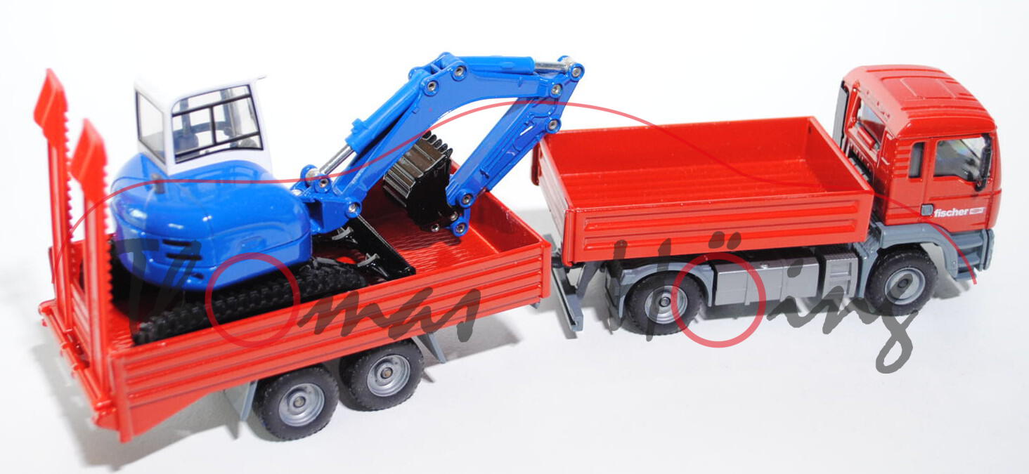 MAN TGA LKW mit Raupenbagger, verkehrsrot/fehgrau/schwarz und reinweiß/signalblau/schwarz, LKW-Radkasten vorne grau, fischer, 1:55, L17P