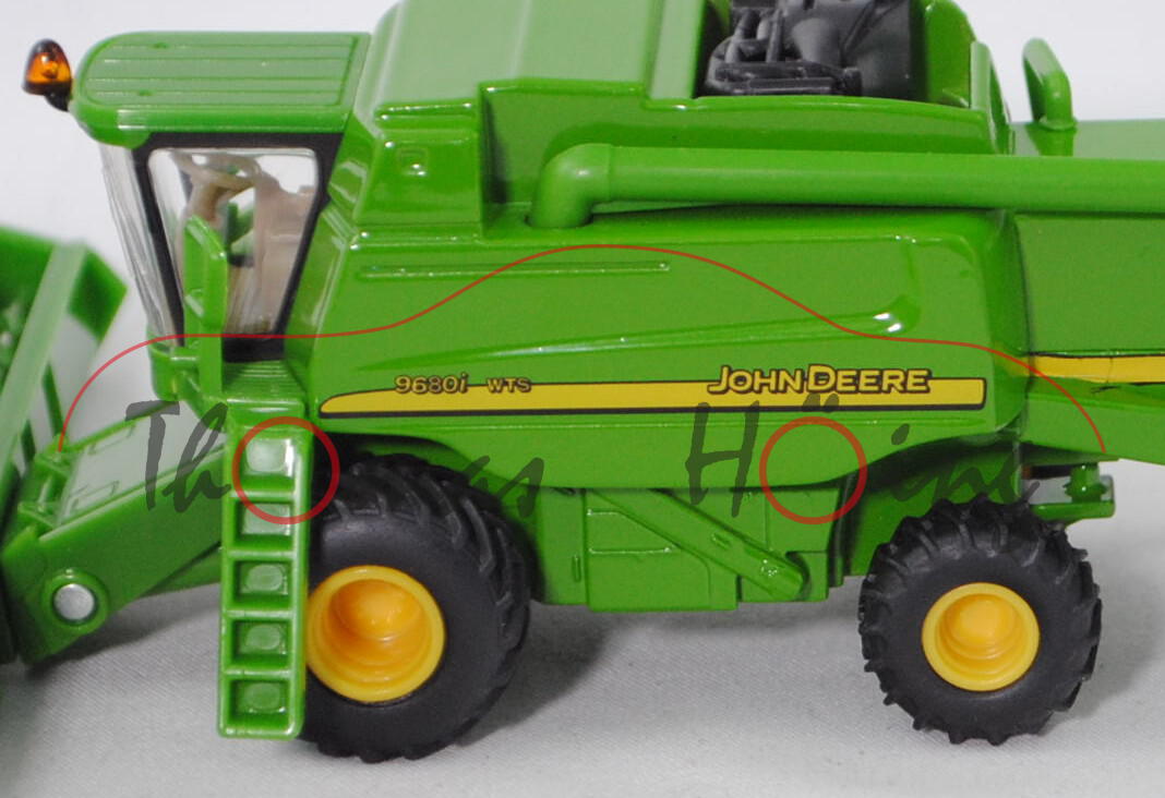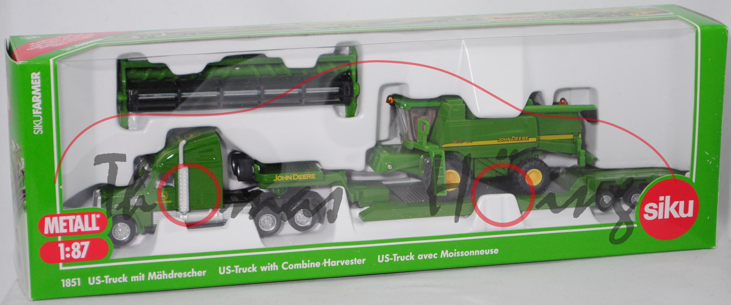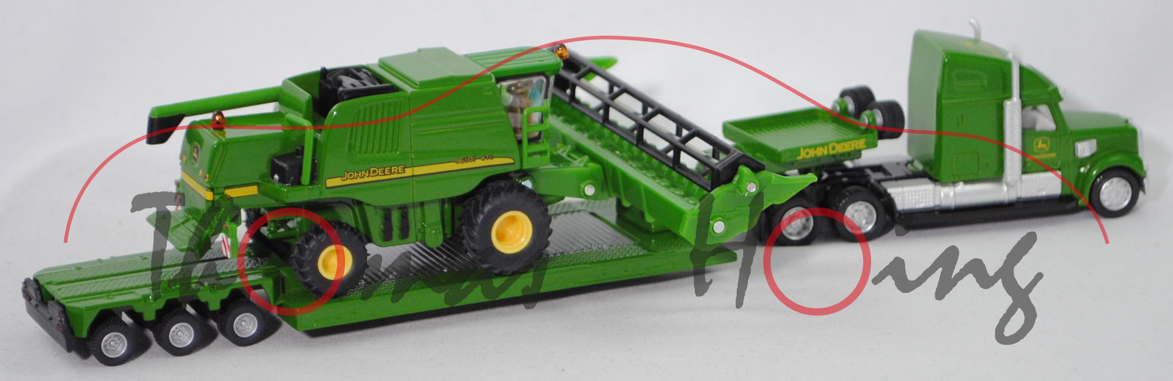 00000 FREIGHTLINER® CORONADO® CC132 6x4 (Typ 70'' Raised Roof SleeperCab, Modell 2001-2010) Sattelzugmaschine und 3-Achs-Tiefbett Sattelauflieger mit abnehmbarem Schwanenhals (Typ Tieflader mit gekröpftem Tiefbett, Schwanenhals abnehmbar) sowie Ladegut John Deere 9680i WTS (Motor: John Deere PowerTech PVX 6081HZ019, Modell 2004-2007) Mähdrescher mit John Deere 630R Erntevorsatz (Typ starres Schneidwerk, Arbeitsbreite 9,15 m), Sattelzugmaschine: hell-smaragdgrün/schwarz, innen reinweiß, Lenkrad reinweiß, Druck John Deere-Logo und JOHN DEERE in zinkgelb auf den Türen und vorne oben auf der Schlafkabine, 87M3 / 87M4 silber, ca. 1:87; Sattelauflieger: hell-smaragdgrün, Druck JOHN DEERE in zinkgelb auf den seitlichen Bordwänden des Schwanenhalses, Ladefläche mittig silbergraumetallic, Tiefbettbrücke mit schwarzem Plastik-Unterfahrschutz, 87M2 silber, ca. 1:87; Mähdrescher: smaragdgrün, innen graubeige, Sitz graubeige, Lenkrad graubeige, Druck 9680i WTS JOHN DEERE in zinkgelb/schwarz und zinkgelb/schwarze Streifen auf den Seiten, Druck John Deere-Logo und Streifen in zinkgelb/schwarz hinten, 87M14 verkehrsgelb / 87M15 verkehrsgelb, ca. 1:85, SIKU FARMER 1:87, L17mK (EAN 4006874018512)