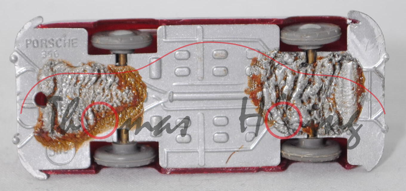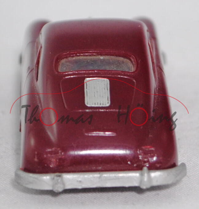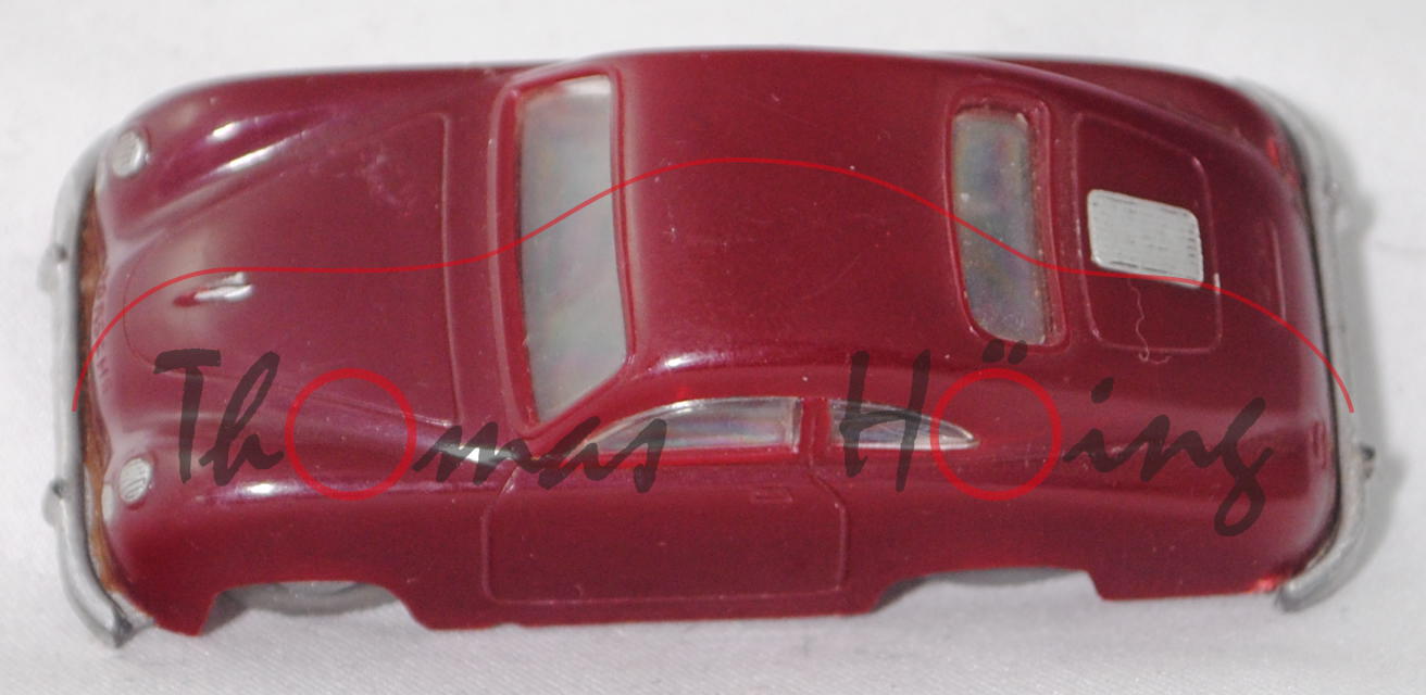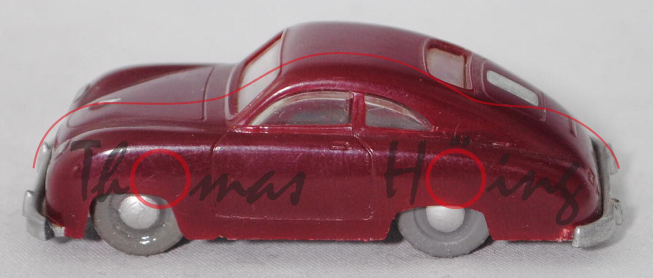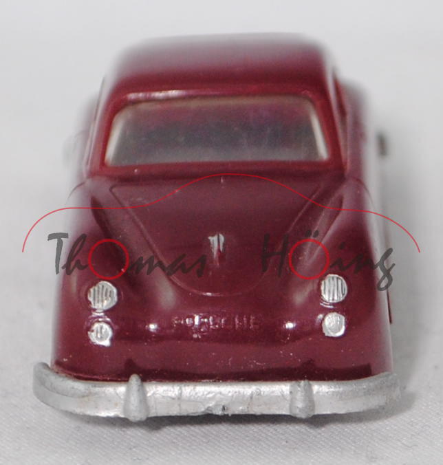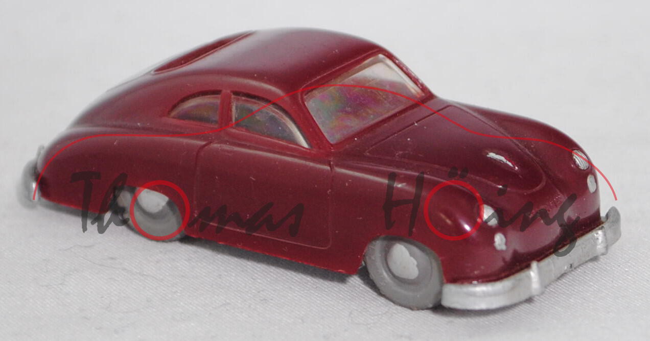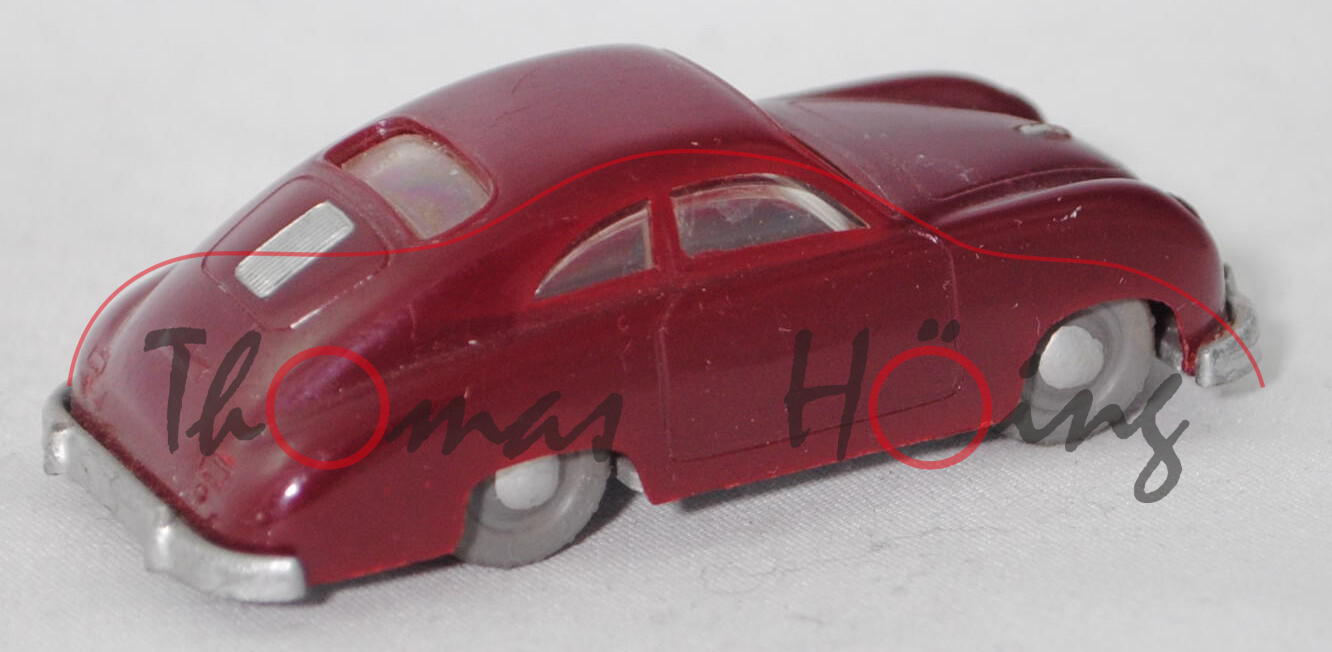 00000b Porsche 356 1100 Coupé (Typ Urmodell, auch Pre-A oder Knickscheibe genannt, einteilige Windschutzscheibe mit Knick in der Mitte, Griff auf Kofferraumhaube kurz, Stoßstange mit Stoßstangenhörnern, Rückleuchten rechteckig, Blinker hinten rund unterhalb der Rückleuchten, Motor: Porsche Typ 369 Vierzylinder-Viertakt-Boxer mit 1086 cm³ und 40 PS, Radstand 2100 mm, Länge 3950 mm, Modell 1950-1954, Baujahr 1952), weinrot, Chassis silbergraumetallic, Stoßstangenecke vorne links weg, mit Schlepploch, RV 18/1 mausgrau mit gesilberter Radkappe, ehemaliges Fahrschulmodell da Klebereste unter dem Chassis, Siku-Verkehrsmodelle aus Plastik 1:60, ca. 1:58 (EAN 4006874000180)