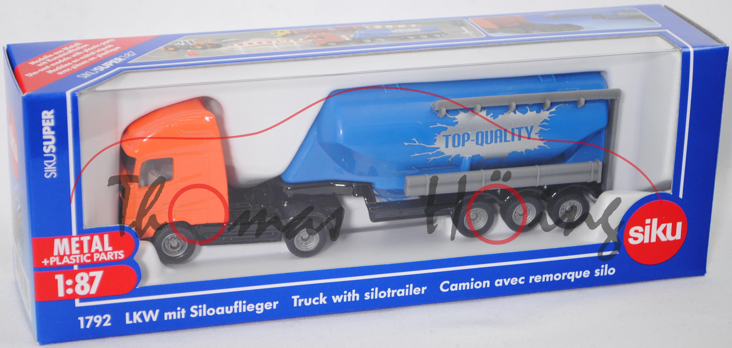 00000 Volvo FH16 750 Globetrotter-XL 4x2 (3. Generation, Globetrotter XL-Fahrerhaus (CAB-XHSL), Radstand 3500 mm, Modell 2013-) Sattelzugmaschine mit 3-Achs-Silo-Sattelauflieger (Typ liegend oder Euterfahrzeug), Zugfahrzeug: reinorange/schwarz, innen lichtgrau, Lenkrad integriert, C27c / C28c geschlossen silbergrau; Auflieger: hell-verkehrsblau/schwarz, Silo hell-verkehrsblau mit silbernem Druck auf den Seiten wobei TOP-QUALITY in Silofarbe durchschimmert, Chassis schwarz mit integrierter seitlicher Schutzeinrichtung und integriertem Unterfahrschutz, C28c geschlossen silbergrau, SIKU SUPER 1:87, ca. 1:87, L17mpK (EAN 4006874017928)