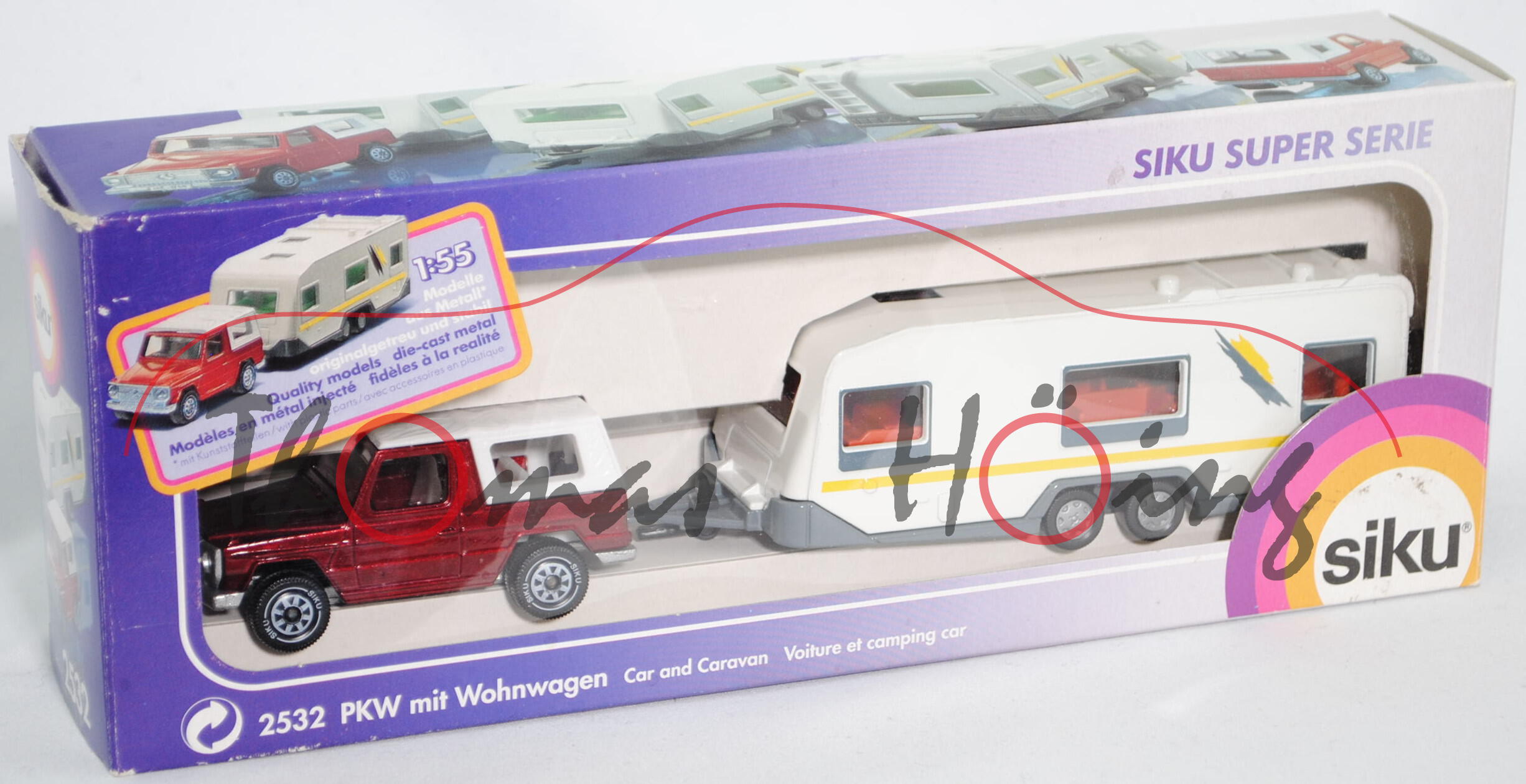 00003 Mercedes-Benz 280 GE (Typ W 460, Baumuster 460.243 (offener Wagen), Modell 1980-1990) mit KNAUS EUROSTAR 620 TF (Modell 1993-1998) Wohnwagen, Zugfahrzeug: rubinrotmetallic, innen reinweiß, Lenkrad schwarz, Chassis silber, Hong, Verglasung rauch, B5, ca. 1:56; Wohnwagen: cremeweiß/blaugrau, innen rotorange, kadmiumgelber und kadmiumgelb/blaugrauer Streifen auf den Seiten des Wohnwagens, mit Anschlag für die Tür, Verglasung rauch, B6, ca. 1:55, SIKU SUPER, L14a (EAN 4006874025329)