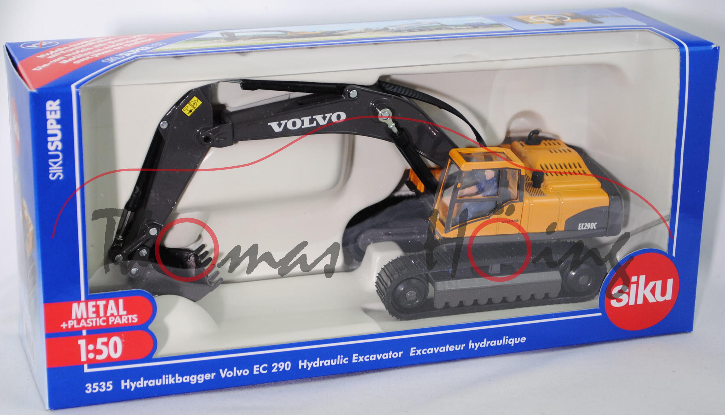 00002 Hydraulikbagger Volvo EC290C L mit 1,7 m³ Tieflöffel und Raupenfahrwerk (Motor: Volvo D7E EAE3, Unterwagen: Long Crawler, Ausleger: Monoboom, Radstand 4015 mm, Modell 2007-2011), maisgelb/hell-graubraun, Sitz schwarz, Druck Warnschilder auf den Seiten des Löffelstieles und hinten auf dem Kontergewicht, Druck VOLVO auf den Seiten des Auslegers und hinten auf dem Kontergewicht, Druck VOLVO auf der linken Seite der Fahrerkabine und EC290C auf den Seiten des Oberwagens, Ausleger und Löffelstiel ohne Loch, Kopfende der Hydraulik des Auslegers 5,5 mm dick, Hydraulikzylinder oben am Löffelstiel 3,0 mm breit, alle Hydraulikzylinder mit Anschlag, Verstärkung Unterwagen im Bereich der Laufwerkseiten geschlossen, Fahrerkabine und Oberteil Oberwagen einschließlich Motorhaube maisgelb, Fensterrahmen vorne und seitlich der Fahrerkabine hell-graubraun bedruckt, hinterer Teil der Motorhaube auf den Seiten hell-graubraun bedruckt, Chassis Oberwagen und Kontergewicht sowie Ausleger und Löffelstiel hell-graubraun, Unterwagen hell-graubraun, Tieflöffel hell-graubraun, Bpr. siku-Logo, CE-Zeichen mittig auf dem Unterwagen vor dem Kontergewicht, Verglasung rauch, Felgen schwarz, schwarze Raupen mit Riffeln in 2er-Gruppen; Zubehör: Fahrer mit enzianblauem Overal und enzianblauen Schuhen sowie schwarzen Haare, SIKU SUPER, ca. 1:50, L17mpK (EAN 4006874035359)