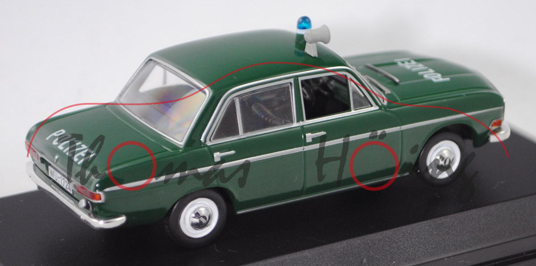 Audi 72 (Typ F103, Limousine mit 4 Türen, Scheibenwischer übereinander liegend, Tankstutzen unter der rechten Rückleuchte, Rückleuchten niedrig und breit, Motor: Audi Vierzylinder-Reihen-Otto-Viertakt mit 1695 cm³ und 72 PS, Radstand 2490 mm, Länge 4380 mm, Modell 1965-1968, Baujahr 1965) Polizei, hell-tannengrün, innen schwarz, Sitze schwarz, Lenkrad schwarz, Druck POLIZEI in reinweiß auf der Motorhaube und der Heckklappe, mit Blaulicht und Außenlautsprecher auf dem Dach, Martinshorn bestehend aus 2 Makrofonen (Hersteller: Deutsche-Signal-Instrumenten-Fabrik Max B. Martin aus Philippsburg) auf der vorderen Stoßstange, Nummernschild WÜ - 1724, Dienststelle: Polizeipräsidium Unterfranken mit Sitz in Würzburg, Stahlscheibenräder in reinweiß Größe 4,5 J x 13 mit Reifen 6,45/165-13 (4PR) sowie Radkappen in chrom, Norev, 1:43, PC-Box (EAN 3551098300246)
