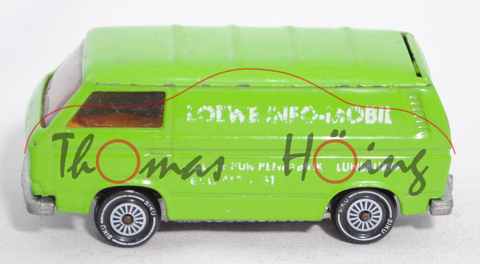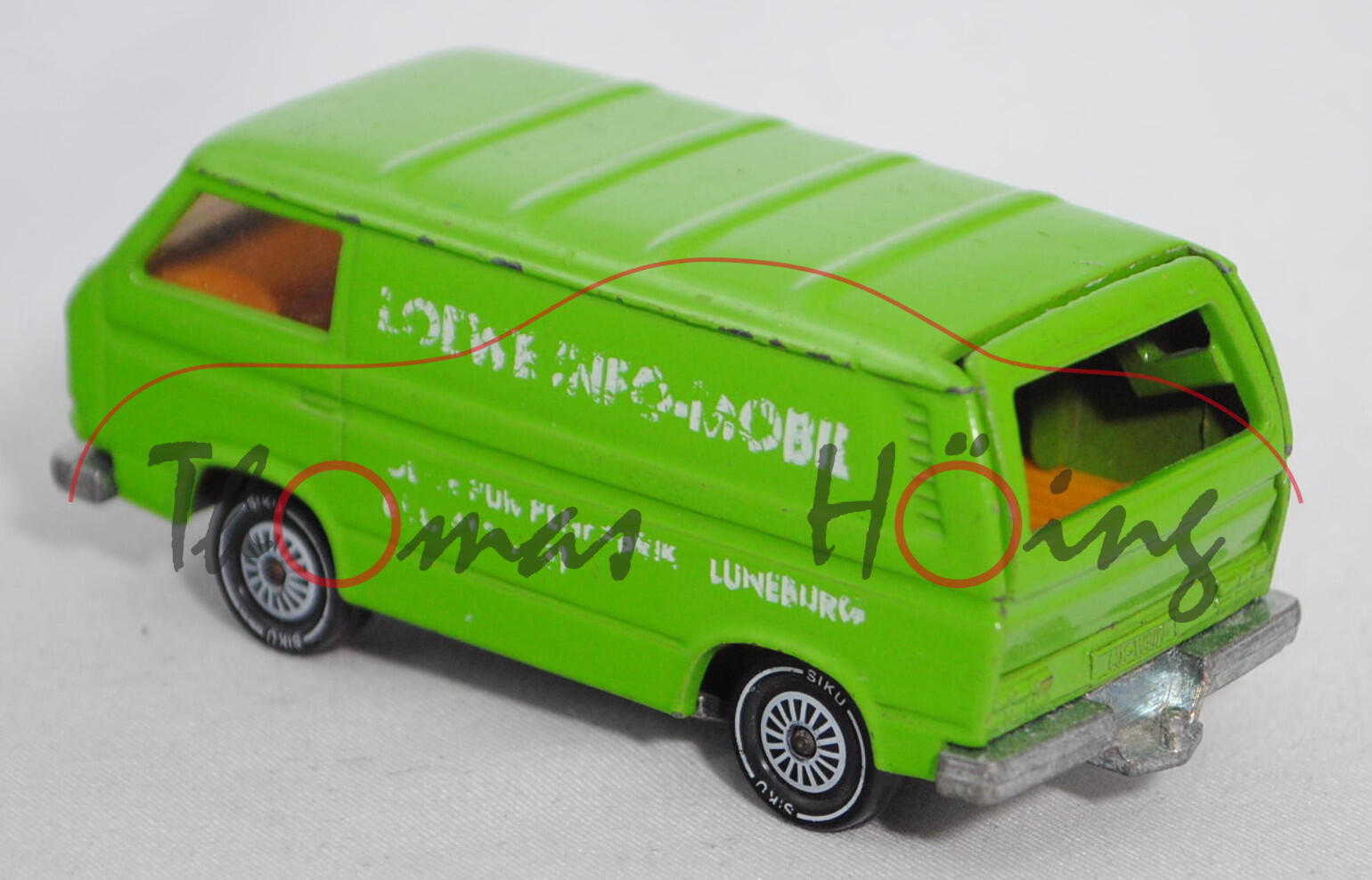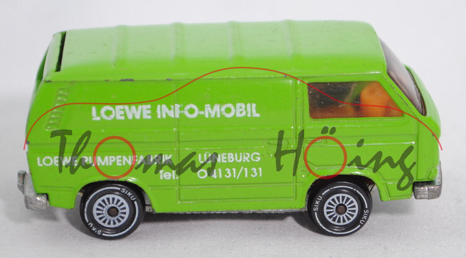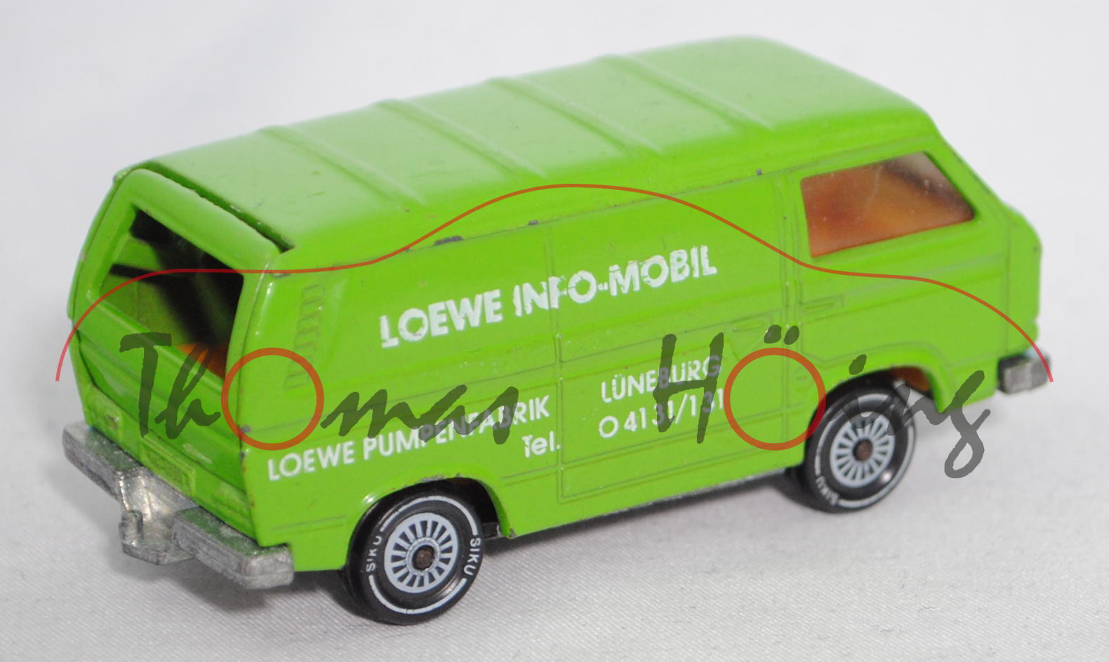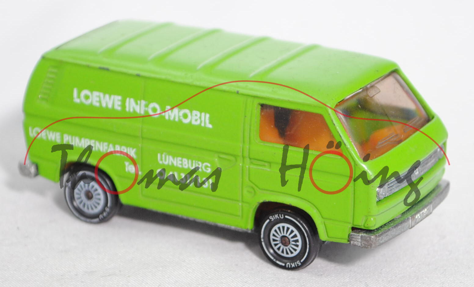 VW Transporter 2,0 Liter (Typ 2-Modell '80 T3, Typ 251 Kastenwagen mit geschlossenem Aufbau, Modell 1979-1982), gelbgrün, innen dahliengelb, Lenkrad integriert, Druck LOEWE INFO-MOBIL / LOEWE PUMPENFABRIK · LÜNEBURG / Tel. 04131/131 in reinweiß auf den Seiten, W-Germ, Chassis chrom, ohne CE-Zeichen, Verglasung rauch, R11, SIKU SUPER, ca. 1:60, minimale Farbabplatzer, Druck links abgegriffen, Limited Edition (EAN 4006874013319)