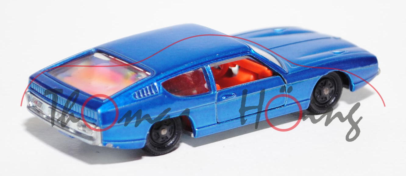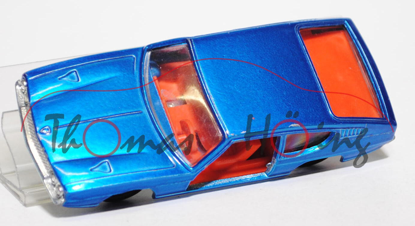 Lamborghini Espada 400 GT (Tipo 108), Modell 1968-1978, verkehrsblaumetallic, innen rotorange, Lenkrad rotorange, Verglasung klar, R3, mit Farbabplatzer, m-, Tür links weg