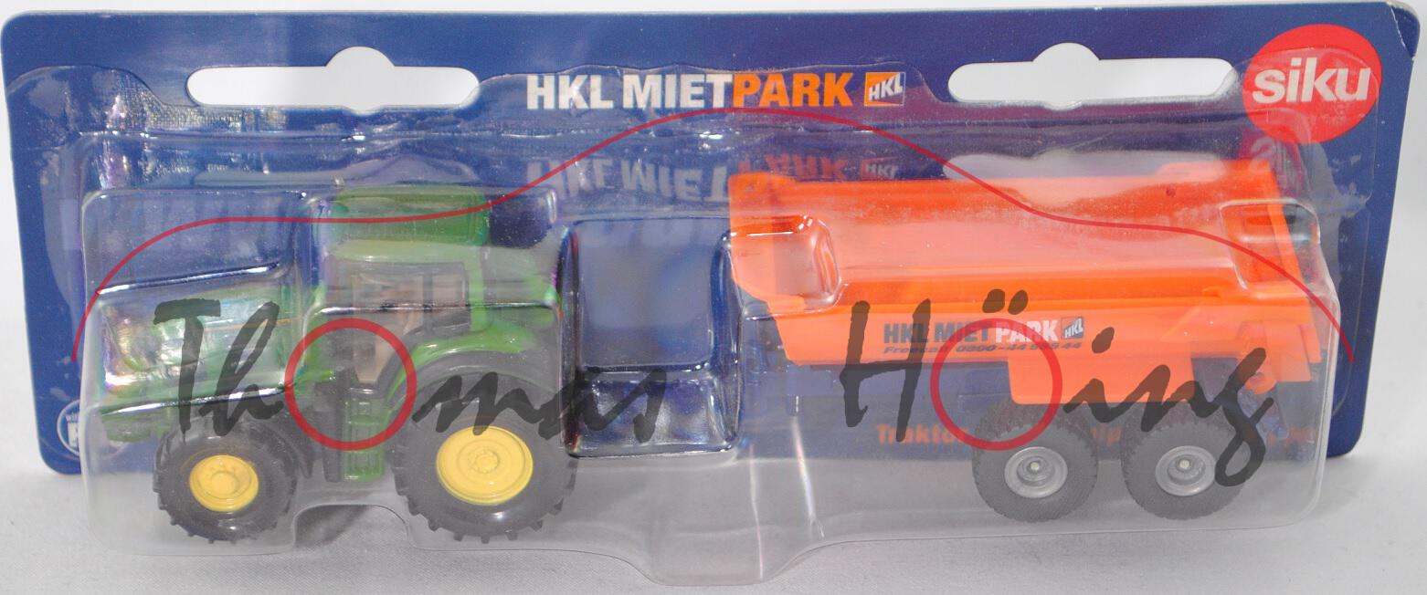 00401 John Deere 7530 Premium Traktor (Modell 2007-2011) mit Krampe Halfpipe Tandem Erdbaukipper HP 20 (Muldenkipper, Radstand 1550 mm, Modell 1999-), John Deere: smaragdgrün/mattschwarz, Sitz graubeige, Lenkrad graubeige, Kabine innen graubeige, Druck JOHN DEERE / 7530 / Premium in schwarz/verkehrsgelb und verkehrsgelb/schwarzer Streifen auf den Seiten der Motorhaube, Druck John Deere-Logo in gelb/grün im Grill, C52 gelb / C53 gelb, ca. 1:74; Anhänger: hell-reinorange/kobaltblau, Druck HKL MIETPARK / Freecall 0800-44 555 44 und HKL-Logo in saphirblau/reinweiß auf den Seiten, Mulde hell-reinorange, Chassis kobaltblau, Mulde mit Bpr. 1632, Chassis ohne Bpr. 1632 und mit CE-Zeichen, C32 silbergrau, ca. 1:76, SIKU SUPER, P29a Werbeschachtel (Limited Edition) (EAN 4006874016327)