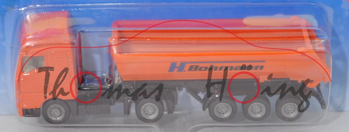 00401 MAN TG460A XXL (TGA 18.460 XXL) Sattelzugmaschine (Modell 2000-2007) mit 3-Achser Kippsattelanhänger HalfTraxx (Handelsbezeichnung MHPS 41/3-S, Hersteller bis 2004 KÖGEL und seit 2004 MEILLER KIPPER, Aufbautyp HalfTraxx Light/Bimet, innenliegende Rückwand, Modell 2003-) (Halfpipe-Muldenkipper), reinorange/schwarz, innen lichtgrau, Lenkrad integriert, Druck H. Bohmann in ultramarinblau/schwarz auf den Seiten der Mulde, LKW Radkasten schwarz, Chassis LKW und Chassis Auflieger schwarz, Stütze Auflieger schwarz, C27a / C28a offen und geschlossen silbergrau, SIKU SUPER, ca. 1:87, P28b (Limited Edition) (EAN 4006874016303)