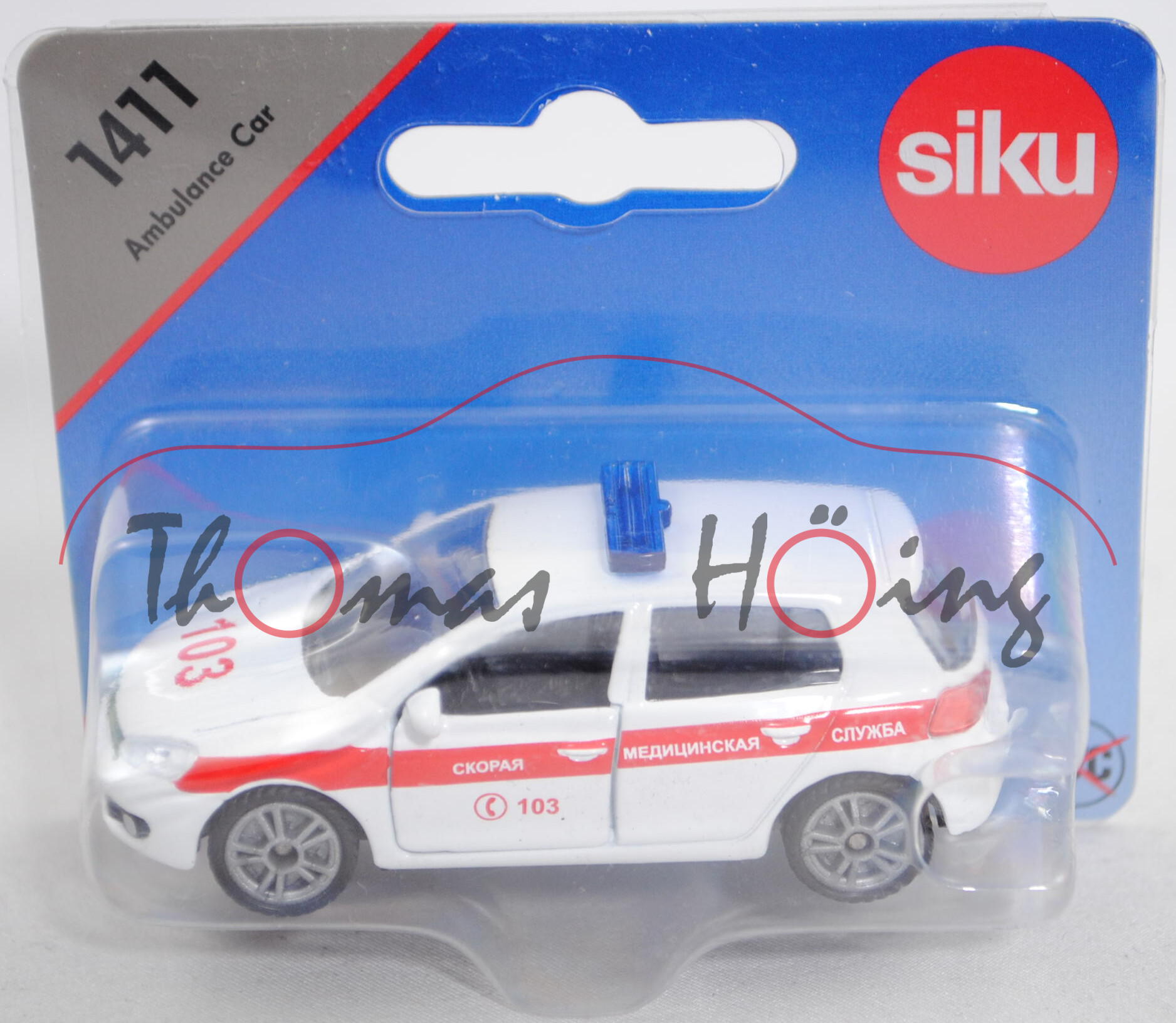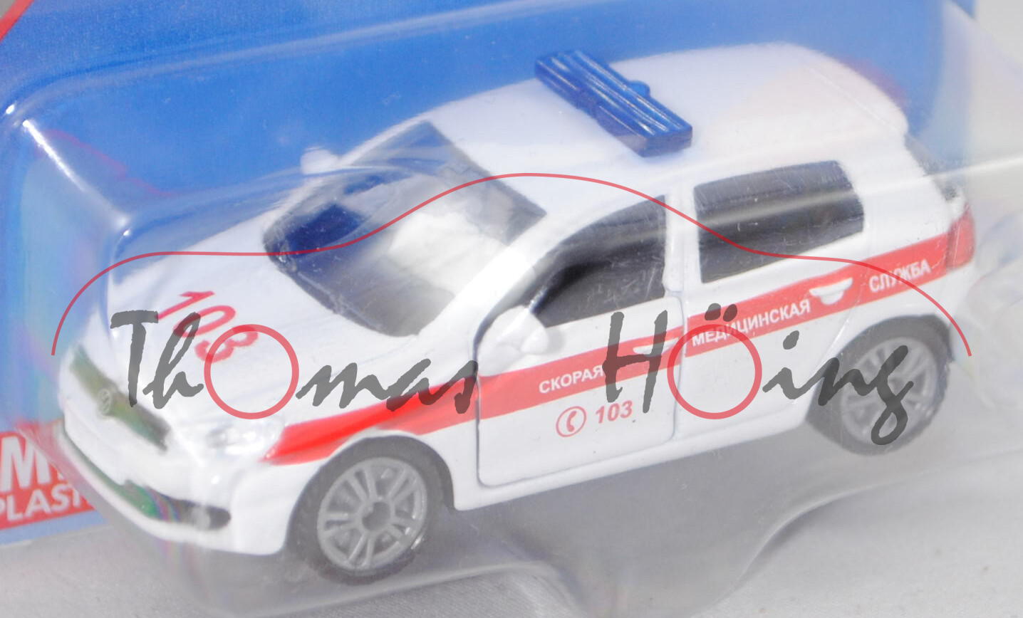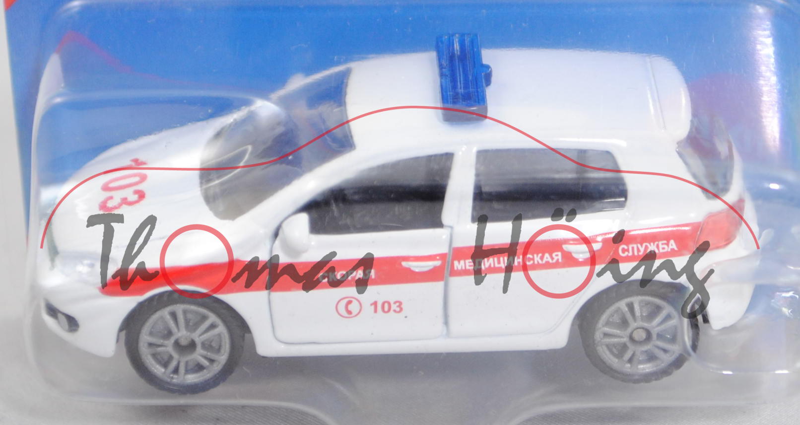 07500 RU VW Golf VI 2.0 TDI (Typ 1K, Modell 2008-2012) Ambulance Car, reinweiß, innen schwarz, Lenkrad schwarz, Druck C 103 und hell-verkehrsroter Streifen auf den Seiten wobei CKOPAR MEANUNHCKAR CNYXGA in Wagenfarbe durchschimmert, Druck 103 in hell-verkehrsrot auf der Motorhaube, Druck GOLF 2.0 TDI und VW-Logo in silber auf der Heckklappe, Prägung Nummernschild SI-KU 254, mit flacher Blaulichtleiste, Bpr. mit Adresse, Druck Chargennummer in grau auf dem Chassis, B49 geschlossen silber, SIKU SUPER, ca. 1:55, P29e (Limited Edition / RUSSIA SPECIAL) (EAN 4006874914111)