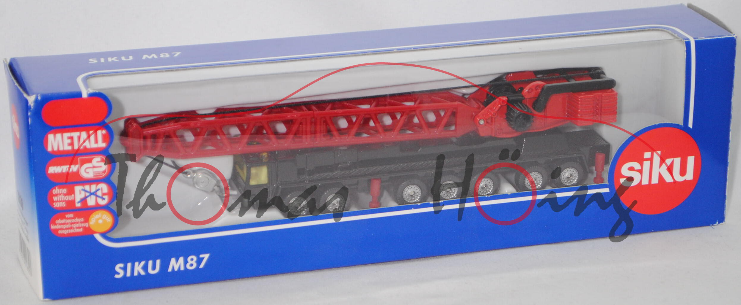00001 Gittermast-Mobilkran, rubinrot/hell-signalrot/schwarz, innen lichtgrau, Lenkrad integriert, Oberteil Unterwagen schwarz, Bodenplatte Gegengewichte rubinrot, Gittermast rubinrot, Oberwagen hell-signalrot, Handrad schwarz, Lastenseil schwarz mit Kranhaken in chrom, Stützen rubinrot, Verglasung gelb, C36, SIKU SUPER 1:87 / SIKU M87, ca. 1:117, P31o (EAN 4006874018307)