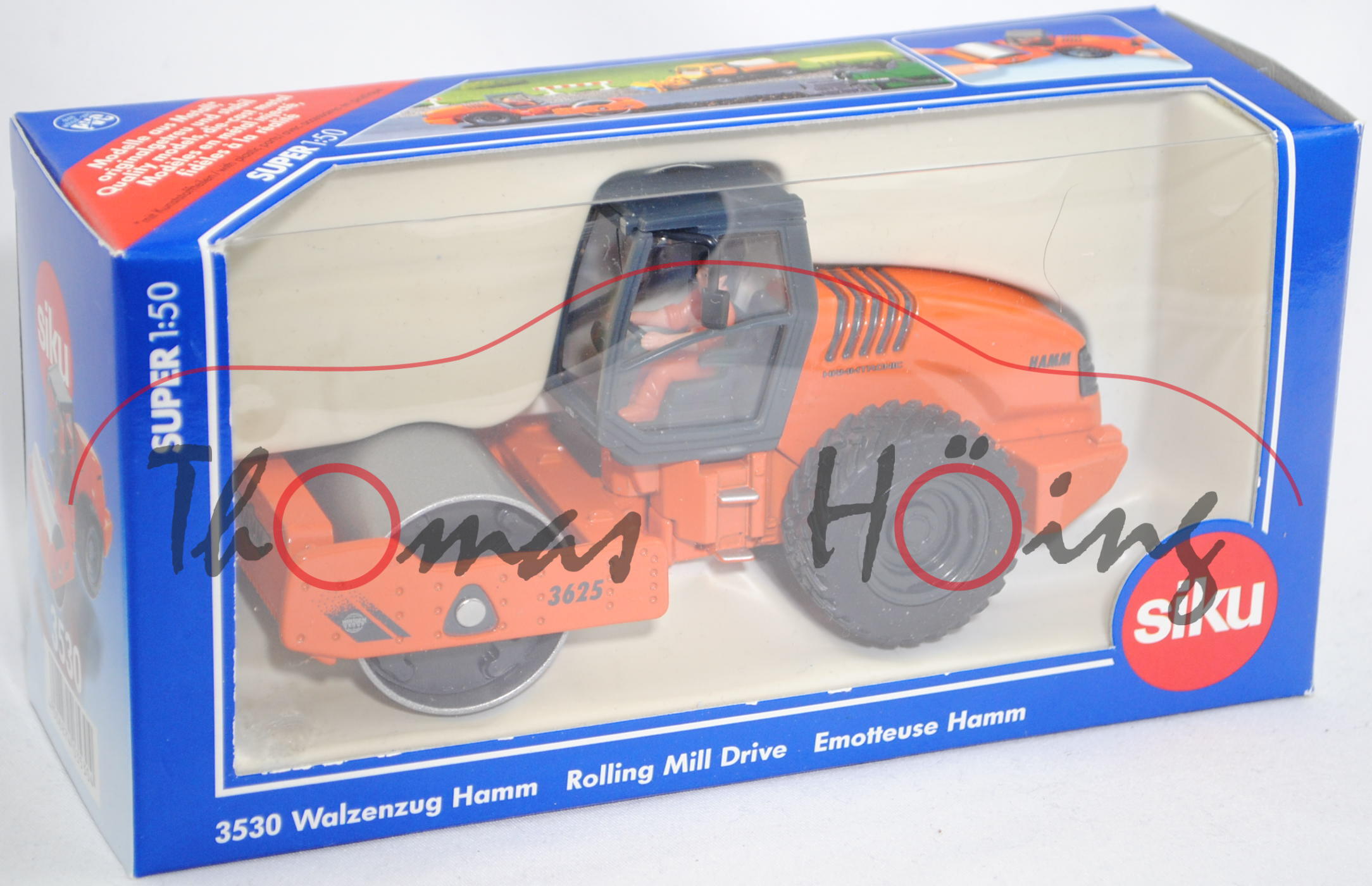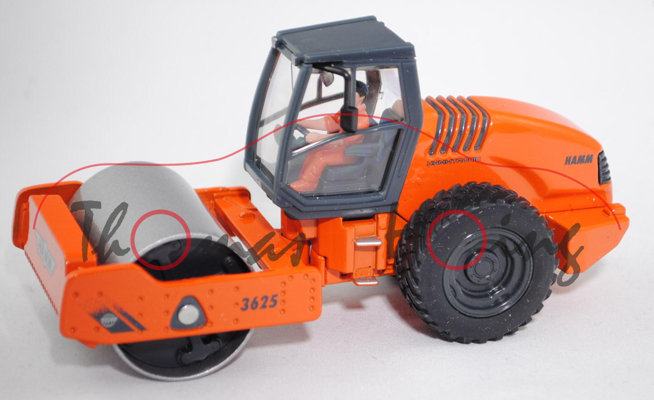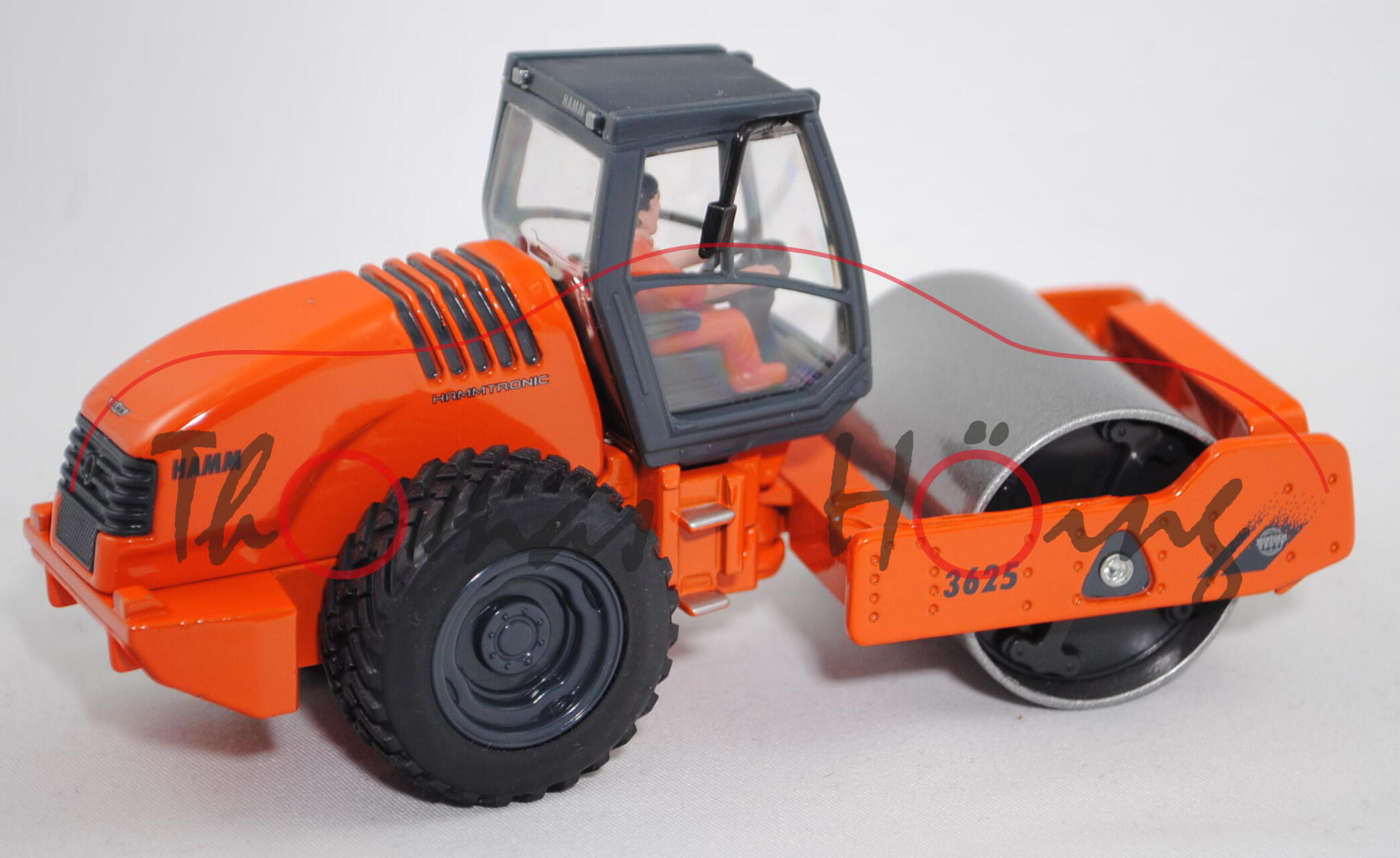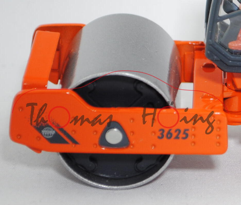 00001 HAMM 3625 HT Walzenzug mit Vibrationsglattbandage und HAMMTRONIC (Typ Fahrerkabine ROPS, Motor: Deutz BF6M1013EC, Achsabstand 3230 mm, Modell 2000-2007), dunkel-eisengrau/reinorange, innen dunkel-eisengrau, Lenkrad dunkel-eisengrau, Druck WIRTGEN / GROUP-Logo auf eisengrauen Streifen und 3625 auf den Seiten des Abstreifers, Druck HAMMTRONIC und HAMM in eisengrau auf den Seiten der Motorhaube, Druck HAMM-Logo vorne auf dem Abstreifer und hinten auf der Motorhaube, Druck HAMM hinten auf der Fahrerkabine, Achsenkopf der linken Vorderachse 4,3 mm dick, Fahrerkabine dunkel-eisengrau, Abstreifer und Motorhaube sowie Hinterwagen und Chassis Hinterwagen reinorange, Verglasung klar, Vibrationsglattbandage graualuminiummatallic mit dunkel-eisengrauem Innenteil, Blinker hinten gelb bedruckt, LKW31 dunkel-eisengrau, Zubehör: Fahrer in hell-reinorangem Overal, schwarze Haare, Schuhe hell-reinorange, mit Gesichtsbemalung, SIKU SUPER, ca. 1:50, L17K (EAN 4006874035304)