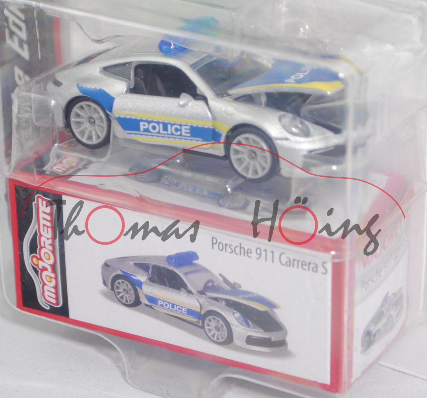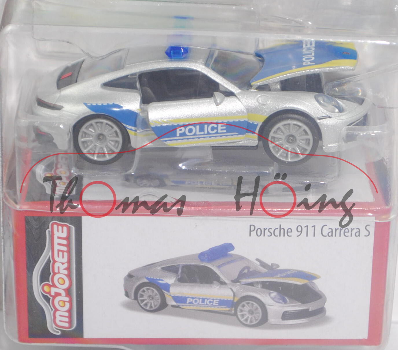 Porsche 911 Carrera S Coupé (8. Generation, Typ 992, Motor: Porsche Typ EA9A2 Sechszylinder-Boxer-Bi-Turbo-Viertakt-Otto mit Direkteinspritzung und 2981 cm³ sowie 450 PS, Radstand 2450 mm, Länge 4519 mm, Modell 2018-) Polizei (Nr. 209K), silber (vgl. GT-silbermetallic beim Original), innen schwarz (vgl. schwarz beim Original), Sitze schwarz (vgl. schwarz beim Original), Lenkrad schwarz (vgl. schwarz beim Original), Stauraum vorne schwarz, Druck schwefelgelb/enzianblaue Streifen auf den Seiten, Druck POLICE in reinweiß auf den Türen und der Haube vorne, Haube vorne enzianblau mit schwefelgelben Streifen an den Länsseiten, Blaulichtbalken auf dem Dach, Türen + Haube vorne zu öffnen, 10-Speichen-Felge in lichtgrau (Leichtmetallräder im 10-Speichen-Design mit offenen Speichen vorne Größe 8,5 J x 20 ET 50 mit Reifen 245/35 ZR 20 und hinten Größe 11,5 J x 21 ET 67 mit Reifen 305/30 ZR 21), majorette, ca. 1:60, Blister mit Sammlerschachtel (Deluxe Porsche Edition) (EAN 3467452054840)