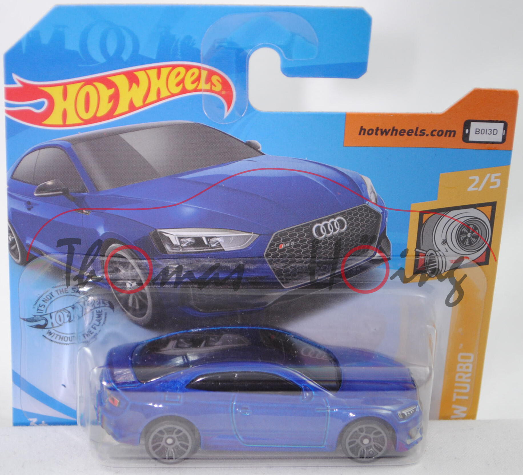 Audi RS 5 Coupé (2. Generation, Typ 9T / F5, AU494, Allradantrieb, Motor: Audi Typ VW EA839 Sechszylinder-V-Biturbo-Viertakt-Otto mit Direkteinspritzung und 2894 cm³ sowie 450 PS, Radstand 2766 mm, Länge 4723 mm, Modell 2017-2018), dunkel-ultramarinblaumetallic, innen schwarz, Sitze schwarz, Lenkrad schwarz, (Audi Aluminium-Schmiederäder im 10-Speichen-Stern-Design Größe 9 J x 19 mit Reifen 265/35 R 19), Hot Wheels, 1:64, Blister (EAN 074299057854)