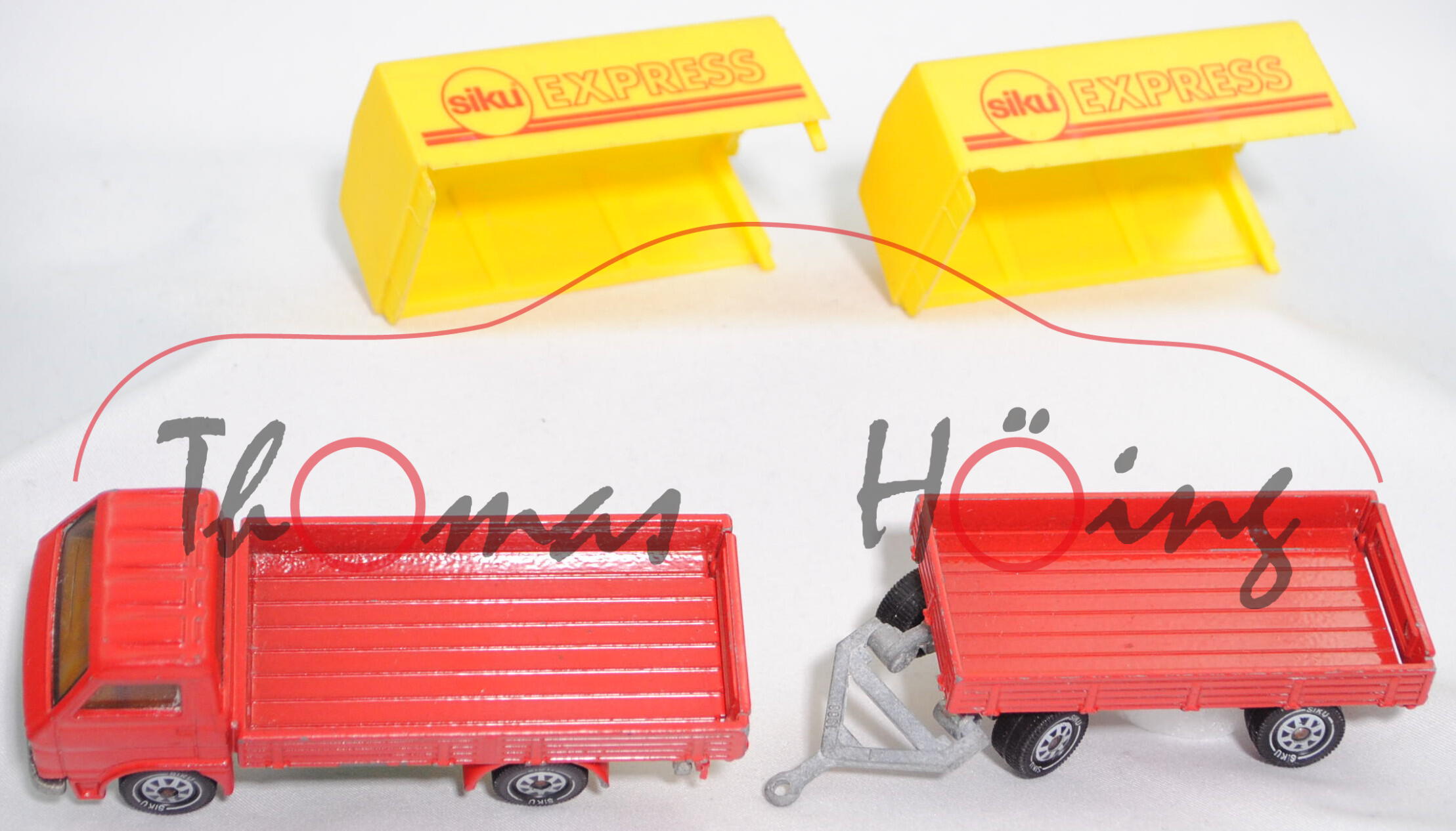 00002 MAN-VW 9.136 F LKW (Typ G90, Frontlenker, Einzelkabine mit 3 Sitzplätzen, Motorbaureihe MAN D0226, Radstand 3600 mm, Modell 1979-1987) mit Pritsche und Anhänger sowie offenen Planen, verkehrsrot, innen chromgelb, Lenkrad integriert, Planen zinkgelb, 1 Plane nur mit 1 Stift und mit kleinen seitlichen Abbrüchen, Druck siku® EXPRESS in rot, Verglasung rauch, Sprung in der Windschutzscheibe, Deichsel angelaufen, B5, SIKU SUPER, ca. 1:71, Modell mit Farbabplatzern (EAN 4006874019199)