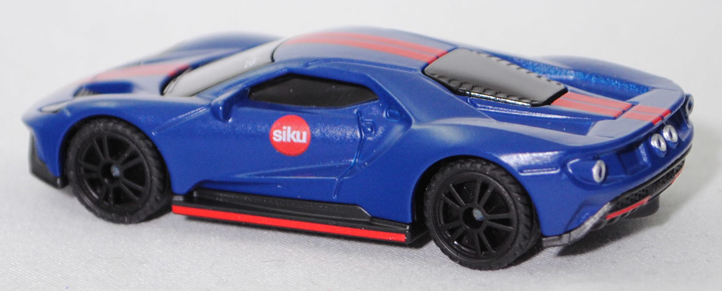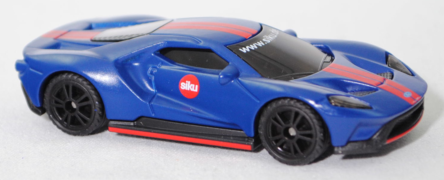 00403 Ford GT (2. Generation, Baureihe GT, zweitüriger Supersportwagen als Coupé mit 2 Sitzplätzen, Design Chris Svensson, Monocoque aus kohlenfaserverstärktem (CFK) Kunststoff mit integriertem Stahlkäfig und Aluminiumunterbau, Karosserie aus kohlenfaserverstärktem (CFK) Kunststoff, Vorfacelift, Ford 3.5L EcoBoost V6 mit 656 PS, Auspuffanlage aus Edelstahl, kleine Ladeluftkühler, 7-Gang-Transaxle-Doppelkupplungsgetriebe (Automatik), Hinterradantrieb, Motor: Ford 3.5L EcoBoost V6 der 2. Generation Typ D35 wassergekühlter Sechszylinder-V-Viertakt-Bi-Turbo-Otto mit Bosch sequentielle elektronische Hochdruck-Direkteinspritzung und zwei obenliegende Nockenwellen (DOHC = Double Overhead Camshaft) sowie 4 Ventile pro Zylinder und Ladeluftkühler sowie 3497 cm³ und 656 PS, Motorcode URWA, Radstand 2710 mm, Länge 4779 mm, Modell 2016-2019), hell-violettblau, innen schwarz, Sitze schwarz, Lenkrad schwarz, Druck siku-Logo in verkehrsrot/reinweiß auf den Türen, Druck 2 hell-verkehrsrote Streifen von vorne nach hinten über der Karosserie, Druck hell-verkehrsroter Streifen im unteren Bereich auf den Seitenschwellern und der Frontschürze im Bereich des Lüftungsgitters sowie auf dem Heckdiffusor, Druck www.siku.de in reinweiß oben auf der Frontscheibe, Verglasung rauch, B49 geschlossen schwarz (Ford einteilige geschmiedete Aluminiumfelgen im 5-Doppelspeichen-Design vorne Größe 8,5 J x 20 mit Lochkreis 5 x 114,3 und MICHELIN Pilot Sport Cup 2 Reifen 245/35 R20 sowie hinten Größe 11,0 J x 20 mit Lochkreis 5 x 114,3 und MICHELIN Pilot Sport Cup 2 Reifen 325/30 R 20), SIKU SUPER, ca. 1:62, Werbeschachtel (Limited Edition) (EAN 4006874015269)