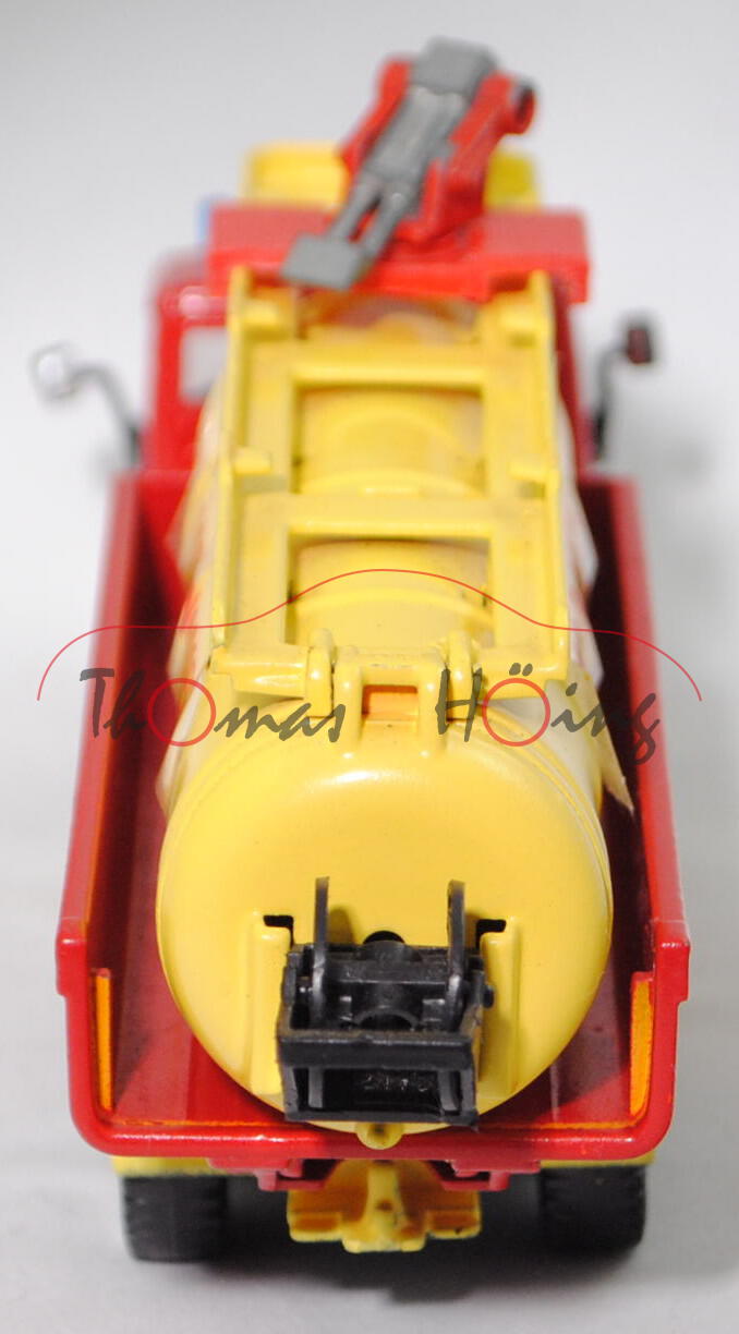 Mercedes-Benz 1520 (Typ LN2, Baureihe LK = Leichte Klasse, Standard-Fahrerhaus, Motor: Mercedes-Benz OM 366 LA wassergekühlter Sechszylinder-Reihen-Turbo-Viertakt-Diesel mit Reiheneinspritzpumpe und Ladeluftkühlung sowie 5958 cm³ und 204 PS, Baumuster Motor 366.992, Modell 1984-1989) Abrollkipper MULTILIFT XR T (Typ Abrollkipper mit Knickhaken für 3-Achser) mit offenem Abrollcontainer mit ca. 13 m³ Inhalt und Entleerungsklappe (Abmessungen außen: L = 6500 mm, B = 2500 mm, H = 875 mm), Fahrerhaus verkehrsrot, innen lichtgrau, Lenkrad integriert, 2 Blaulichter auf das Fahrerhaus geklebt, Windschutzscheibe mit Sprung, dünner Schlauch mittig auf dem Abrollmechanismus befestigt, Abrollmechanismus mit 10x6 mm großer Aussparung oben, Stoßstange und Radkästen hell-zinkgelb, Abrollmechanismus verkehrsrot, Chassis hell-zinkgelb, Abrollcontainer verkehrsrot, Ladegut: Tank in hell-zinkgelb vom FAUN MÜLLER kombiniertes Saug-Spülfahrzeug CANALMASTER, Aufkleber FEUERWEHR in verkehrsrot auf den Seiten der Bühne des Tanks, Aufkleber LÖSCHWASSER in verkehrsrot auf den Seiten des Tanks und vorne auf der Bühne des Tanks, Monitor auf der Bühne des Tanks befestigt, LKW12 silbergrau, SIKU SUPER 1:55, ca. 1:55 (Umbau, Vitrinenmodell, Modell neu lackiert, Fahrerhaus und Aufbau lose, minimale Farbabplatzer) (EAN 4006874031252)