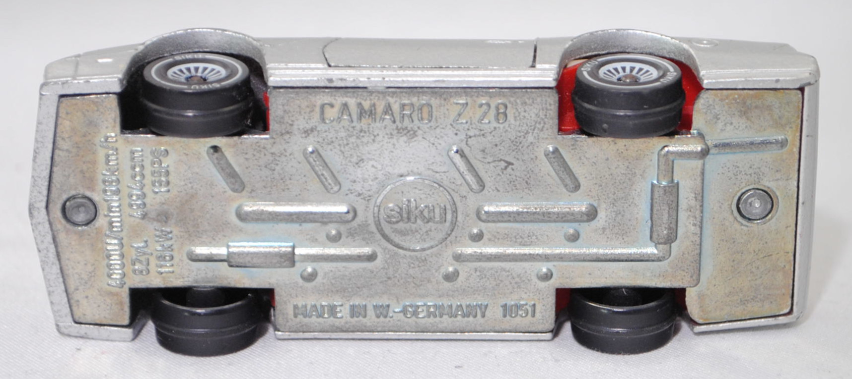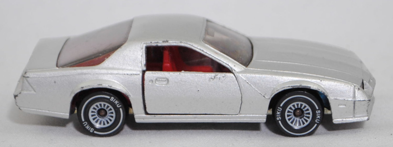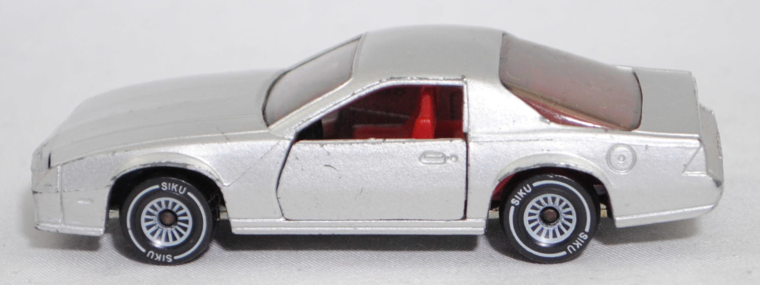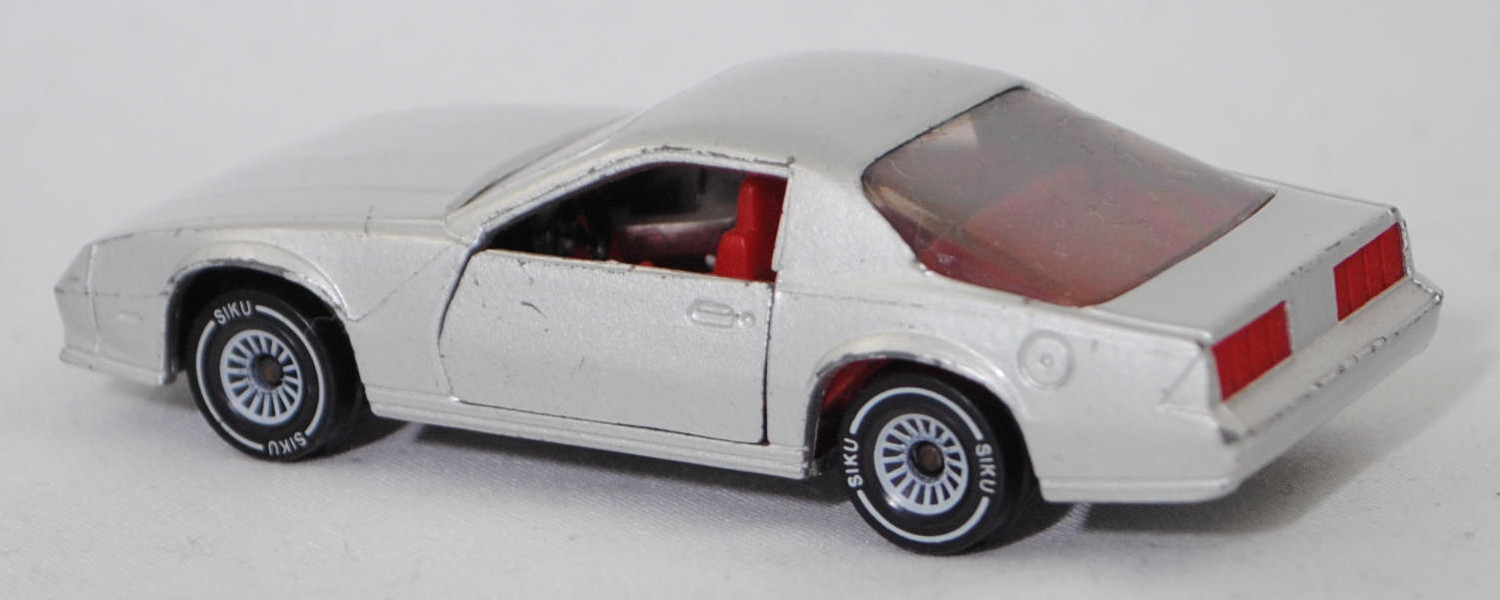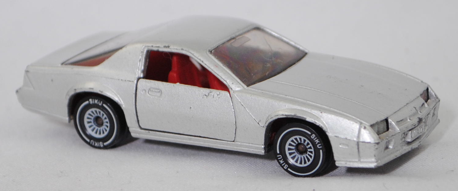 00000 Chevrolet Camaro Berlinetta 5.0L V8 (3. Generation, Baureihe Camaro, F-Body-Plattform der 3. Generation, zweitüriger Sportwagen als Coupé mit 4 Sitzplätzen, Vorfacelift, Frontschürze vorne leicht abgewinkelt und nicht so tief heruntergezogen, Ausstattungslinie Berlinetta: schwarz lackierte Scheinwerferhöhlen + Stoßfänger vorne mit 3 Lüftungsschlitzen zwischen den Frontscheinwerfern + Blinker im Stoßfänger vorne quadratisch + Stoßfänger vorne und hinten in Wagenfarbe + Motorhaube ohne Lüftungsschlitze + Sportspiegel in Wagenfarbe, links elektrisch verstellbar und rechts manuell + vollständige Instrumentierung mit Tachometer, Drehzahlmesser, Tageskilometerzähler, Kraftstoff-, Voltmeter-, Öl- und Temperaturanzeigen + elektrische Quarz-Analoguhr + abgedecktes Staufach + gepolstertes Lenkrad mit quadratischer Nabe + Zweiklang Hupe + verstellbare Vordersitze und umklappbare Rücksitzlehne + Türverkleidungen unten mit Teppichbezug + mit Teppich bezogene Radkästen und Seitenwände + Innenraumbeleuchtung + Zierstreifen in gold/schwarz unten rundherum + Deluxe-Gepäckraumverkleidung + Heckscheibe mit schwarzem Rand + Tankdeckel + goldfarbene Embleme und Typenbezeichnungen + spezielles komfortables Fahrwerk + 14'' x 7'' Aluminiumfelgen im Flossen-Design gold akzentuiert + Stahlgürten-Radialreifen 205/70 R 14, Sonderausstattung gegen Mehrpreis: Chevrolet 5,0 Liter 4-Bbl. V8 Motor mit 5001 cm³ und 147 PS (1982) bzw. 152 PS (1982-1984) + 3-Gang Automatikgetriebe, 3-Gang Automatikgetriebe, Hinterradantrieb, Motor: General Motors-Chevrolet Motor Division Typ 5.0 Liter 4-Bbl. V8 (Turbo-Fire V-8, Small Block mit 305,2 cui, Bestellcode LG4) wassergekühlter Achtzylinder-V-Viertakt-Otto mit einem Fallstrom-Doppel-Registervergaser Rochester E4ME-4 barrel und eine zentrale Nockenwelle sowie OHV-Ventilsteuerung (OHV = overhead valves) und 2 Ventile pro Zylinder sowie 5001 cm³ und 147 PS (1982) bzw. 152 PS (1982-1984), Radstand 2565 mm, Länge 4770 mm, Modell 1982-1984), silbergraumetallic (vgl. silver metallic beim Original, Verkaufskennzeichen 15, Farbcode WA7448), innen verkehrsrot, Sitze verkehrsrot, Lenkrad schwarz, Bpr. CAMARO Z 28, W-Germ, Chassis chrom, ohne CE-Zeichen, Verglasung rauch, B4 (Chevrolet Aluminiumfelgen im Flossen-Design mit 15 Speichen gold akzentuiert Größe 7 J x 14 ET 8,6 mit Lochkreis 5 x 120,65 (Teilenummer 14048328, Farbcode gold akzentuiert (chrom/gold)) und Nabendeckel / Radzierdeckel (Teilenummer Deckel 14035580 mit Farbcode chrom sowie Teilenummer Abdeckkappe 14035578 mit Farbcode schwarz und Schriftzug berlinetta in gold) sowie Stahlgürten-Radialreifen 205/70 R 14), SIKU SUPER, ca. 1:59, m- (Vitrinenmodell, minimale Farbabplatzer) (EAN 4006874010516)