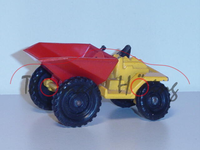 Produktinformationen "Barford Bison, chromgelb/verkehrsrot, Muldenhalterung abgebrochen, Achse hinten krumm, CORGI YUNIORS"