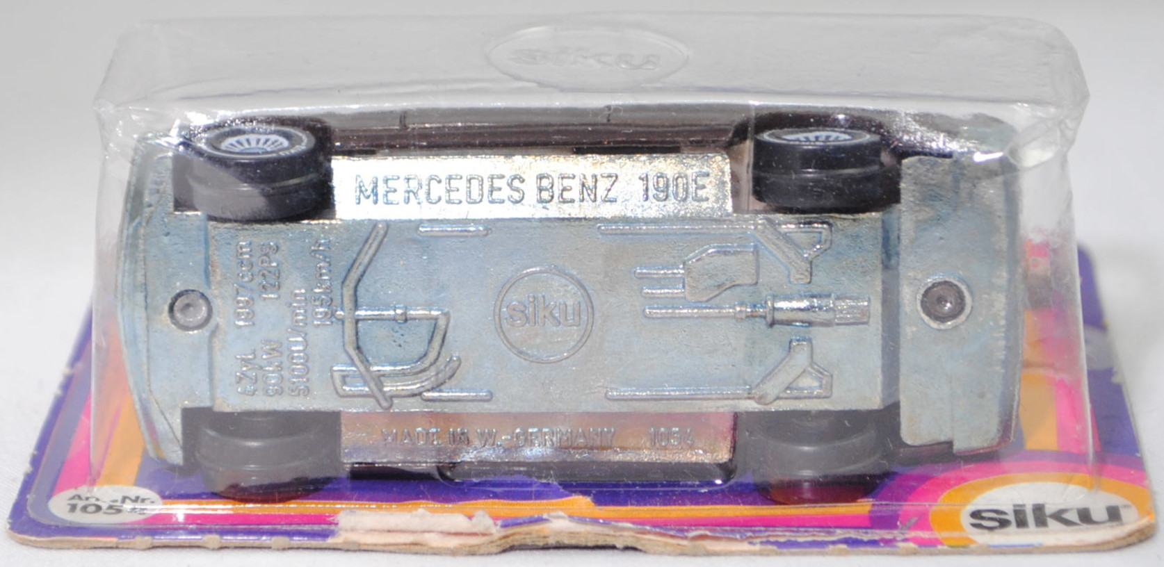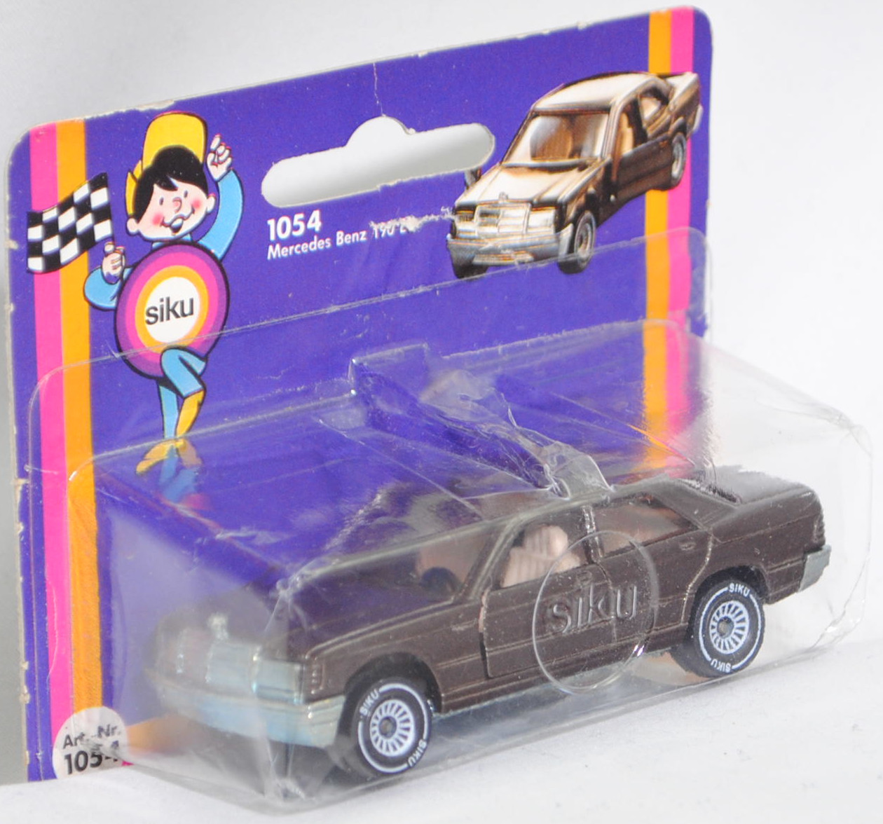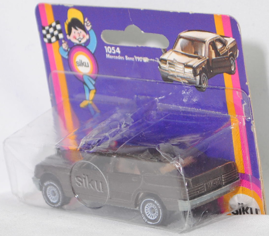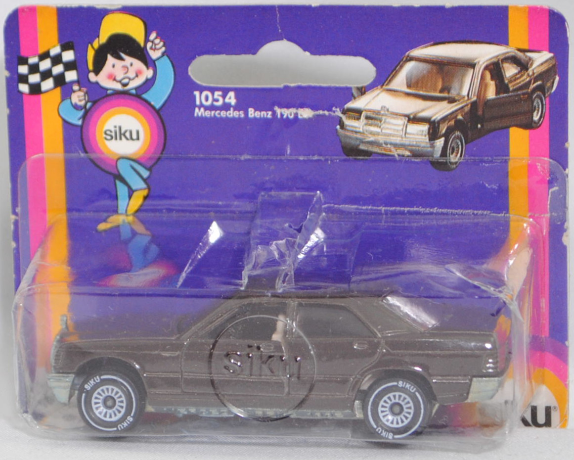 00001 Mercedes-Benz 190 E (1. Generation, Baureihe 190, interne Baureihenbezeichnung W 201, Konstruktionsbezeichnung W 201 E 20, Baumuster 201.024, viertürige Stufenhecklimousine mit 5 Sitzplätzen, Vor-MoPf (vor Modellpflege, Vorfacelift), Stoßfänger vorne und hinten unlackiert, schwarze schmale Zierleisten auf den Seiten (ohne Seitenplanken sogenannte Sacco-Bretter), Ausstattungslinie 190 E: Rechteck-Scheinwerfer mit Standlicht, asymmetrischem Abblendlicht, Fernlicht, Nebelscheinwerfer (Halogen-Ausstattung) + Armaturenanlage gepolstert und stoßelastisch + Ablageschale zwischen den Vordersitzen + gepolsterte Armlehnen an den Türen + Taschen an den Vordertüren + Handschuhfach + abblendbarer Panorama-Rückspiegel + von innen verstellbarer Außenspiegel + gepolsterte Sonnenblenden, auf Beifahrerseite mit Spiegel + Sitze körpergerecht geformt mit seitlichem Sitzhalt, Vordersitze in Längsrichtung und Lehnenneigung verstellbar + Fahrersitz mit Sitzhöhenverstellung + Dreipunkt-Sicherheitsgurte mit Aufrollautomatik und Sicherheitskopfstützen an den Vordersitzen + auf der Fondsitzbank 2 Dreipunkt-Sicherheitsgurte mit Aufrollautomatik, in der Mitte Beckengurt + Teppichboden vorne und hinten + Mittelschaltung mit 4-Gang-Schaltgetriebe + Motor mit 1997 cm³ und 122 PS, vollzwangssynchronisiertes 4-Gang-Schaltgetriebe als Mittelschaltung, Hinterradantrieb, Motor: Mercedes-Benz Typ M 102 E 20 wassergekühlter Vierzylinder-Reihen-Viertakt-Otto mit mechanisch-elektronisch geregelter Saugrohreinspritzung Bosch KE-Jetronic und eine obenliegende Nockenwelle (OHC = Overhead Camshaft) sowie 2 V-förmig hängende Ventile pro Zylinder und 1997 cm³ sowie 122 PS, Motor Baumuster 102.962, Radstand 2665 mm, Länge 4420 mm, Modell 1982-1988), schokoladenbraun, innen beige, Sitze beige, Lenkrad schwarz, Kühlergrill und Frontscheinwerfer mit Wabenprägung, Verglasung rauch, B4 (Mercedes-Benz Stahlblechräder bzw. Stahl-Scheibenräder Größe 5 J x 14 H2 ET 50 mit Lochkreis 5 x 112 (Teilenummer A 201 400 0502) und Reifen 175/70 R 14 82H sowie Raddeckel / Radvollabdeckung 14 Zoll (Teilenummer A 201 401 0224) (bis 31. Dezember 1984) oder Mercedes-Benz Stahlblechräder bzw. Stahl-Scheibenräder Größe 6 J x 15 H2 ET 49 mit Lochkreis 5 x 112 (Teilenummer A 124 400 0602) und Reifen 185/65 R 15 87H sowie Raddeckel / Radvollabdeckung 15 Zoll (Teilenummer A 124 400 0425) (ab 01. Januar 1985)), SIKU SUPER, ca. 1:55, P18 (Vitrinenmodell, Schachtel mit Lagerspuren, Blister brüchig) (EAN 4006874010547)