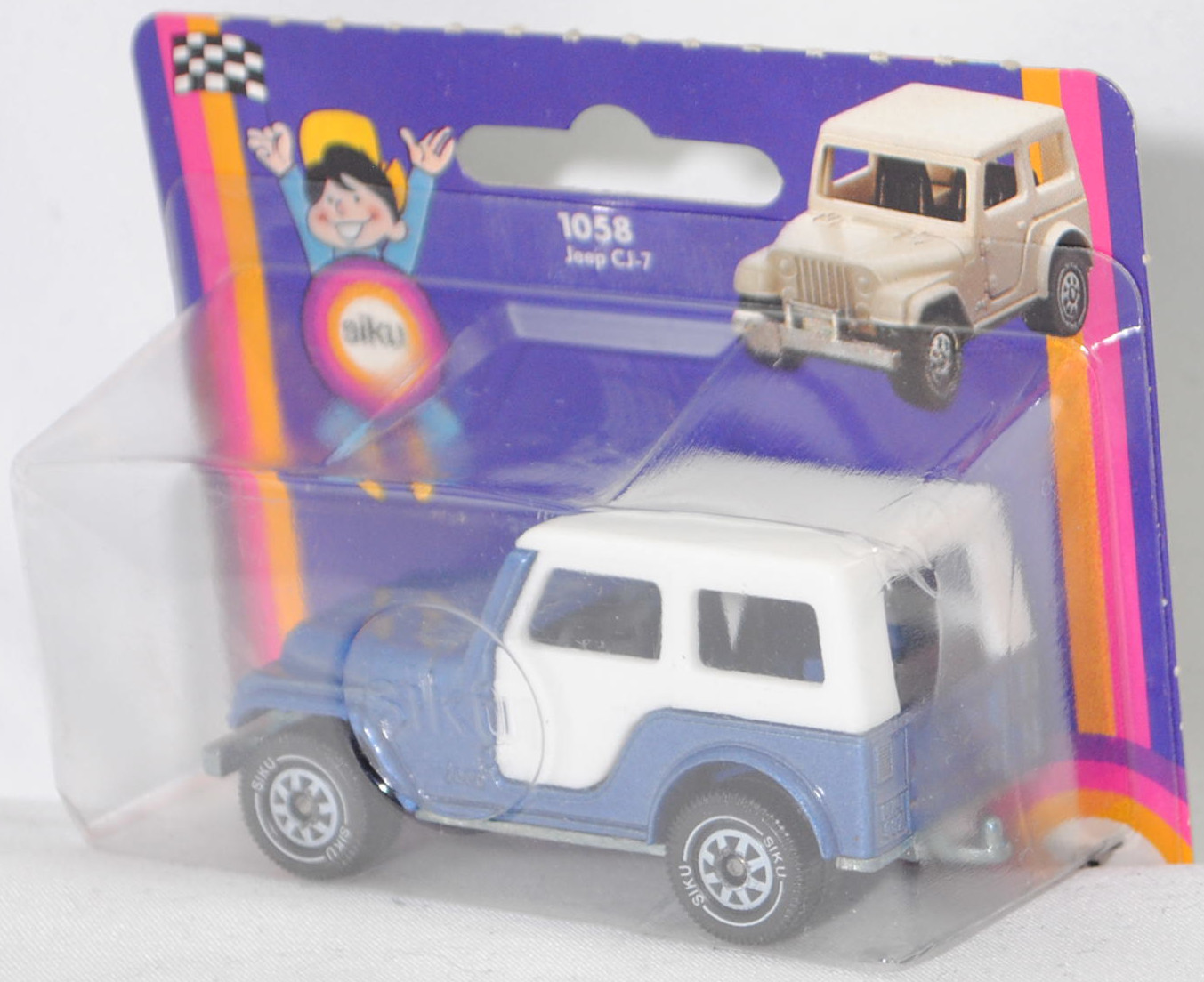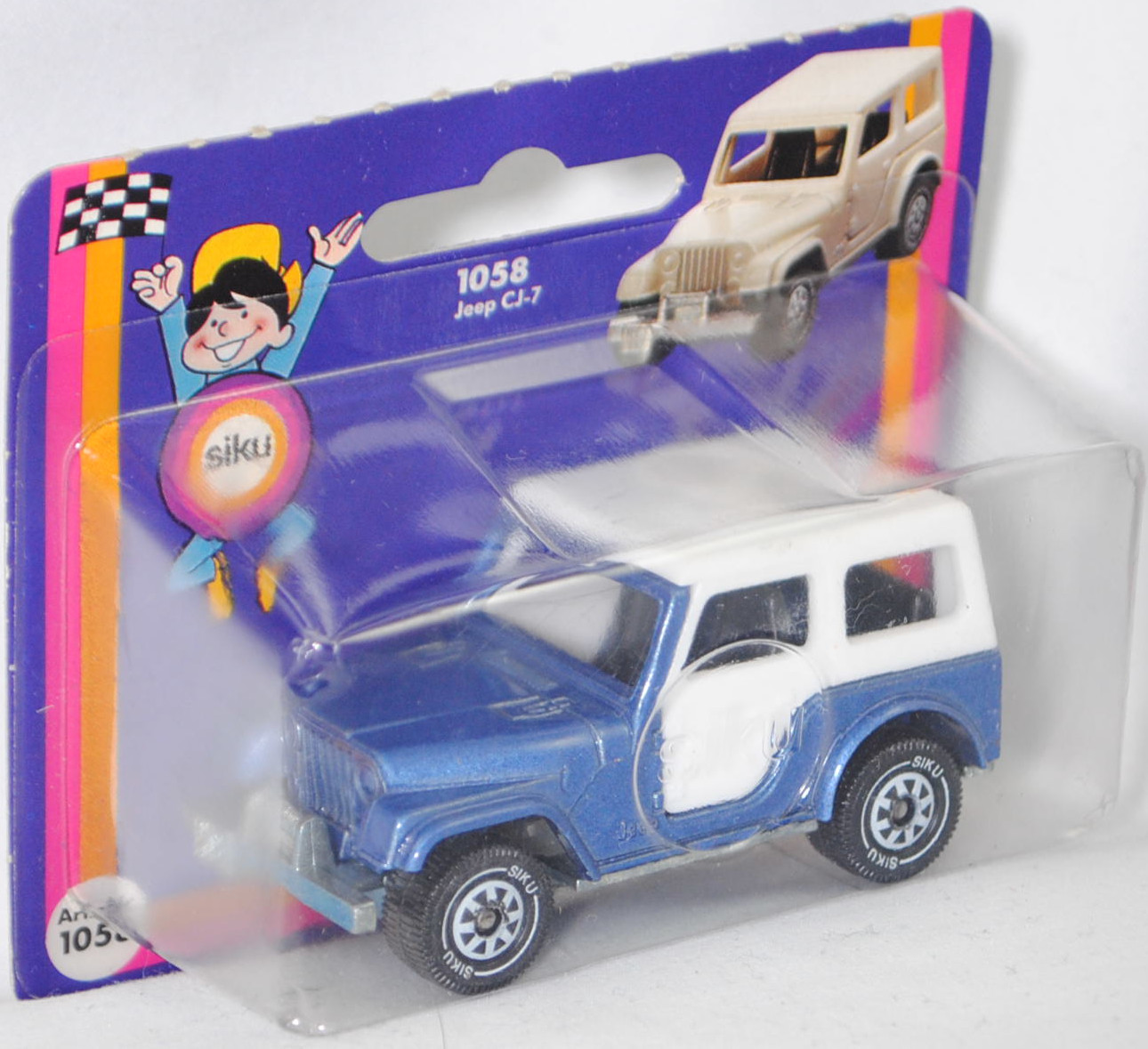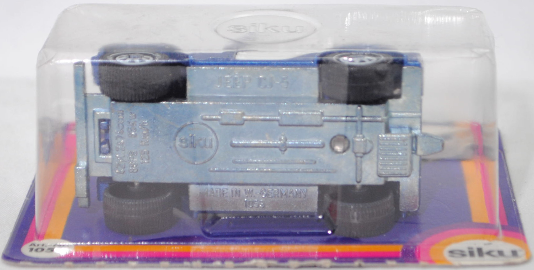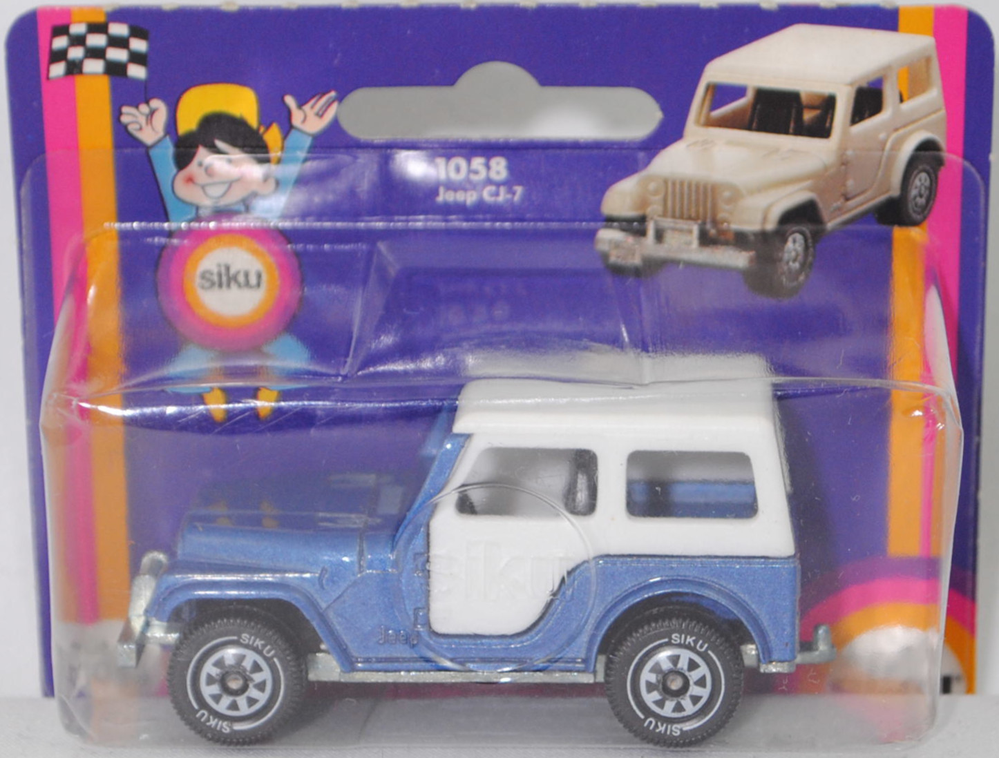 00002 Jeep CJ-5 2.5L (5. Generation, Baureihe Geländewagen der CJ-Serie, CJ = Civilian Jeep, zweitüriger Geländewagen mit 4 Sitzplätzen, kleine im hinteren Bereich abgerundete Türen, kurzer Radstand, ohne Softtop bzw. Fiberglas Hardtop, Änderungen 1979 zum Modelljahr 1980, Einbau des GM Iron Duke Vierzylinder-Reihenmotors, Ausstattungslinie CJ Grundausstattung: H4-Scheinwerfer + Doppelstoßstange vorne lackiert + 2,5 Liter (151 CID) 4-Zylinder-Benzin-Motor mit 88 PS + Außenspiegel auf der Fahrerseite + Innenspiegel 20,3 cm + gepolsterte Sonnenblenden + Beifahrerhaltegriff + energieabsorbierende Lenksäule mit Diebstahlsicherung + elektrische Scheibenwaschanlage und elektrische Scheibenwischer mit zwei Geschwindigkeiten + Schalensitze vorne + Sitzbank hinten + hinten montiertes Reserverad mit fester Rückwand + Unterfahrschutz für Getriebe und Kraftstofftank + Auspuffanlage mit einem Endrohr + 5-Loch Stahlfelgen Größe 38,1 x 15,2 cm mit schlauchlosen Suburbanite X-Grip Reifen H78 x 15B mit schwarzer Seitenwand, Sonderausstattung gegen Mehrpreis: elektrische Seilwinde bis 3,5 t Zugleistung + Fiberglas Hardtop + Anhängerkupplung (AHK), vollsynchronisiertes 4-Gang-Schaltgetriebe mit Mittelschaltung von Borg-Warner Corporation Typ SR4, Allradantrieb, Motor: Pontiac Motor Division von General Motors (GM) Typ 151 CID bzw. CUI (auch Iron Duke Motor genannt, Motorcode B151) wassergekühlter Vierzylinder-Reihen-Viertakt-Otto mit einem Rochester Varajet II Fallstrom-Registervergaser und eine zentrale Nockenwelle sowie OHV-Ventilsteuerung (Overhead valve engine) und 2 Ventile pro Zylinder sowie 2471 cm³ und 88 PS, Radstand 2121 mm, Länge 3665 mm, Modell 1979-1983) mit Fiberglas Hardtop (von Siku als Jeep CJ-7 bezeichnet), hell-violettblaumetallic (vgl. teal blue metallic beim Original), innen schwarz, Sitze schwarz, Lenkrad schwarz, Hardtop reinweiß, W-Germ, Chassis chrom, ohne CE-Zeichen, B5 (Jeep Stahlfelgen im 4-Schlitz-Design Größe 5,5 x 15 ET 12 mit Lochkreis 5 x 139,7 und Nabendeckel sowie schlauchlose Suburbanite X-Grip Reifen H78 x 15B mit schwarzer Seitenwand), SIKU SUPER, ca. 1:55, P18 (Vitrinenmodell, Schachtel mit Lagerspuren) (EAN 4006874010585)