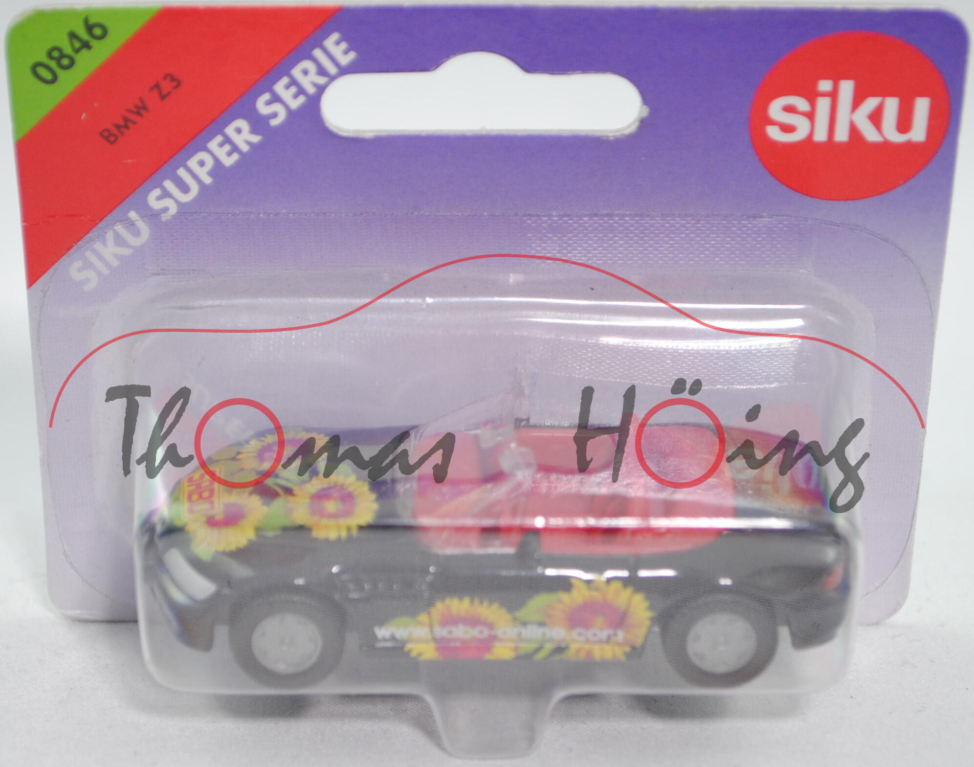BMW Z3 Roadster 1.9 (Typ E36/7, Modell 1995-1999), schwarz, innen rubinrot, Lenkrad rubinrot, SABO / www.sabo-online.com, Bpr. 0846 / 0850, B6, SIKU SUPER, ca. 1:55, P26 (EAN 4006874008469)