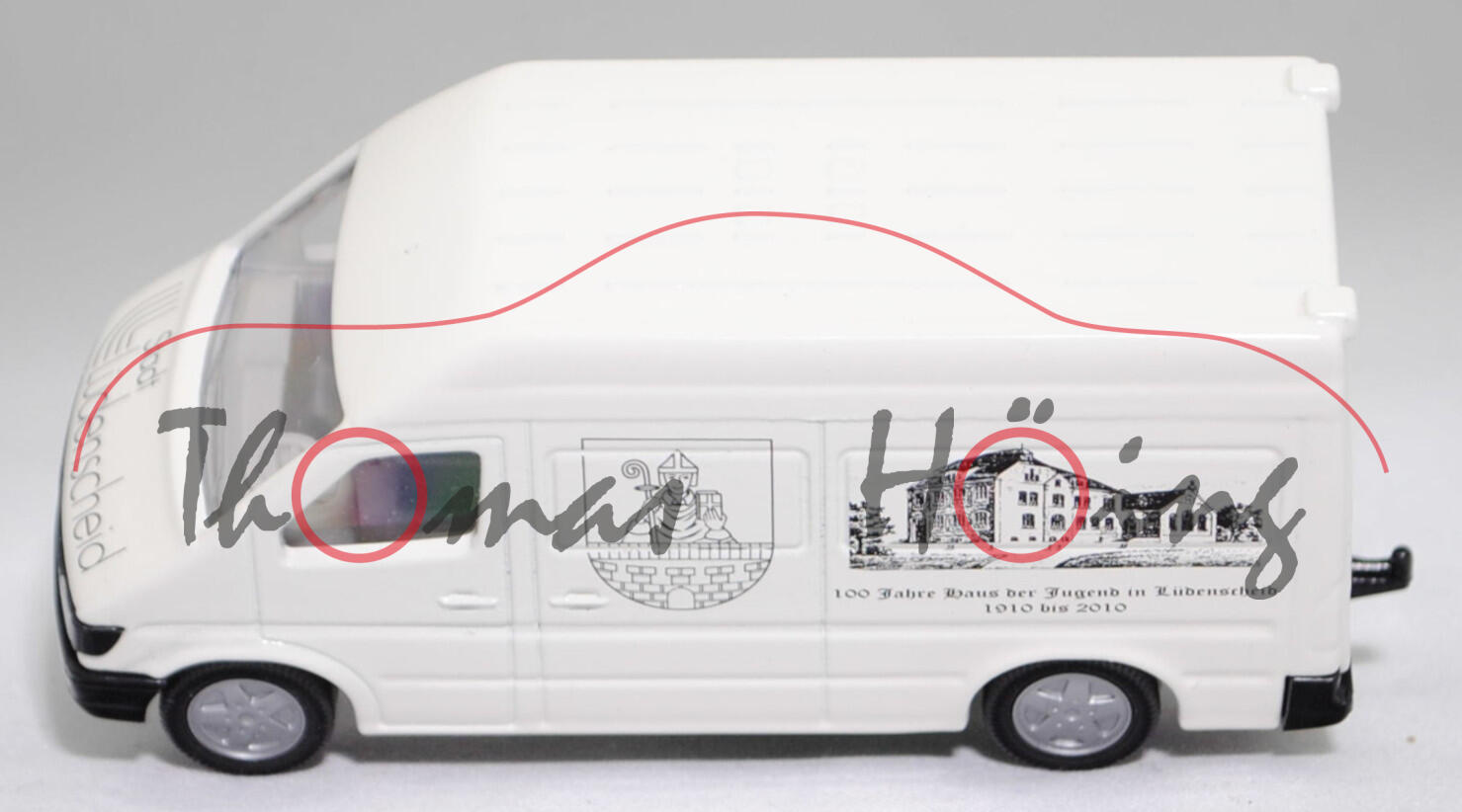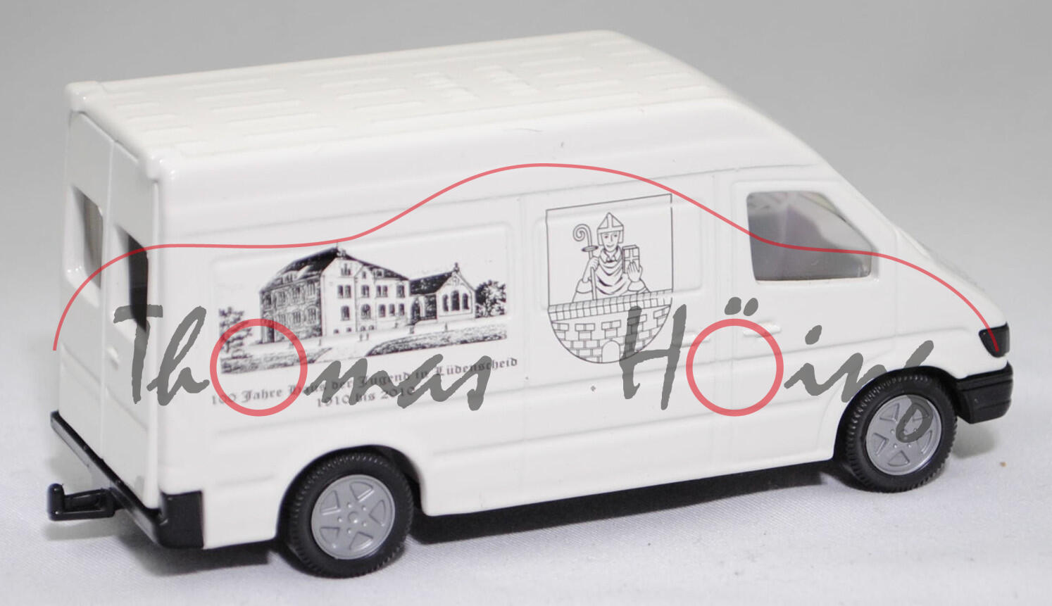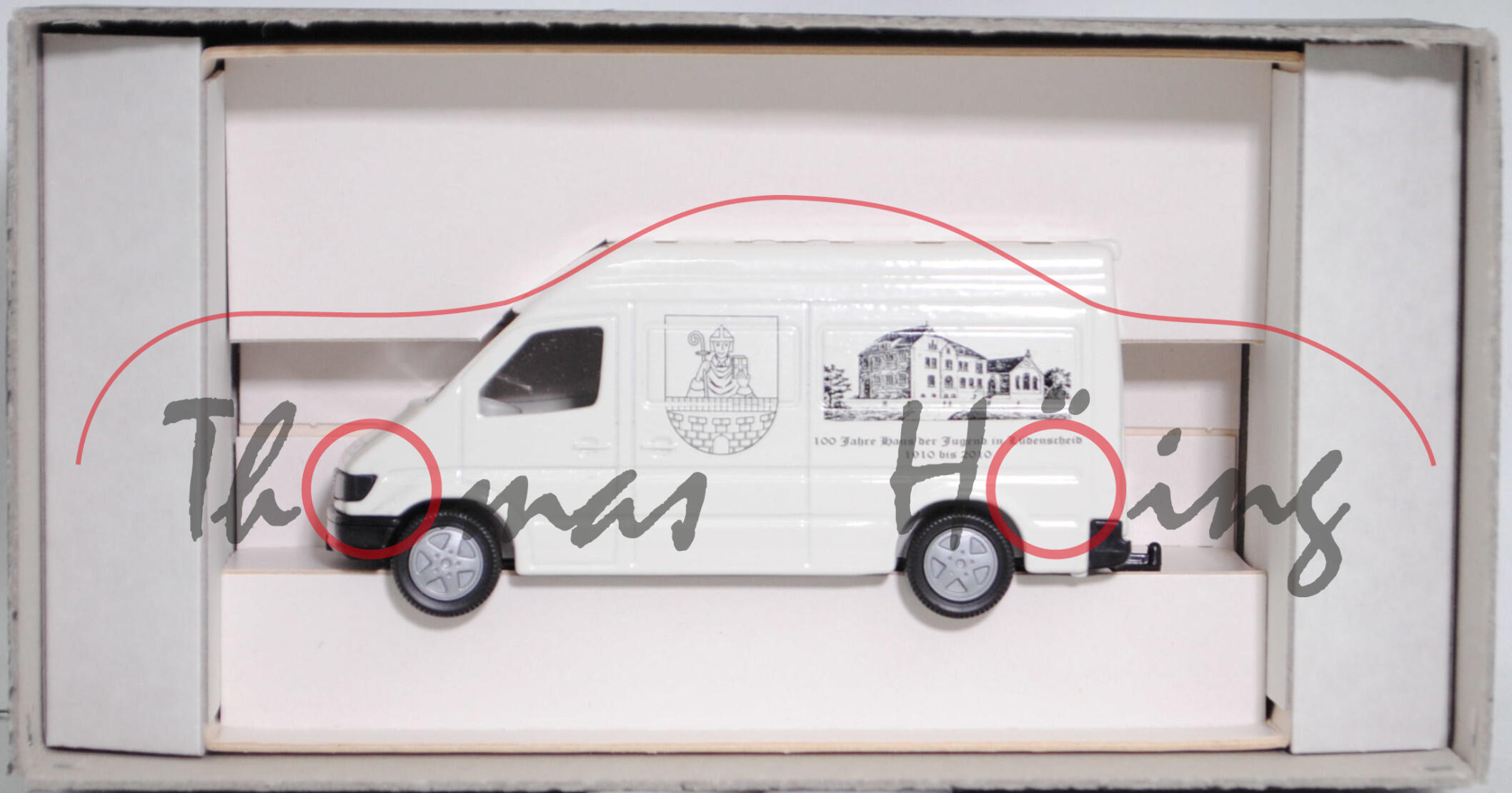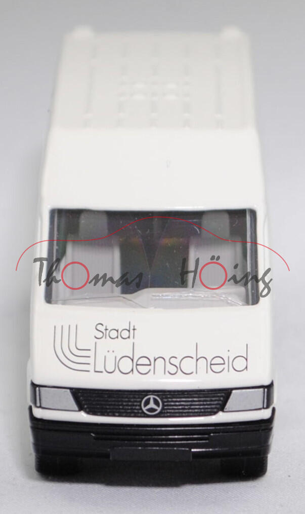 Mercedes-Benz Sprinter I (1. Generation, Baureihe Sprinter W 901, interne Baureihenbezeichnung T1N (Transporter 1 Neu), Typ Standard L2H2 mit mittlerem Radstand und Hochdach, sechstüriger Kleintransporter als Kastenwagen mit 2 Sitzplätzen, Vor-MoPf (vor Modellpflege, Vorfacelift), Motorhaube in einer Linie durchlaufend, Frontmaske mit Blech unterhalb vom Kühlergrill, Stoßfänger vorne ohne Vertiefungen als Trittstufe im Bereich der Frontscheinwerfer, Ausstattungslinie Transporter Kastenwagen: Halogen Scheinwerfer + Motorhaube mit Ablage + Außenspiegel beidseitig + zusätzliche Blinkleuchten seitlich vorne + Windschutzscheibe Verbundglas + Umluftschaltung + Scheibenbelüftung Warm-/Kaltluft für Fahrer und Beifahrer + geräuscharmes 4-stufiges Luftgebläse + Defrostung Windschutzscheibe + Instrumente Tachometer, Kraftstoffvorratsanzeiger und quarzgesteuerte Quarzuhr + Leuchtweiteregler + Kombi-Lenkstockschalter links für Beleuchtung, Lichthupe, Blinklicht mit Fahrbahnwechsel-Tippkontakt + Kombi-Lenkstockschalter rechts für Scheibenwischer und Scheibenwaschanlage + Handschuhkasten + Haltegriff + Kleiderhaken im Fahrerhaus + Sonnenblende für Fahrer und Beifahrer + Sitzbezüge Textil + Kopfstützen für Fahrer und Beifahrer + Beifahrersitz fest + Kurbelfenster in Fahrerhaustüren + Deckenleuchte im Fahrer-/Beifahrerbereich und im Lade-/Fahrgastraum + Deckenleuchte mit Türkontakt an Heck- und Laderaumtür + Doppelflügeltüren hinten + Trennwand durchgehend + Kraftstofftank als Kunststoffbehälter für 76 Liter + 4-Kammer-Schlussleuchte + Reserveradhalter unter Rahmenende, Sonderausstattung gegen Mehrpreis: Anhängerkupplung (AHK) mit Kugelkopf (Code Q 54) + Trennwand Wegfall (Code D 93) + Schiebetür Laderaum links (Code T 19), 5-Gang-Schaltgetriebe, Hinterradantrieb, Motor: Mercedes-Benz OM 602 DE 29 LA wassergekühler Fünfzylinder-Reihen-Viertakt-Turbo-Diesel mit Direkteinspritzung über Verteilereinspritzpumpe und eine obenliegende Nockenwelle (OHC = Overhead Camshaft) sowie 2 Ventile pro Zylinder und Ladeluftkühlung sowie 2874 cm³ und 122 PS, Baumuster Motor: 602.980, Radstand 3.550 mm, Länge 5585 mm, Modell 1995-2000) 212 D / 312 D / 412 D Hochdach-Kastenwagen, reinweiß, innen lichtgrau, Sitze lichtgrau, Lenkrad integriert, Druck 100 Jahre Haus der Jugend in Lüdenscheid / 1910 bis 2010 in schwarz auf den Seiten, Druck Stadt / Lüdenscheid in schwarz auf der Motorhaube, mit Prägung der Türgriffe, mit Seitentür links, 2 Metallspreitzen hinten am Chassis, B8 (Mercedes-Benz Tiefbettfelgen im 15-Loch-Design Größe 6 J x 15 H2 ET 83 mit Lochkreis 5 x 130 (Teilenummer A 902 400 00 02, Farbcode silber) und Nabendeckel / Radzierdeckel (Teilenummer A 601 401 03 25, Farbcode silber) sowie Reifen 225/70 R 15), SIKU SUPER 1:55, ca. 1:55, Werbeschachtel (Vitrinenmodell, minimaler werkseitiger Fehler in der Karosserie auf der Dachvorderkante, Schachtel mit Lagerspuren) (EAN 4006874019298)