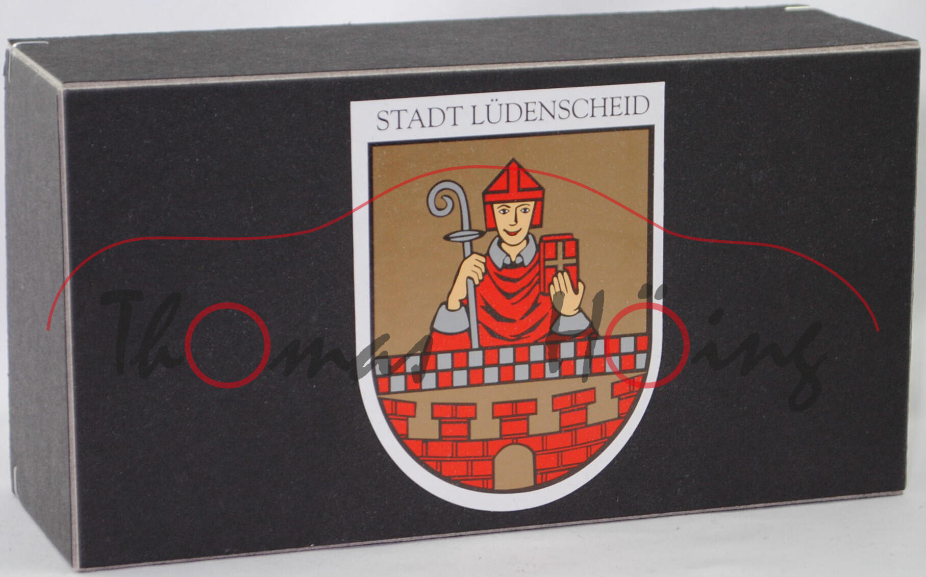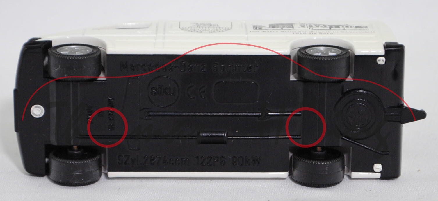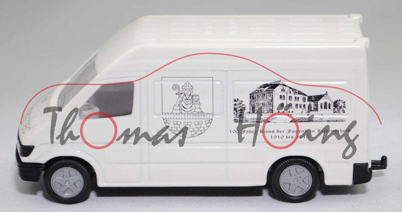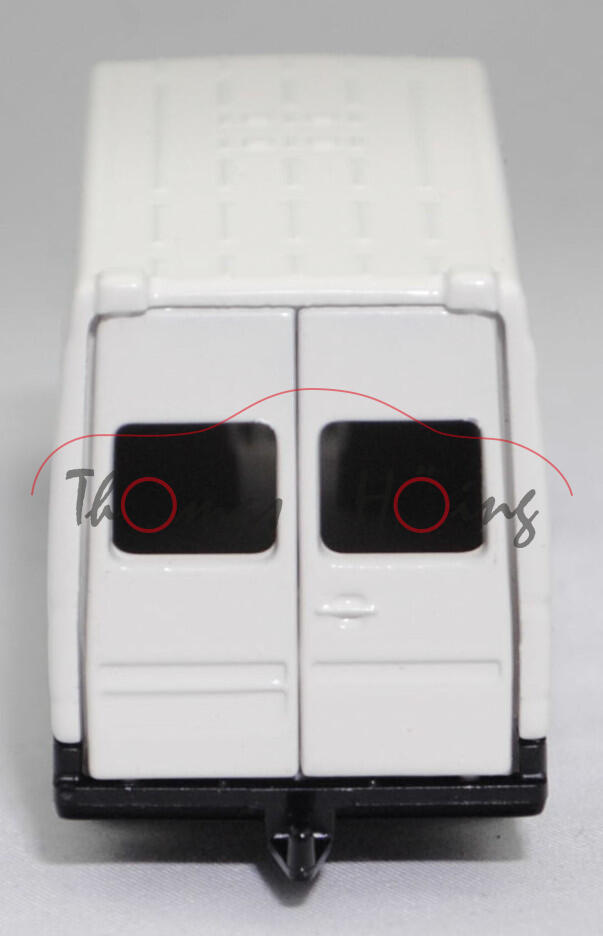 Mercedes-Benz Sprinter I (1. Generation, Baureihe Sprinter W 901, interne Baureihenbezeichnung T1N (Transporter 1 Neu), Typ Standard L2H2 mit mittlerem Radstand und Hochdach, sechstüriger Kleintransporter als Kastenwagen mit 2 Sitzplätzen, Vor-MoPf (vor Modellpflege, Vorfacelift), Motorhaube in einer Linie durchlaufend, Frontmaske mit Blech unterhalb vom Kühlergrill, Stoßfänger vorne ohne Vertiefungen als Trittstufe im Bereich der Frontscheinwerfer, Ausstattungslinie Transporter Kastenwagen: Halogen Scheinwerfer + Motorhaube mit Ablage + Außenspiegel beidseitig + zusätzliche Blinkleuchten seitlich vorne + Windschutzscheibe Verbundglas + Umluftschaltung + Scheibenbelüftung Warm-/Kaltluft für Fahrer und Beifahrer + geräuscharmes 4-stufiges Luftgebläse + Defrostung Windschutzscheibe + Instrumente Tachometer, Kraftstoffvorratsanzeiger und quarzgesteuerte Quarzuhr + Leuchtweiteregler + Kombi-Lenkstockschalter links für Beleuchtung, Lichthupe, Blinklicht mit Fahrbahnwechsel-Tippkontakt + Kombi-Lenkstockschalter rechts für Scheibenwischer und Scheibenwaschanlage + Handschuhkasten + Haltegriff + Kleiderhaken im Fahrerhaus + Sonnenblende für Fahrer und Beifahrer + Sitzbezüge Textil + Kopfstützen für Fahrer und Beifahrer + Beifahrersitz fest + Kurbelfenster in Fahrerhaustüren + Deckenleuchte im Fahrer-/Beifahrerbereich und im Lade-/Fahrgastraum + Deckenleuchte mit Türkontakt an Heck- und Laderaumtür + Doppelflügeltüren hinten + Trennwand durchgehend + Kraftstofftank als Kunststoffbehälter für 76 Liter + 4-Kammer-Schlussleuchte + Reserveradhalter unter Rahmenende, Sonderausstattung gegen Mehrpreis: Anhängerkupplung (AHK) mit Kugelkopf (Code Q 54) + Trennwand Wegfall (Code D 93) + Schiebetür Laderaum links (Code T 19), 5-Gang-Schaltgetriebe, Hinterradantrieb, Motor: Mercedes-Benz OM 602 DE 29 LA wassergekühler Fünfzylinder-Reihen-Viertakt-Turbo-Diesel mit Direkteinspritzung über Verteilereinspritzpumpe und eine obenliegende Nockenwelle (OHC = Overhead Camshaft) sowie 2 Ventile pro Zylinder und Ladeluftkühlung sowie 2874 cm³ und 122 PS, Baumuster Motor: 602.980, Radstand 3.550 mm, Länge 5585 mm, Modell 1995-2000) 212 D / 312 D / 412 D Hochdach-Kastenwagen, reinweiß, innen lichtgrau, Sitze lichtgrau, Lenkrad integriert, Druck 100 Jahre Haus der Jugend in Lüdenscheid / 1910 bis 2010 in schwarz auf den Seiten, Druck Stadt / Lüdenscheid in schwarz auf der Motorhaube, mit Prägung der Türgriffe, mit Seitentür links, 2 Metallspreitzen hinten am Chassis, B8 (Mercedes-Benz Tiefbettfelgen im 15-Loch-Design Größe 6 J x 15 H2 ET 83 mit Lochkreis 5 x 130 (Teilenummer A 902 400 00 02, Farbcode silber) und Nabendeckel / Radzierdeckel (Teilenummer A 601 401 03 25, Farbcode silber) sowie Reifen 225/70 R 15), SIKU SUPER 1:55, ca. 1:55, Werbeschachtel (Vitrinenmodell, minimaler werkseitiger Fehler in der Karosserie auf der Dachvorderkante, Schachtel mit Lagerspuren) (EAN 4006874019298)