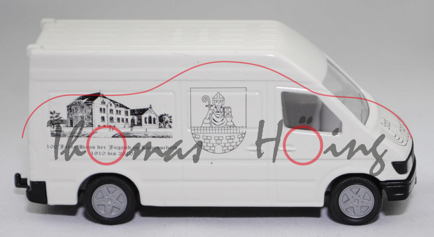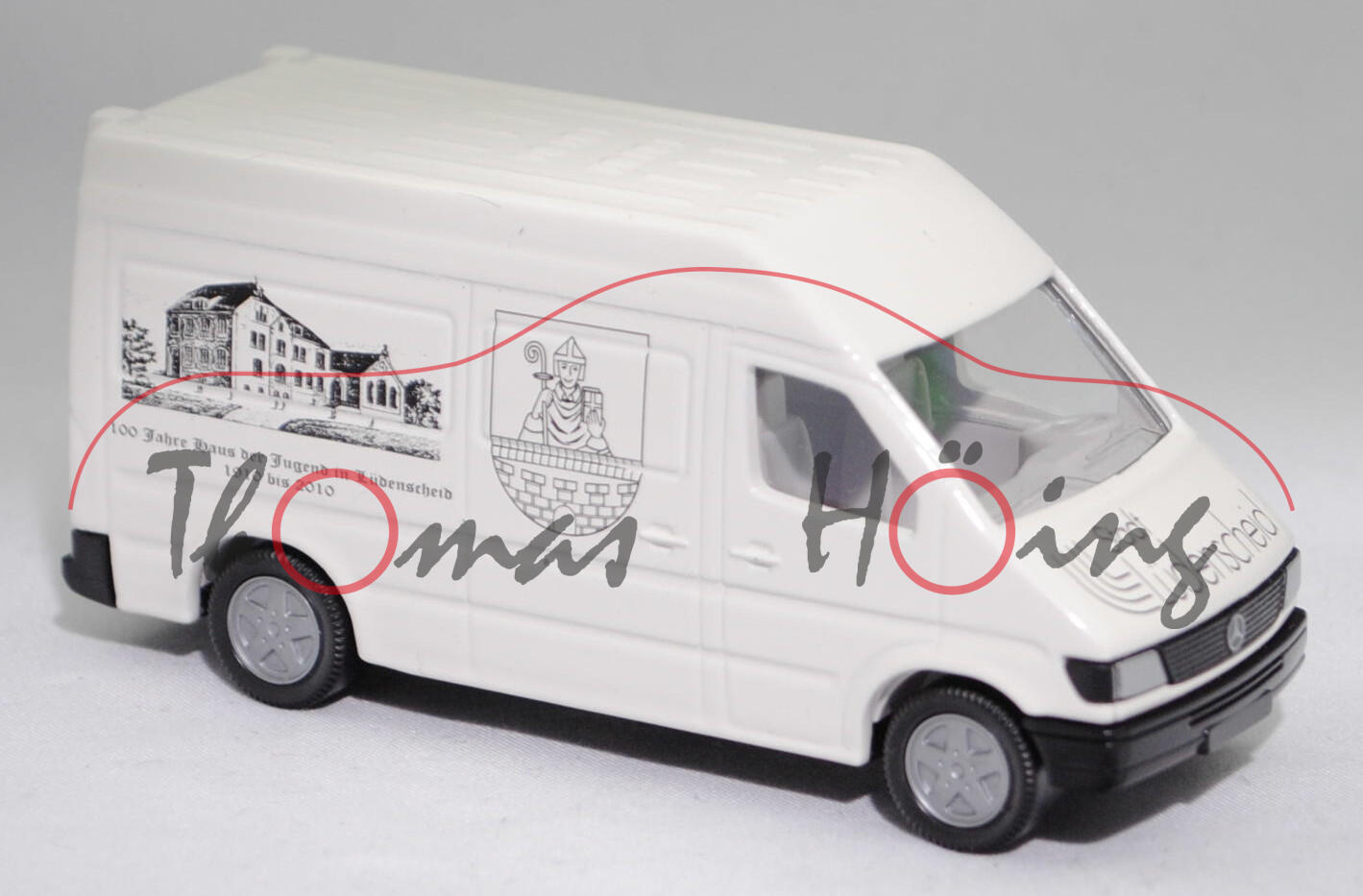 Mercedes-Benz Sprinter I (W 901, Vor-MoPf, Modell 1995-2000) Hochdach-Kastenwagen, weiß, 100 Jahre Haus der Jugend in Lüdenscheid / 1910 bis 2010, SIKU SUPER 1:55, Werbebox