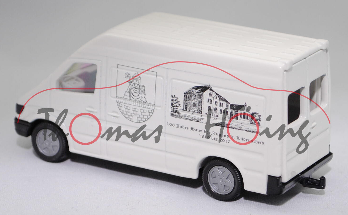 Produktinformationen "Mercedes-Benz Sprinter I (W 901, Vor-MoPf, Modell 1995-2000) Hochdach-Kastenwagen, weiß, 100 Jahre Haus der Jugend in Lüdenscheid / 1910 bis 2010, SIKU SUPER 1:55, Werbebox"