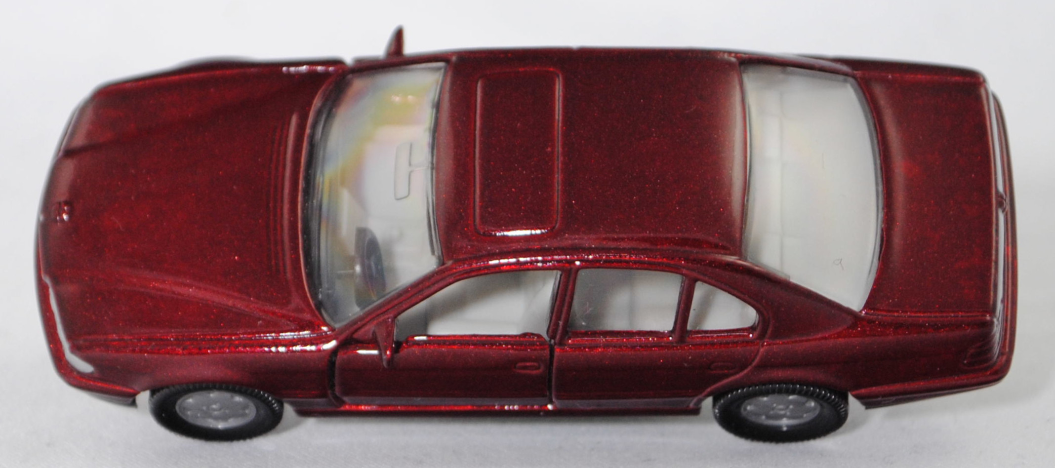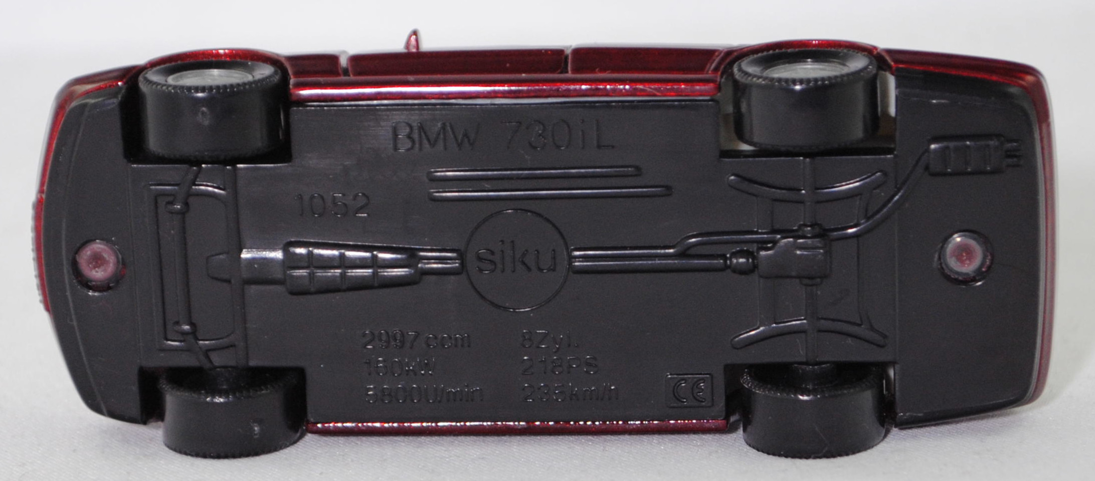 00001 BMW 730i (3. Generation, Baureihe 7er-Reihe, interne Baureihenbezeichnung E38, viertürige Stufenhecklimousine mit 5 Sitzplätzen, Vorfacelift (bei BMW Vor-LCI = vor Lifecycle Impulse genannt), Frontscheinwerfer an der Unterseite mit geradem Abschluss, senkrechte Streben in der BMW-Niere an den Enden abgerundet, ohne Chromzierleiste auf dem Kofferraumdeckel über dem Nummernschild, Blinker hinten mit gelber Verglasung, Rückfahrscheinwerfer mit weißer Verglasung, Ausstattungslinie 730i: kurze hintere Tür + Scheibe der hinteren Tür vor dem Dreieck oben kürzer als die Scheibe der Vordertür oben bis zum Beginn der Abschrägung + 8-Zylinder-Motor mit 2997 cm³ und 218 PS + Nebelscheinwerfer + Außenspiegel beheizt und elektrisch von innen einstellbar + Außenspiegelgehäuse in Wagenfarbe lackiert + Fensterheber elektrisch mit Komfortschaltung vorne und hinten + Kartenleseleuchten vorne + Leseleuchten im Fond + Make-up-Spiegel beleuchtet für Fahrer und Beifahrer + Radio BMW Business RDS + Heckscheibenantenne inklusive Antennen-Diversity + 5-Gang-Schaltgetriebe + Servolenkung drehzahlabhängig + Multifunktionslenkrad zur Bedienung von Radio, Geschwindigkeitsregelung und Umluftschaltung + Airbag-Lenkrad + Airbag für Beifahrer mit Sitzbelegungserkennung + Armauflage vorne inklusive Ablagefach + Fahrer- und Beifahrersitz höhen- und längsverstellbar, Fahrersitz zusätzlich neigungsverstellbar + Kopfstützen vorne und hinten + Mittelarmlehne im Fond mit Ablagefach + Wärmeschutzglas grün rundum + Leichtmetallräder Größe 7,5 J x 16 mit Reifen 215/65 W 16, Sonderausstattung gegen Mehrpreis: Schiebe-hebedach elektrsch (Bestell-Code 401), 5-Gang-Schaltgetriebe, Hinterradantrieb, Motor: BMW Typ M60B30 wassergekühlter Achtzylinder-V-Viertakt-Otto mit Mehrpunkteinspritzung und zwei obenliegende Nockenwellen (DOHC = Double Overhead Camshaft) je Zylinderbank sowie 4 Ventile pro Zylinder und 2997 cm³ sowie 218 PS, Radstand 2930 mm, Länge 4984 mm, Modell 1994-1996), dunkel-weinrotmetallic, innen lichtgrau, Sitze lichtgrau, Lenkrad schwarz, Bpr. BMW 730iL, Verglasung rauch, B6 (BMW Leichtmetallräder im 15-Speichen-Design Typ Styling 6 Größe 7,5 J x 16 ET 20 mit Lochkreis 5 x 120 (Teilenummer 36111181840, Farbcode silber) und Nabendeckel / Radzierdeckel (Teilenummer 36131181897, Farbcode silber) und BMW Emblem (Teilenummer 36131181080, Farbcode schwarz/blau/weiß) sowie Reifen 215/65 ZR 16 100W), SIKU SUPER, ca. 1:58, m (Vitrinenmodell) (EAN 4006874010523)