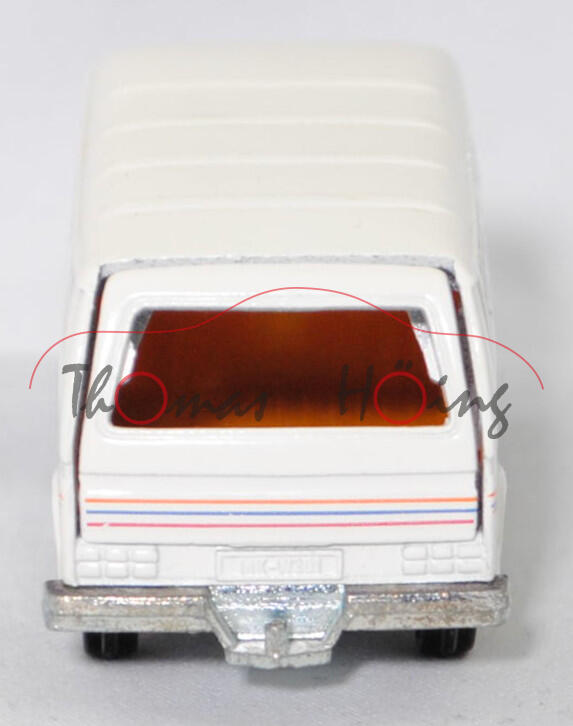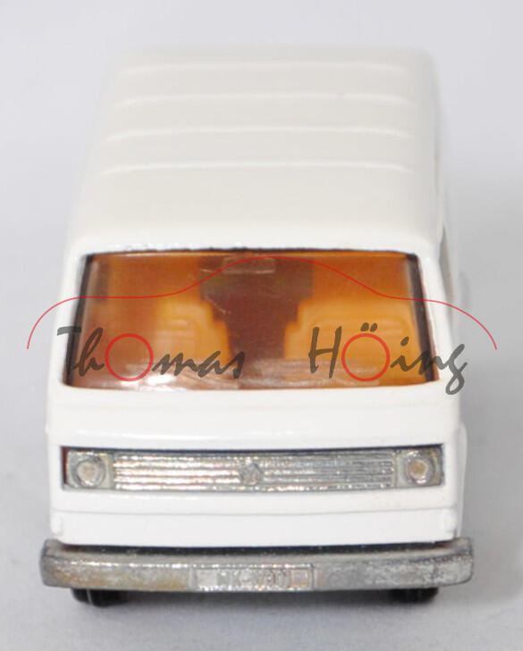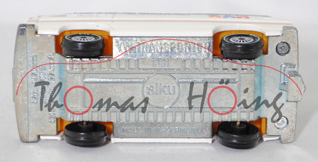 VW Transporter Kastenwagen 2,0 Liter (3. Generation, Baureihe Transporter, interne Baureihenbezeichnung Typ 2 Transporter 3 (T3, Modell '80), interne Konstruktionsbezeichnung der Baureihe EA 162, oder auch Bulli genannt, Typ 251 Kastenwagen mit geschlossenem Aufbau, viertüriger Kleintransporter als Kastenwagen mit 2 Sitzplätzen, Vorfacelift, Kühlergrill nur zwischen den Scheinwerfern, Lufteinlässe hinten auf den Seiten aus Blech in Wagenfarbe lackiert, Schriftzüge auf flacher schwarzer Platte mit silbernem Schriftzug, Ausstattungslinie Kastenwagen 2,0 Liter: zwei Rückblickspiegel + Trittstufen im Fahrerhaus + zweisitziges Fahrerhaus mit Durchgang zum Laderaum + Kunstledersitzbezüge + volle Kunststoffauskleidung im Fußraum mit Kunststofffolie, Fußboden mit wärmeisolierenden Gummimatten ausgelegt + Sicherheitstürverriegelung + Kleiderhaken + Zuziehgriffe + Beifahrerhaltegriff + Ablagekasten + blendfreie und gepolsterte Abdeckung der Armaturentafel + Scheibenwischer mit Zweistufen-Schaltung + Ladeboden aus Stahl + Seitenwände innen mit Verstärkungsprofil + seitliche Schiebetür auf der rechten Seite + nach oben öffnende selbstfeststellende Heckklappe + Innenleuchte Fahrerhaus mit Türkontaktschalter + Innenleuchte Laderaum mit Schiebetürkontaktschalter + Motor mit 1970 cm³ und 70 PS, Sonderausstattung gegen Mehrpreis: Anhängevorrichtung (AHK), zulässiges Gesamtgewicht 2360 kg, vollsynchronisiertes 4-Gang-Schaltgetriebe, Heckantrieb, Motor: VW Typ-4 luftgekühlter Vierzylinder-Boxer-Viertakt-Otto mit zwei Solex Fallstromvergaser 34 PDSIT-2/-3 und eine zentrale Nockenwelle sowie 2 Ventile pro Zylinder und 1970 cm³ sowie 70 PS, Motorkennbuchstabe CU, Radstand 2460 mm, Länge 4570 mm, Modell 1979-1982), reinweiß, innen dahliengelb, Sitze dahliengelb, Lenkrad integriert, Druck ENERGIEVERSORGUNG / MITTELRHEIN GMBH / EVM in schwarz und Logos in gelborange/verkehrsblau/rubinrot auf den Seiten, Druck Streifen in gelborange/verkehrsblau/rubinrot auf den Seiten und auf der Heckklappe, W-Germ, Chassis chrom, ohne CE-Zeichen, Verglasung rauch, R11 glatt (VW Stahlfelgen im 20-Loch-Design Größe 5,5 J x 14 H1 ET 39 mit Lochkreis 5 x 112 (Teilenummer 211 601 027 H, chromfarbig) und Gürtelreifen 185 SR 14 sowie Radzierkappe (Ø 256 mm, Teilenummer 251 601 151 A, verchromt)), SIKU SUPER, ca. 1:60, m (Limited Edition) (Vitrinenmodell) (EAN 4006874013319)