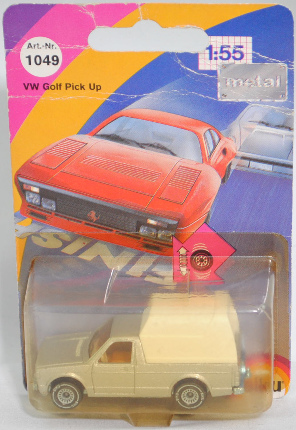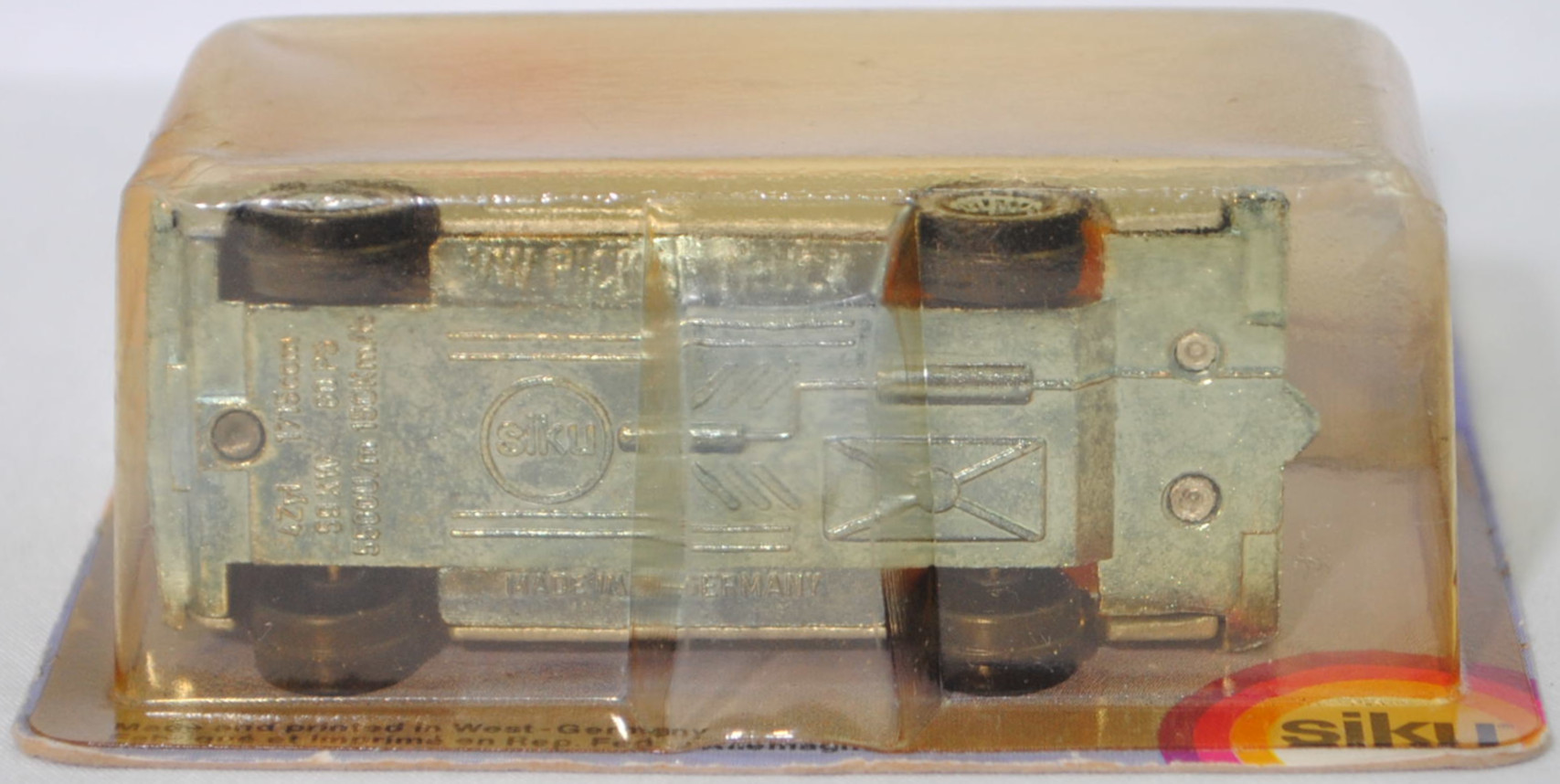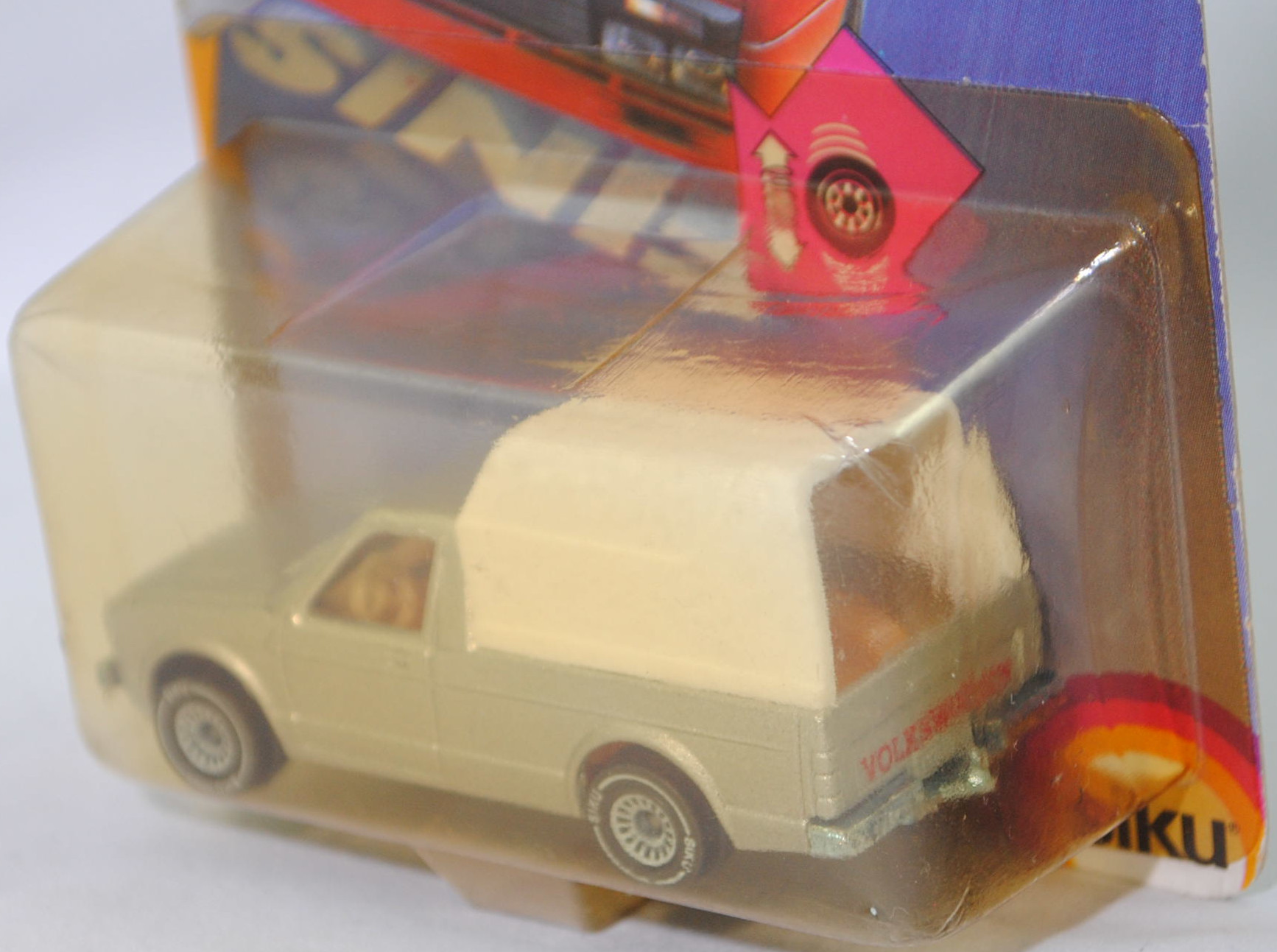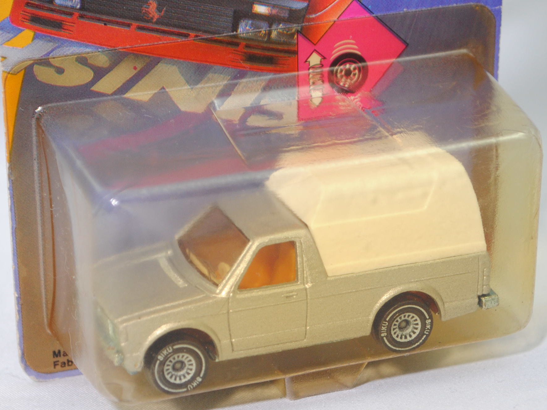 00001 VW Pickup Truck LX (vgl. VW Caddy I) (1. Generation, Baureihe Pickup Truck / Caddy, interne Baureihenbezeichnung 14D, Typ 147 (LHD = left-hand drive bzw. Linkslenker), zweitüriger Pritschenwagen mit 2 Sitzplätzen, Ausstattungslinie LX: Halogenscheinwerfer als Rechteckscheinwerfer + Blinker vorne neben den Scheinwerfern + verchromte Stahlstoßfänger mit Kastenprofil vorne + verchromter geteilter Stahlstoßfänger mit Kastenprofil hinten mit Trittstufe mittig + Stoßfänger vorne und hinten mit Aufprallleisten + Armaturenbrettfarbe farblich abgestimmt + Instrumententafel mit zwei runden Instrumenten für Geschwindigkeitsanzeige einschl. Kilometer- und Tageskilometerzähler sowie Quarzuhr einschl. Wassertemperaturanzeige und Tankanzeige + klapp- und schwenkbare Sonnenblenden mit Make-up-Spiegel auf der Beifahrerseite + abblendbarer Sicherheitsinnenspiegel + AM/FM-Radio mit Druckknopf + anatomisch geformte Schalensitze mit Stoffsitzbezug in Tweed-Struktur-Streifen + Sitzscharnierabdeckung farblich abgestimmt + Handschuhfach abschließbar und beleuchtet + getönte Scheiben + Ausstellfenster + Scheibenwischersteuerung mit Intervallschaltung + 2 Kleiderhaken + strapezierfähiger Nylon-Teppichboden + vollsynchronisiertes 3+E-Schaltgetriebe mit Hochschaltanzeige + Katalysator + AGR-System (Abgasrückführung) + Stahl-Lochscheibenräder Größe 5 J x 13 mit Radial-Stahlgürtelreifen P165/75 R 13, Hersteller: Volkswagen Westmoreland Assembly 1001 Technology Drive 15666 Westmoreland in Pennsylvania USA, vollsynchronisiertes Viergang-Schaltgetriebe als Mittelschaltung, Frontantrieb, Motor: Audi Typ VW EA827 wassergekühlter Vierzylinder-Reihen-Viertakt-Otto mit kontinuierlicher Einspritzung (CIS = Continuous Injection System) und eine obenliegende Nockenwelle (SOHC = Single Overhead Camshaft) sowie 2 Ventile pro Zylinder und 1715 cm³ sowie 78 PS, Motorkennbuchstabe WT, Radstand 2625 mm, Länge 4346 mm, Modell 1981-1983) mit Kastenaufbau, silbergraumetallic (vgl. diamantsilbermetallic beim Original, Verkaufskennzeichen Z4, Lacknummer L97A), innen signalgelb, Sitze signalgelb, Lenkrad reinweiß, Druck VOLKSWAGEN in signalrot auf der Heckklappe, Kastenaufbau reinweiß, ohne Loch in der Bodenplatte (2. Ausführung), Chassis chrom mit Anhängerkupplung (AHK), Bpr. ohne CE-Zeichen, B4 (VW gestylte Stahl-Lochscheibenräder mit Tiefbettfelge im 8-Loch-Design Größe 5 J x 13 H2 ET 45 mit Lochkreis 4 x 100 (Teilenummer 321 601 025 K, Farbcode chromfarben) und Radzierkappen (Teilenummer 321 601 151 B, verchromt) sowie Radial-Stahlgürtelreifen P165/75 R 13), SIKU SUPER, ca. 1:58, P21 (Vitrinenmodell, Schachtel vergilbt und mit Lagerspuren, Schachtel war offen) (EAN 4006874010493)