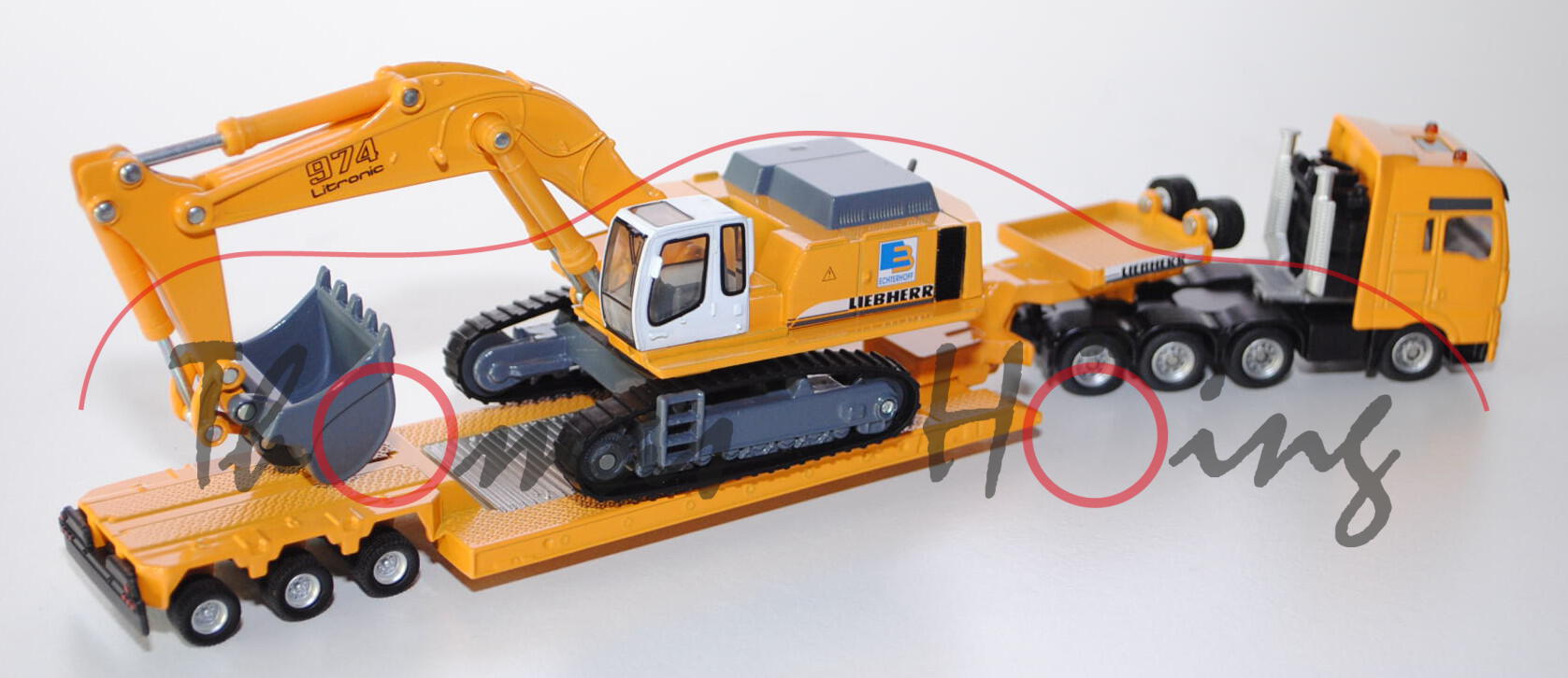 00001 MAN TGA 41.660 XXL 8x4/4 (Typ XXL-Fahrerhaus, mit Windleitbleche, mit Dachspoiler, Radstand 2600 + 1450 + 1400 mm, Modell 2003-2007) Schwerlast Sattelzugmaschine und 3-Achs-Tiefbett Sattelauflieger mit abnehmbarem Schwanenhals (Typ Tieflader mit gekröpftem Tiefbett, Schwanenhals abnehmbar) sowie Ladegut LIEBHERR Raupenbagger R 974 B Litronic® HD mit Monoblockausleger 7,20 m und Löffelstiel 3,80 m sowie Felstieflöffel für 5,2 m³ Inhalt (Typ Fahrerkabine ROPS, Motor: Liebherr D 9408TI-E, Radstand 4540 mm, Modell 2003-2007) (vgl. 1874), Sattelzugmaschine: liebherr gelb/schwarz, innen lichtgrau, Lenkrad integriert, Fahrerhaus liebherr gelb, Chassis und Radkästen schwarz, C27c / C28c geschlossen silber; Sattelauflieger: liebherr gelb, Druck LIEBHERR in schwarz auf reinweiß und eisengraue Streifen auf den seitlichen Bordwänden des Schwanenhalses, Ladefläche mittig silbergraumetallic, Tiefbettbrücke mit schwarzem Plastik-Unterfahrschutz, 87M2 silber; Raupenbagger: reinweiß/liebherr gelb/eisengrau, innen eisengrau, Druck 974 / Litronic in schwarz auf den Seiten des Monoblockauslegers, Druck Gefahrenzeichen und LIEBHERR in schwarz sowie reinweiß/eisengrauer Streifen auf den Seiten des Oberwagens, Druck 974 / LIEBHERR in schwarz und rot/weiße Baken hinten auf dem Oberwagen, zusätzlicher Druck EB / ECHTERHOFF-Logo in verkehrsblau/liebherr gelb auf reinweiß auf den Seiten des Oberwagens und hinten auf den Ecken des Oberwagens, Fahrerhaus reinweiß, Oberwagen liebherr gelb, Monoblockausleger und Löffelstiel liebherr gelb, Motorabdeckung eisengrau, Unterwagen eisengrau, Verglasung klar, Raupen schwarz, SIKU SUPER 1:87, ca. 1:87, L17mpK (EAN 4006874018475)