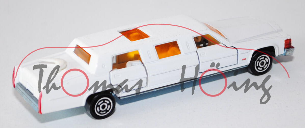 Cadillac Stretchlimousine (Club Limo), reinweiß, Nummernschild hinten FLORIDA / 087JPH, Vorder- und Hintertüren sowie Schiebedach zu öffnen, majorette, 1:58, mb (Schachtel ist geöffnet)